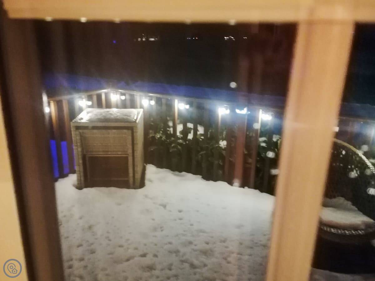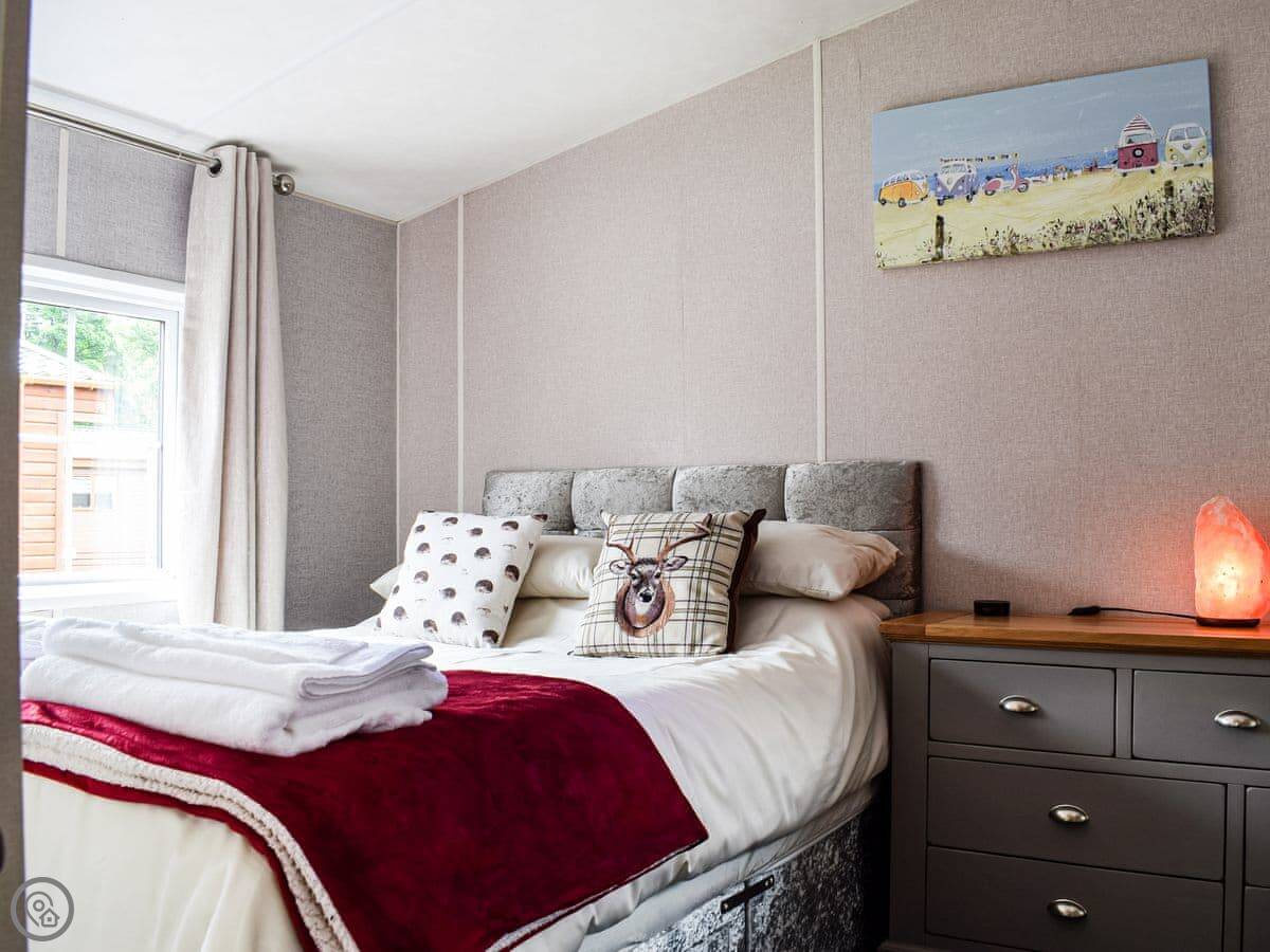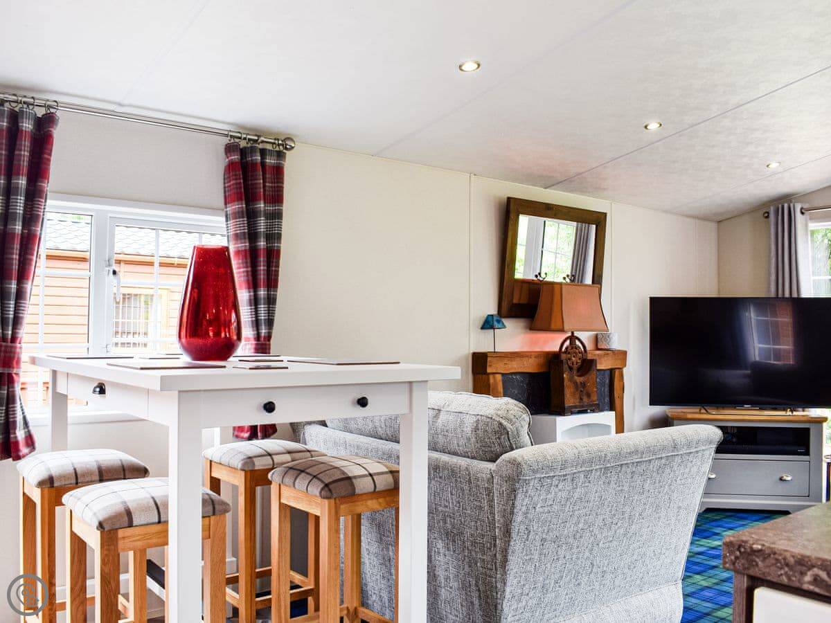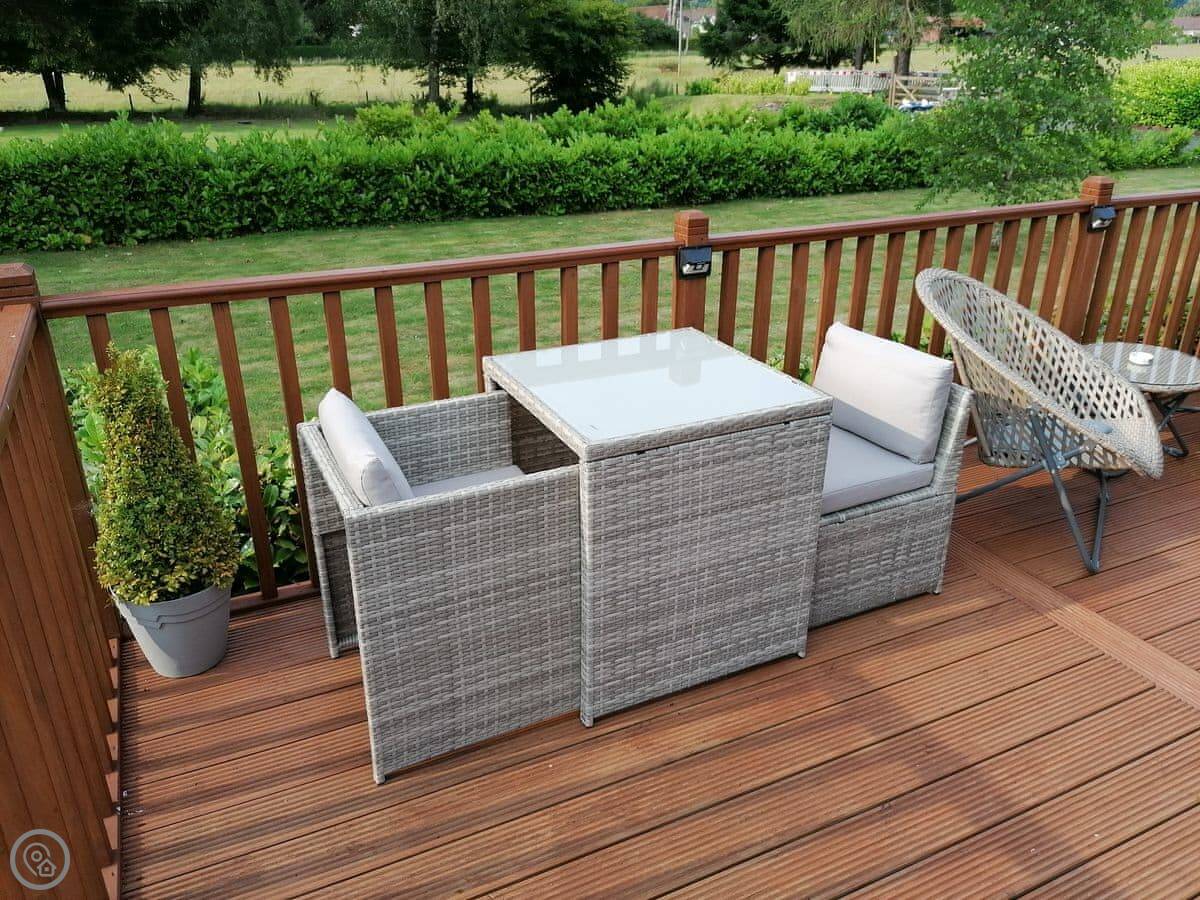 Salmon Leap Lodge is just outside Dollar, in Clackmannanshire. It's a detached lodge, all on one level. You get your own decking and a bit of lawn out the front, which looks out towards the Ochil Hills. You can hear the River Devon from the garden.