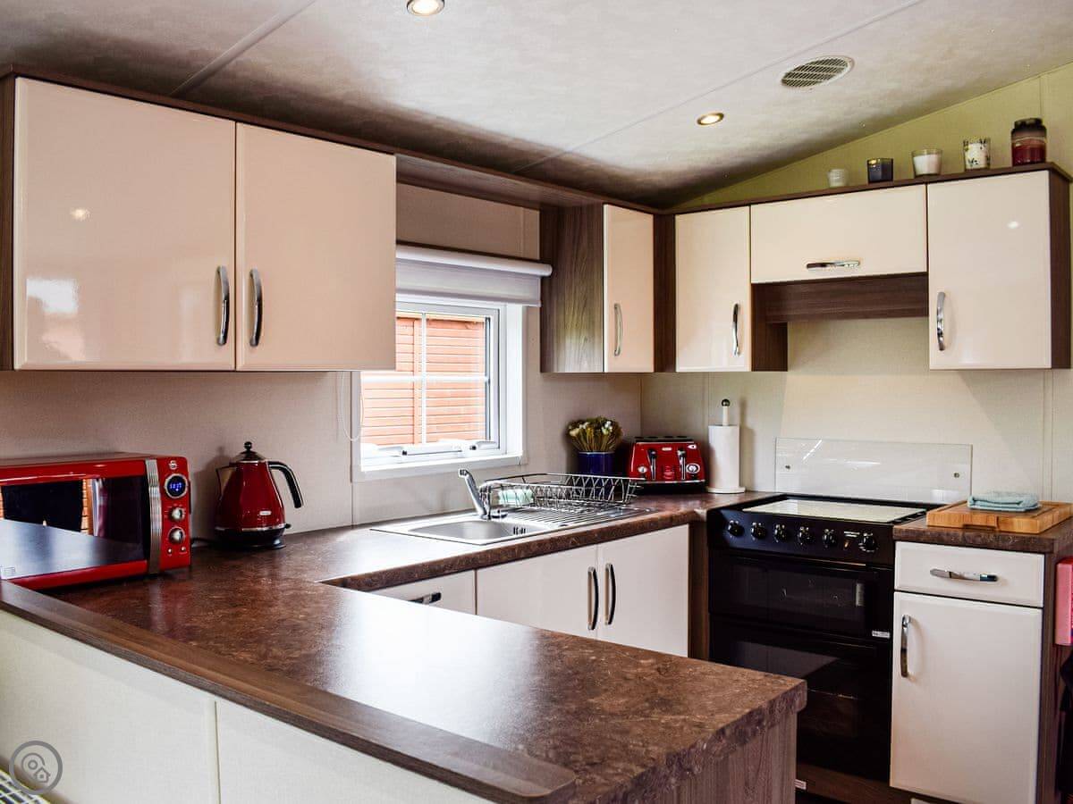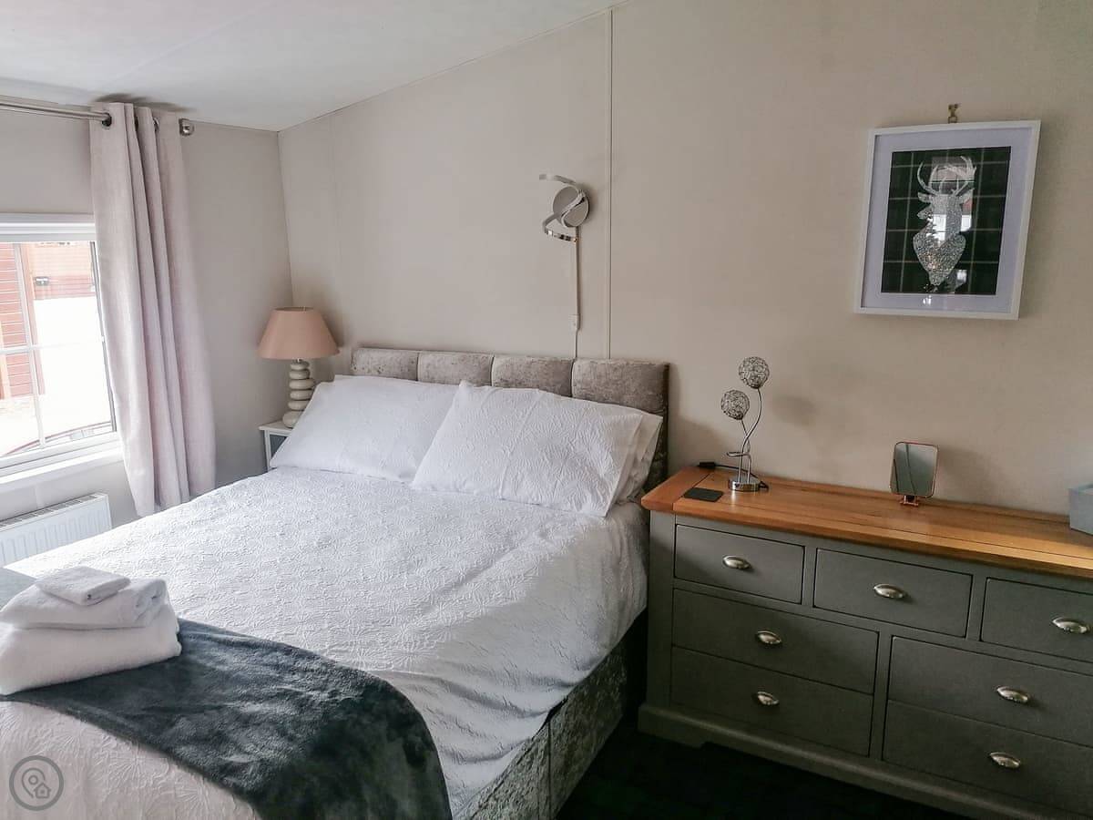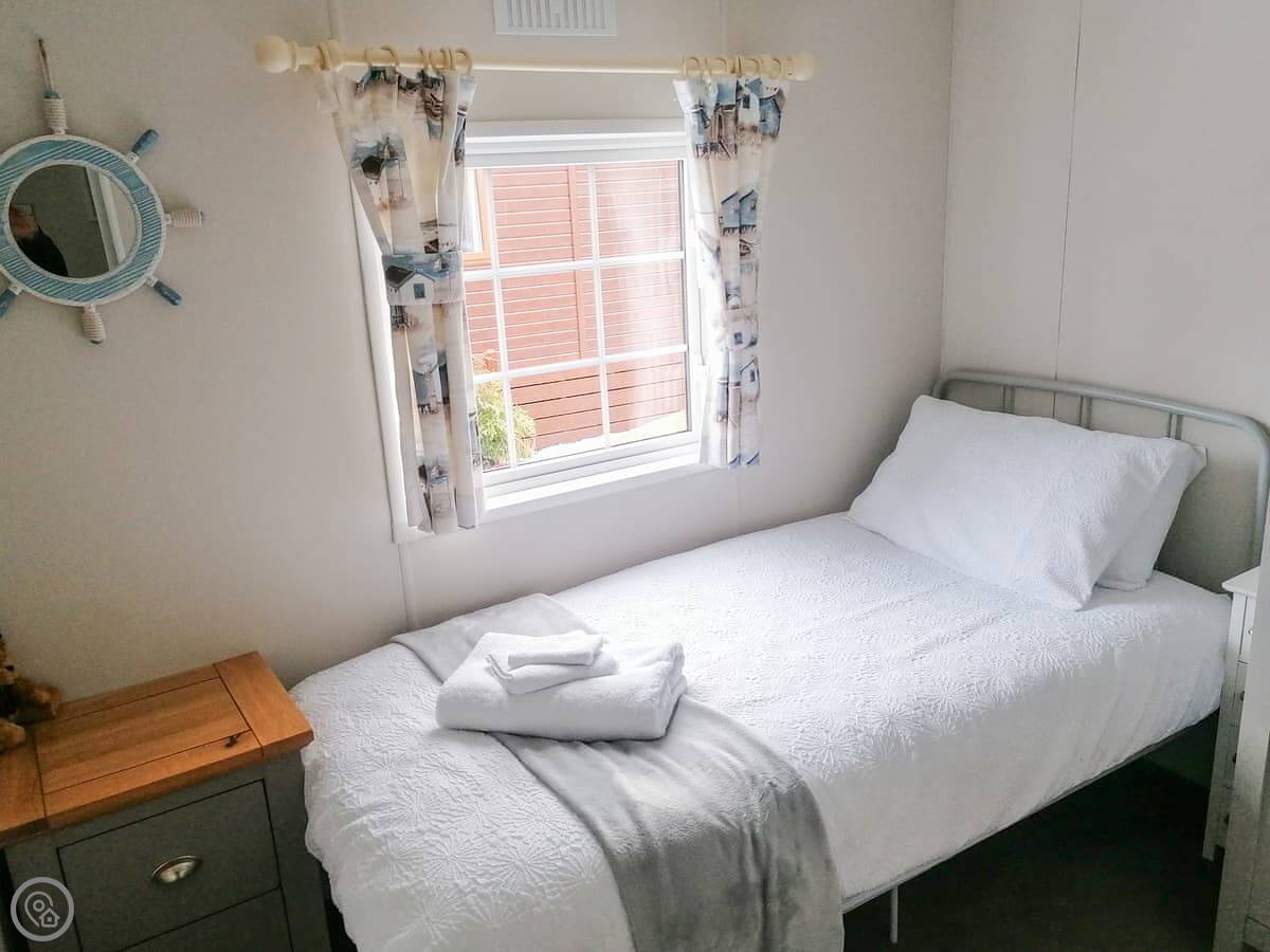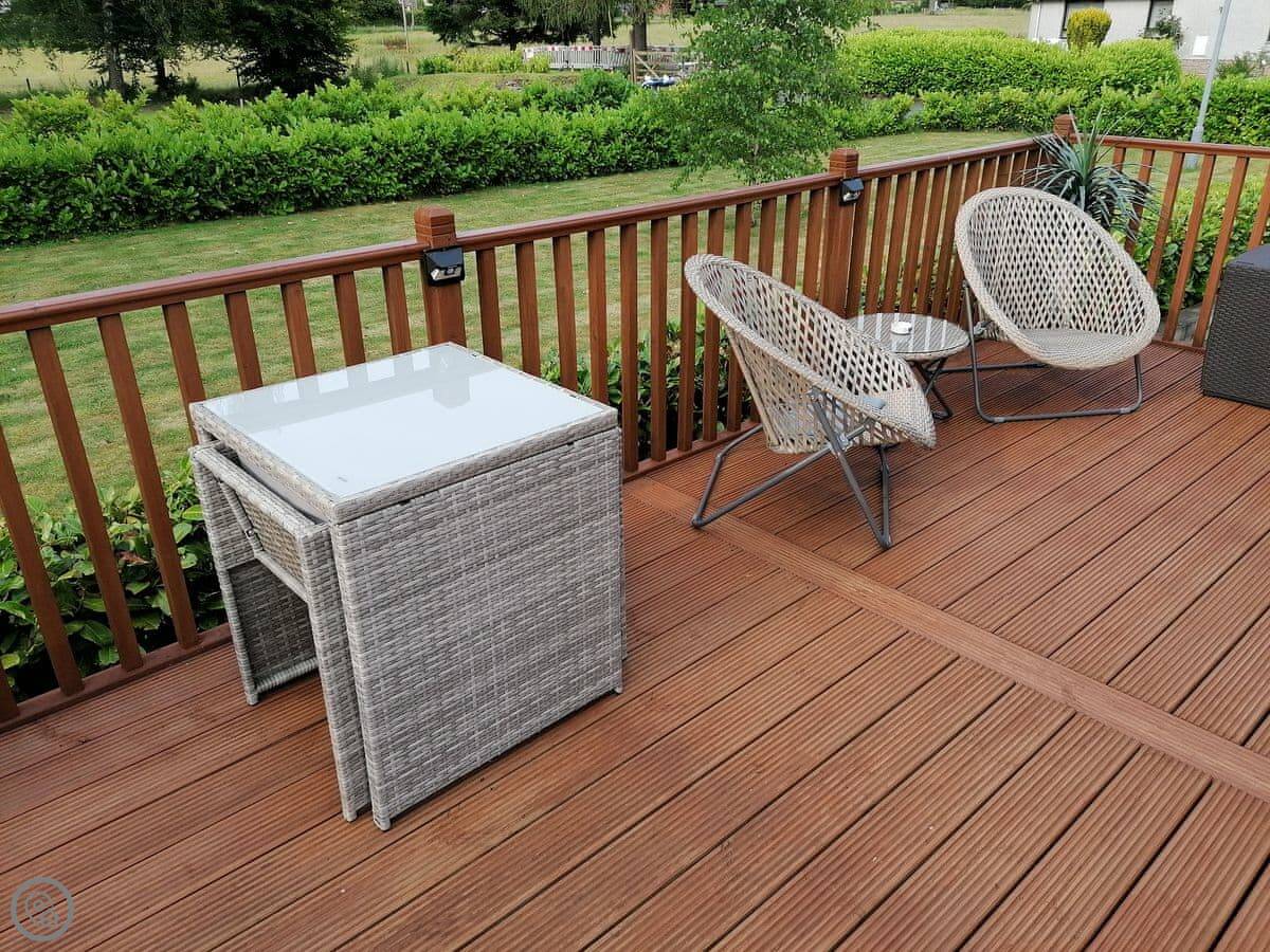 It sleeps three, in two bedrooms. There's one shower room. It's got a 4 Star rating. It's clean and comfortable. The living area is open plan with French doors onto the deck.
