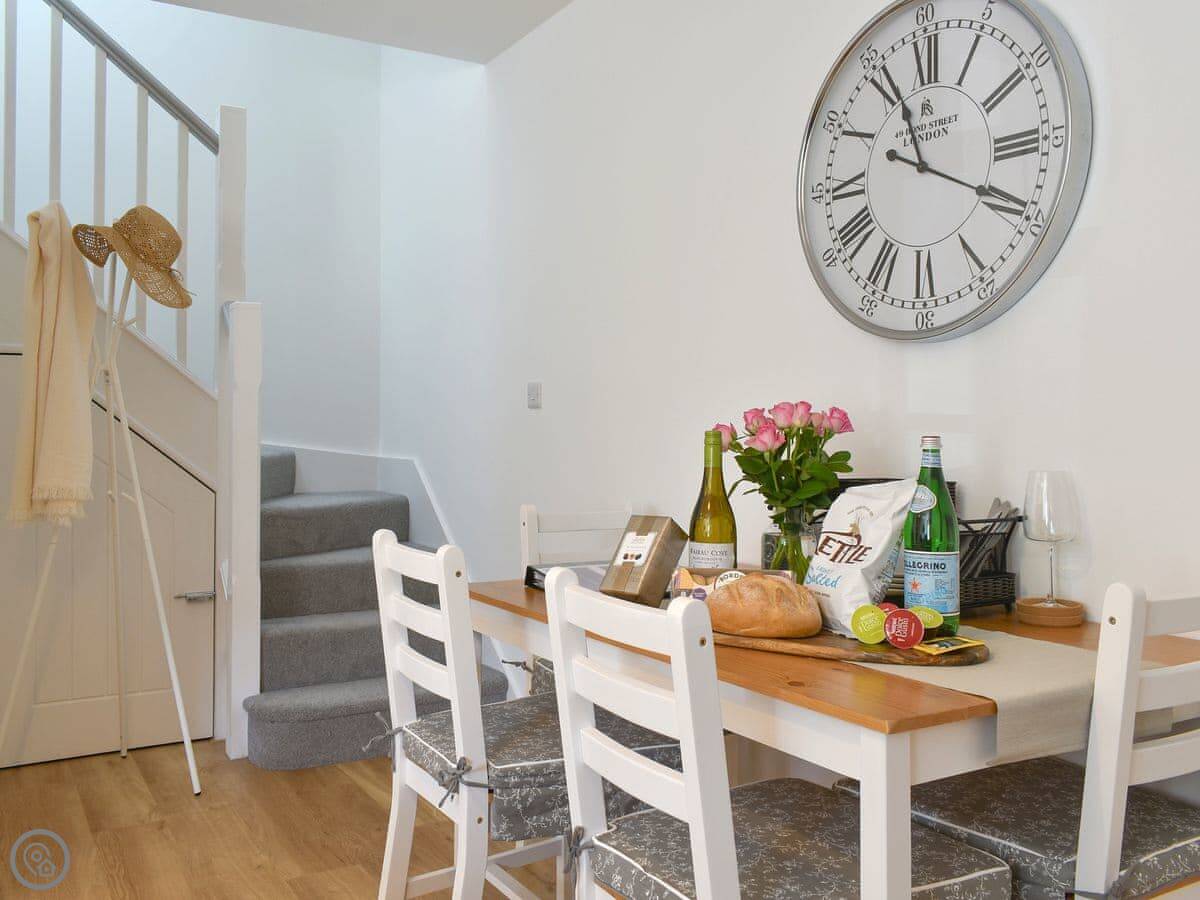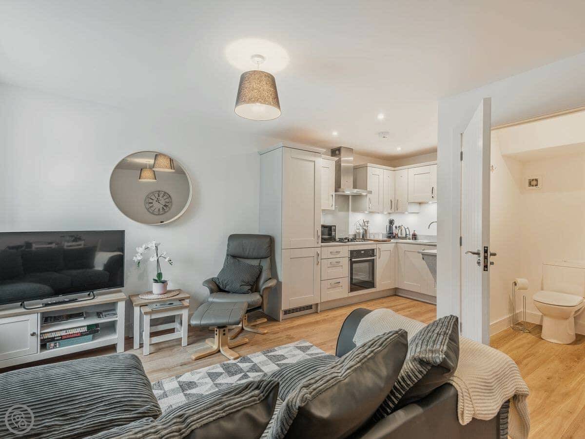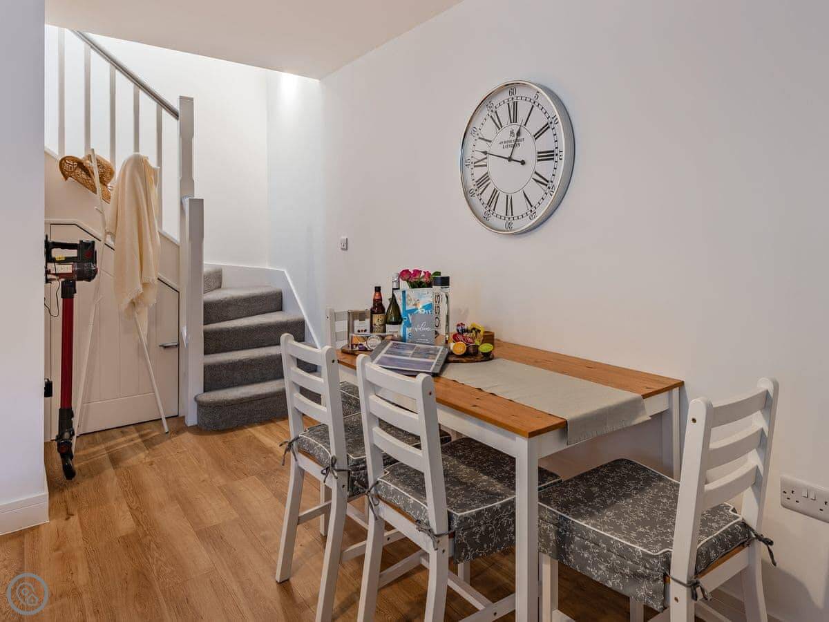 It sleeps four. Two bedrooms upstairs, one king and one double. Both have TVs. There’s one family bathroom with a shower over the bath. Downstairs is all open plan: kitchen, living room, dining area. There’s a downstairs loo too. The kitchen has what you’d need. Underfloor heating on the ground floor.