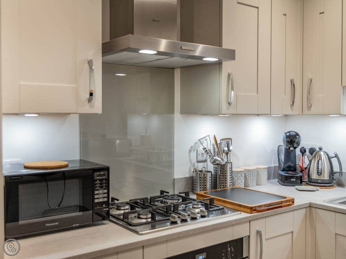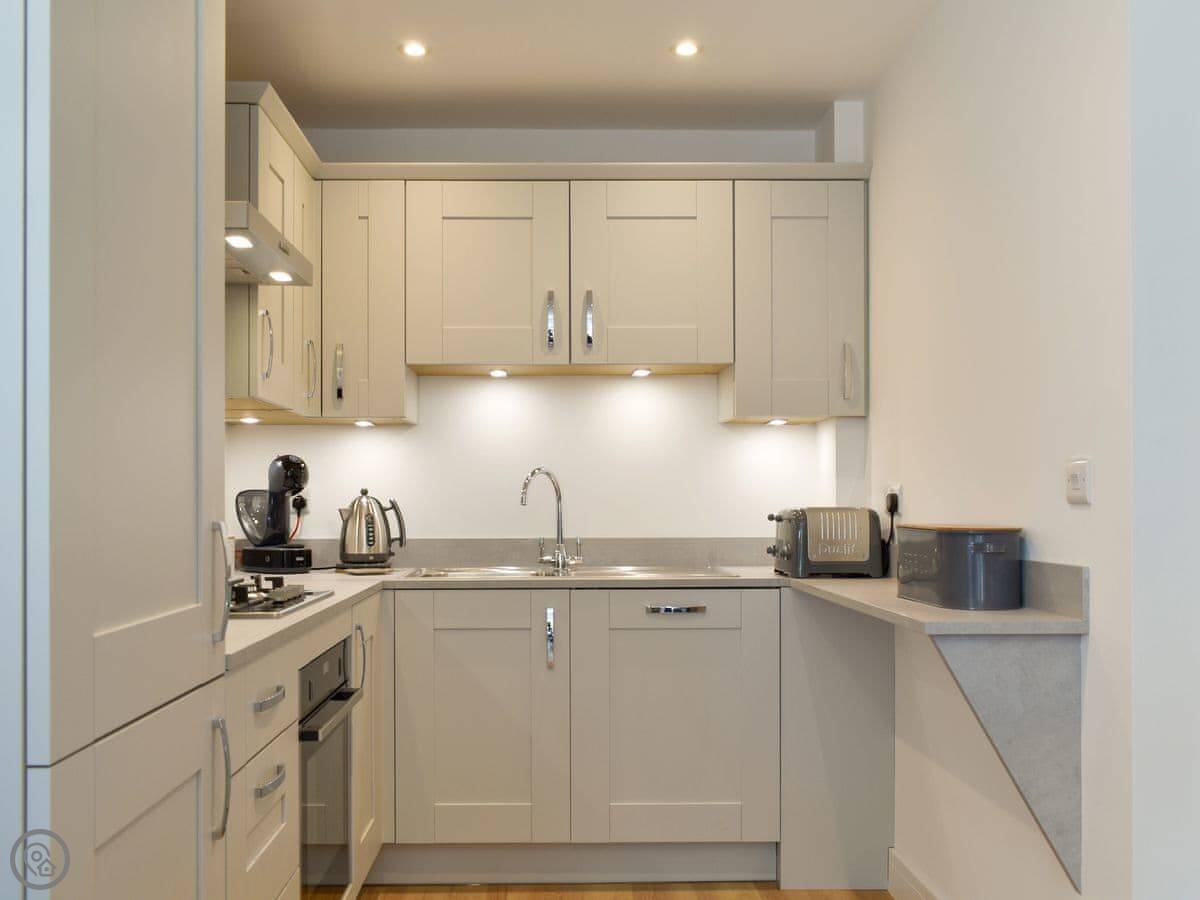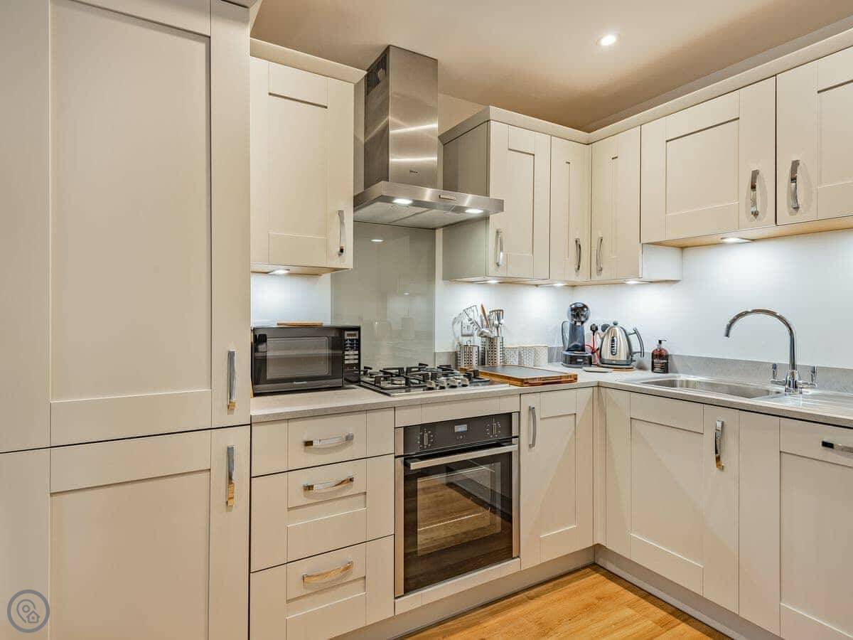 It sleeps four. Two bedrooms upstairs, one king and one double. Both have TVs. There’s one family bathroom with a shower over the bath. Downstairs is all open plan: kitchen, living room, dining area. There’s a downstairs loo too. The kitchen has what you’d need. Underfloor heating on the ground floor.
