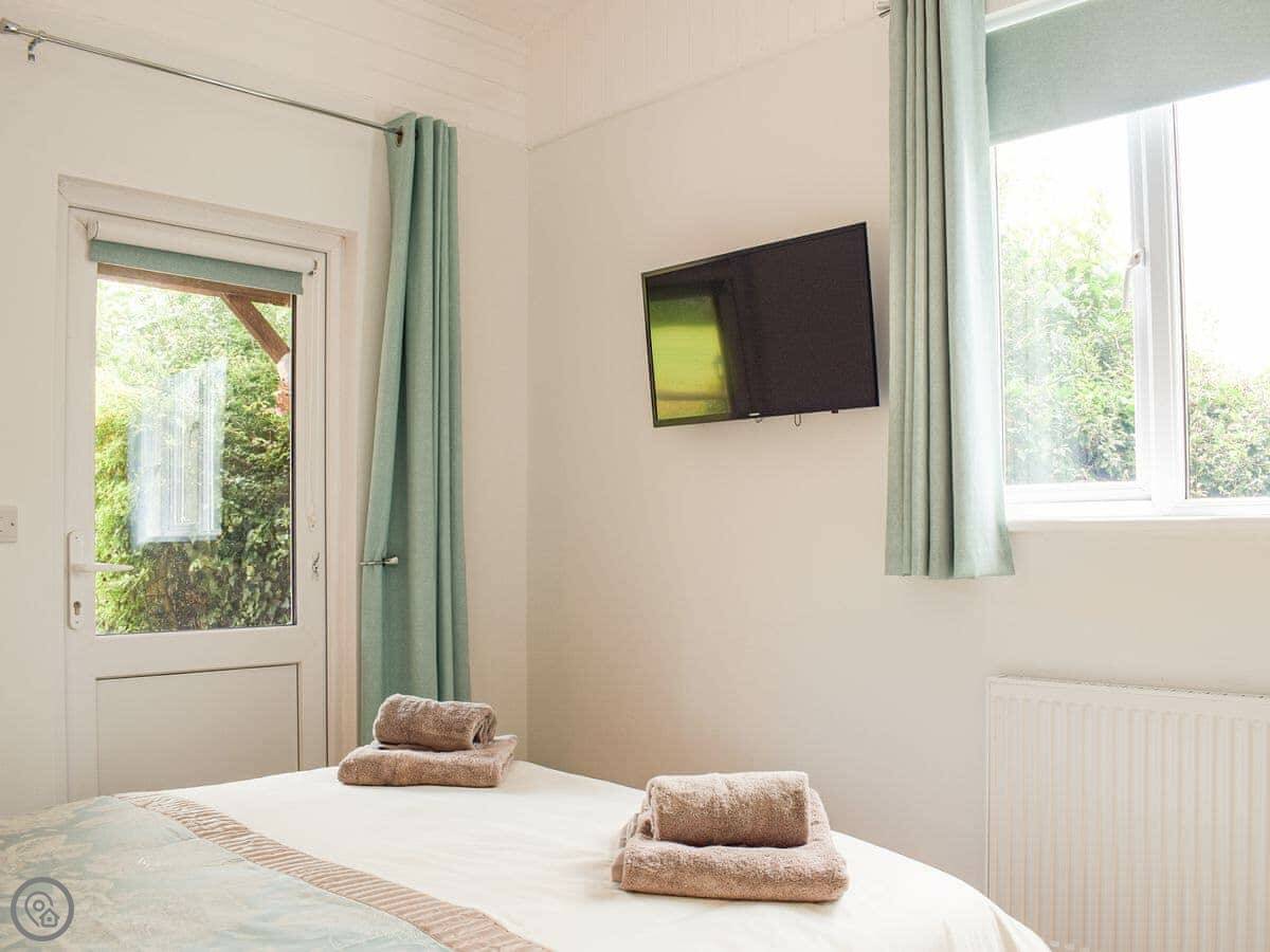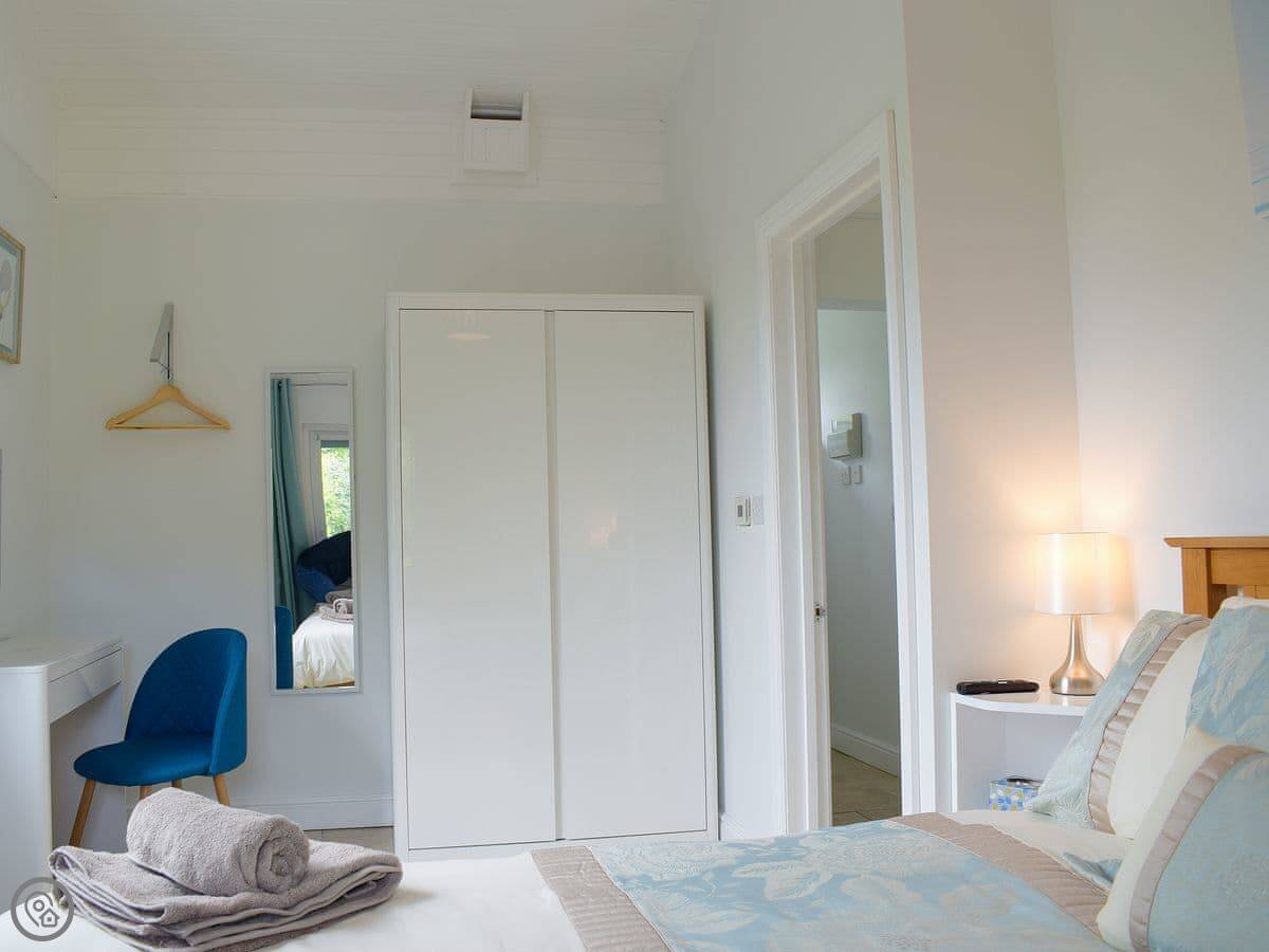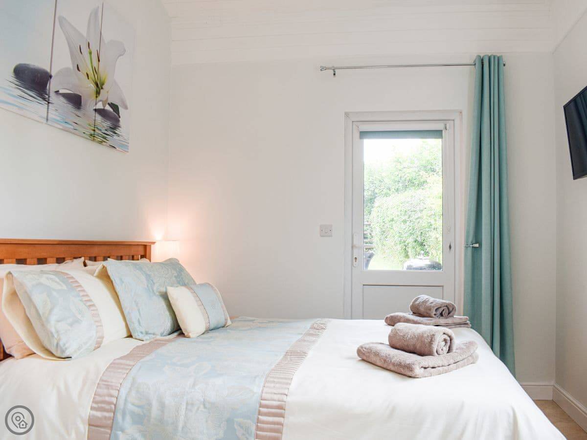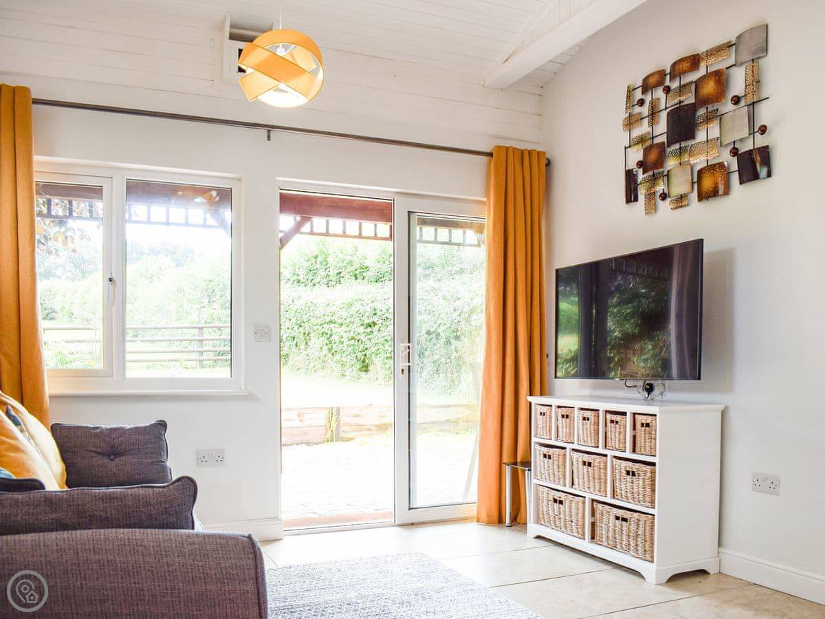 It's for two people. One bedroom with a kingsize bed, one shower room. It's all on the ground floor. It has a 4 Star rating, so it's comfortable and well-equipped. Everything is open plan: kitchen, dining area, and sitting area together. Patio doors open straight out to your garden.
