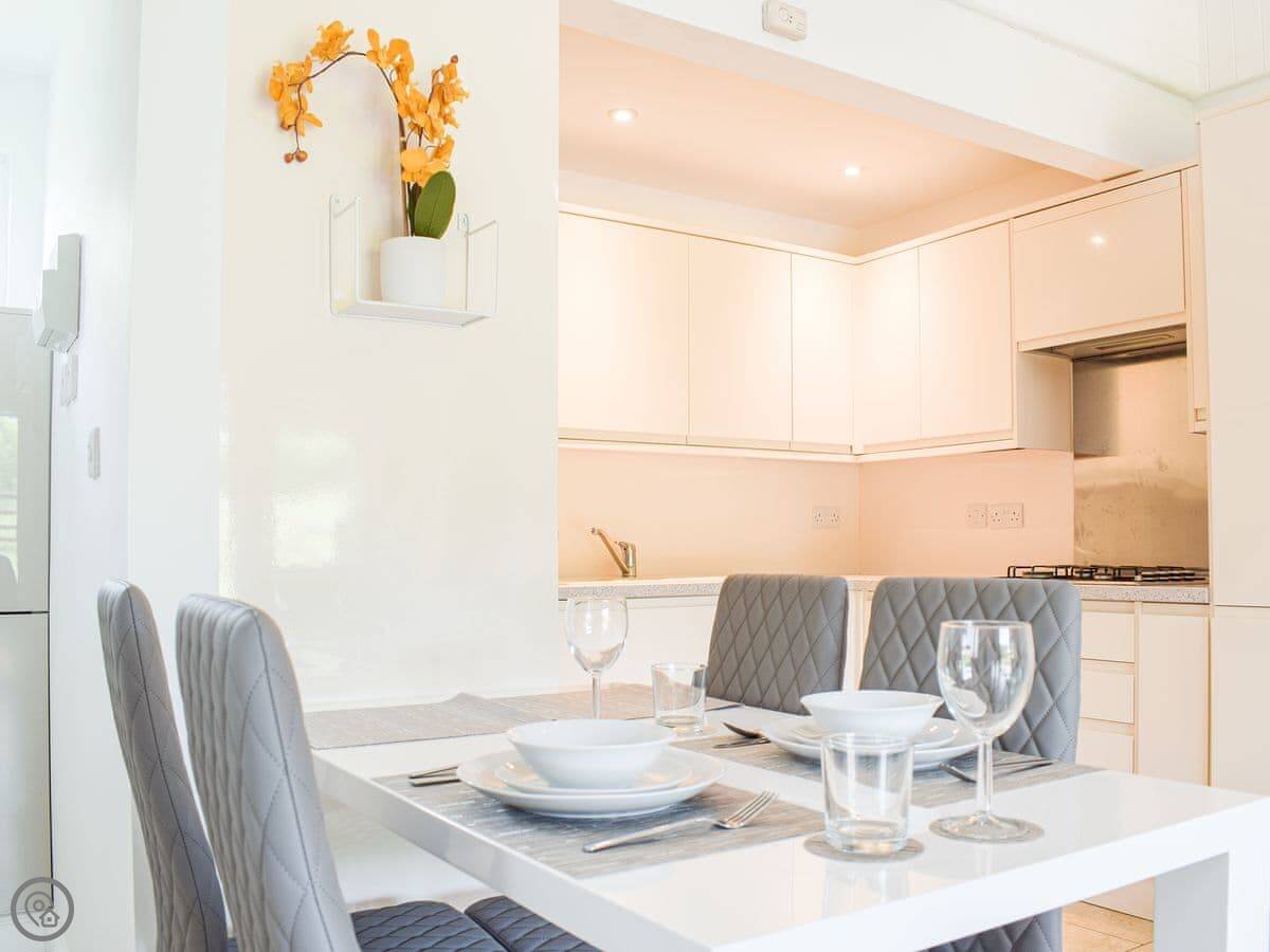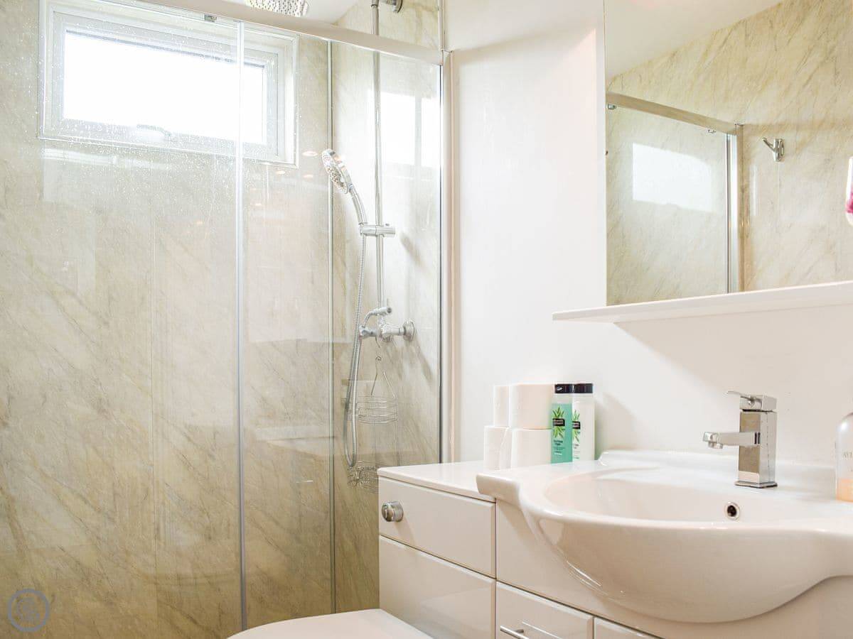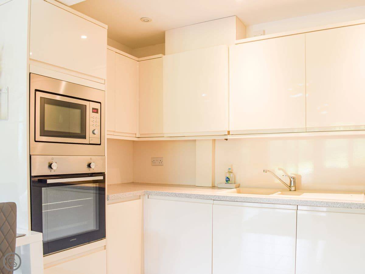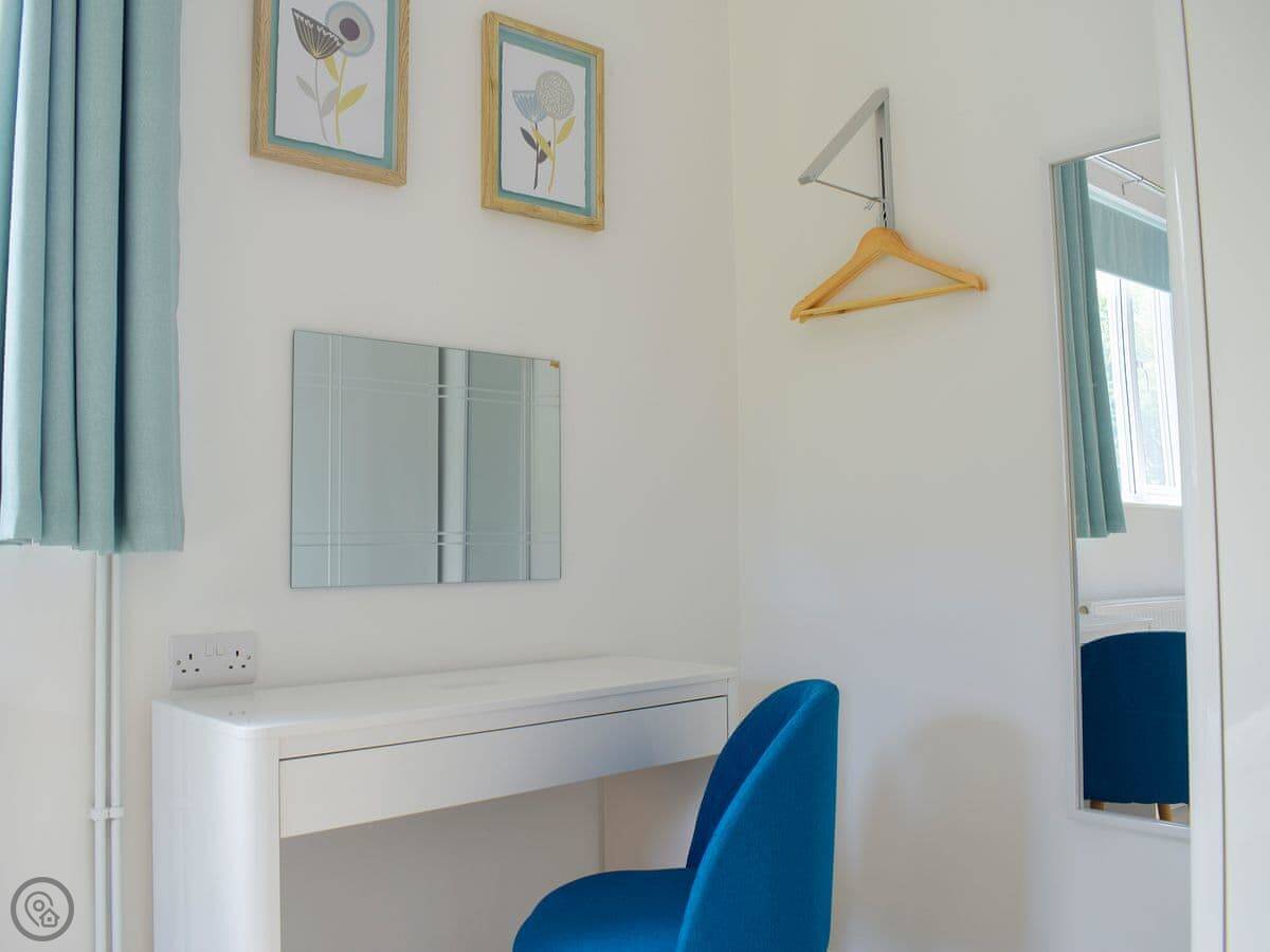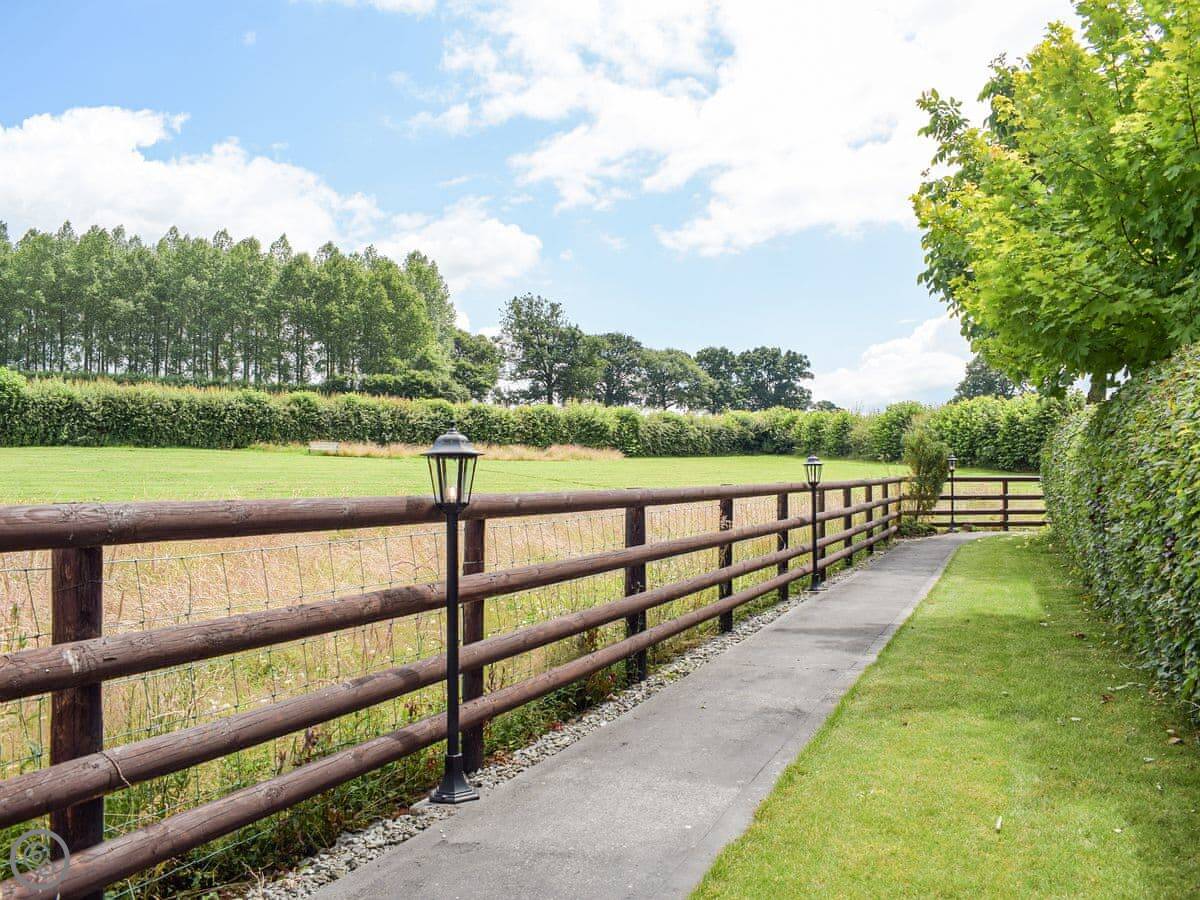 It's for two people. One bedroom with a kingsize bed, one shower room. It's all on the ground floor. It has a 4 Star rating, so it's comfortable and well-equipped. Everything is open plan: kitchen, dining area, and sitting area together. Patio doors open straight out to your garden.