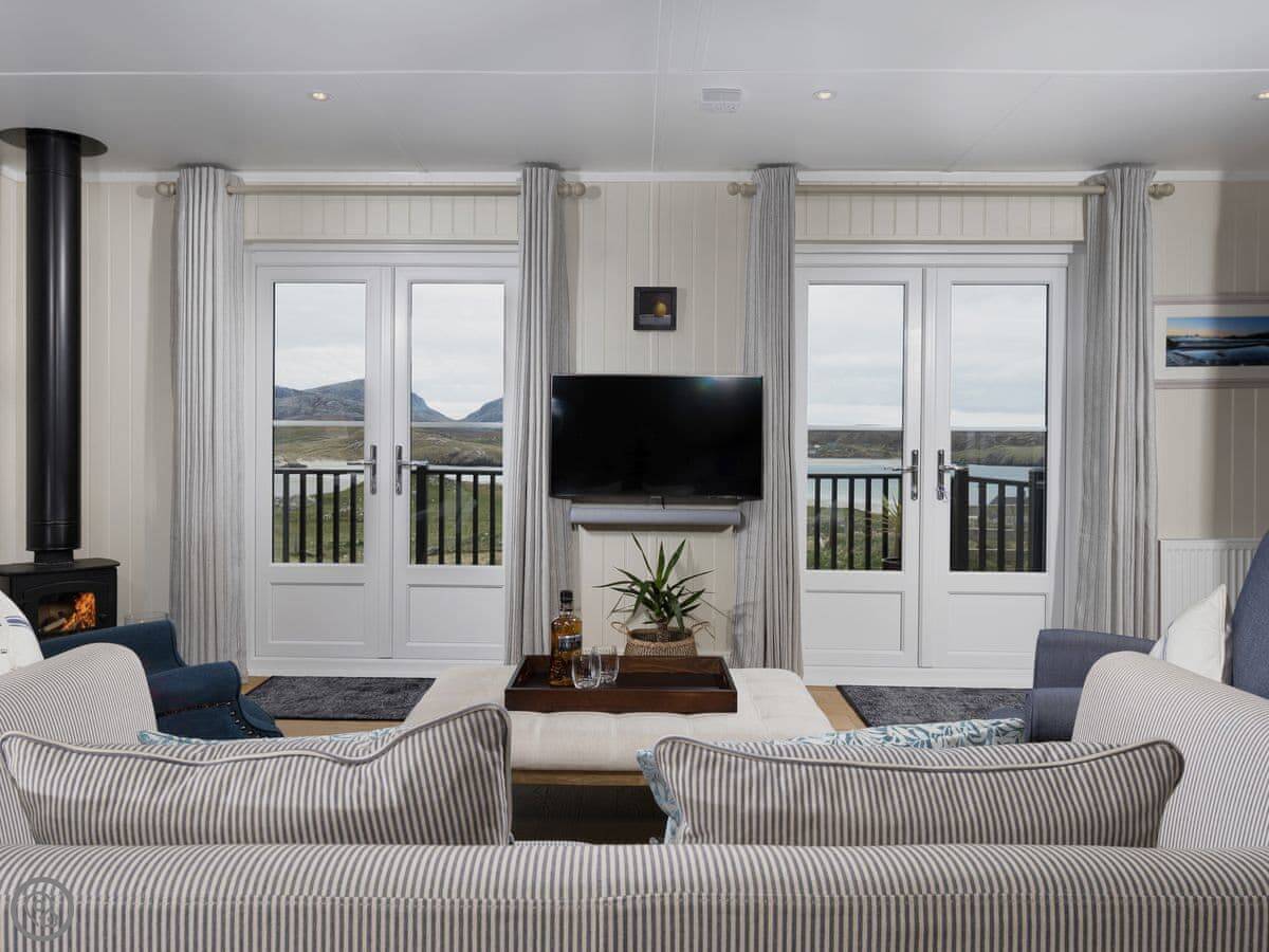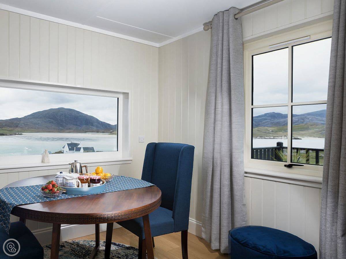 Entering the property you’ll fall for the place even more. Stylish with classic taste and luxurious throughout. The living/kitchen enjoys a wood burner and patio doors out to decking that overlooks the sands. There’s a separate dining room that again enjoys spectacular views of sands and hills. The bedroom is a lovely space and enjoys an en-suite shower room. There is also another bathroom with a bath.