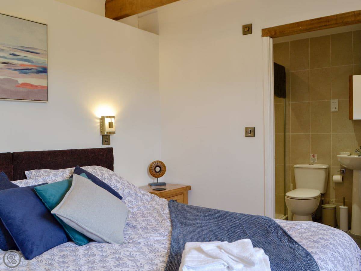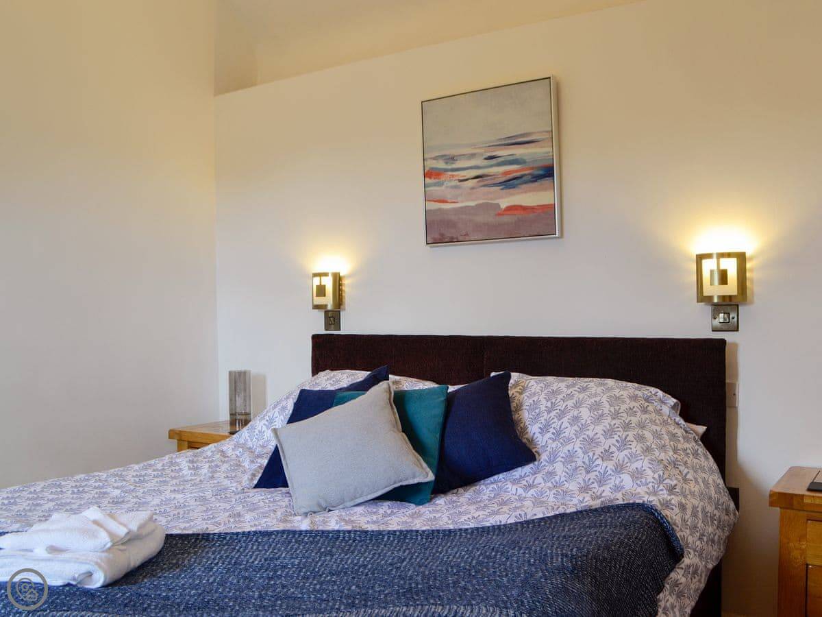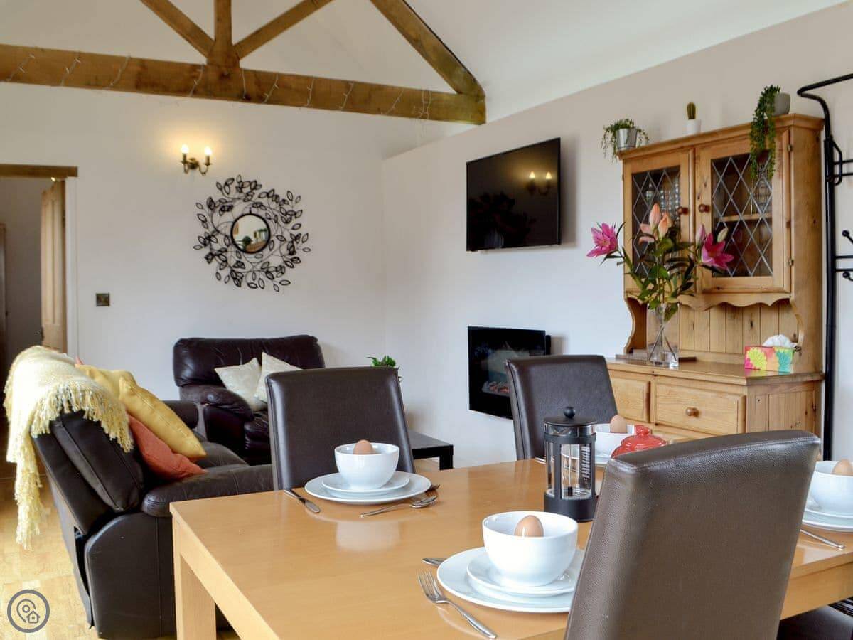 It sleeps four. Two bedrooms, both with their own shower room. One bedroom has a super king bed that can be split into twins. It's got a 4 Star rating. It's all on the ground floor, with underfloor heating. The living area is open plan, with a kitchen, dining space, and a sitting area with a smart TV.