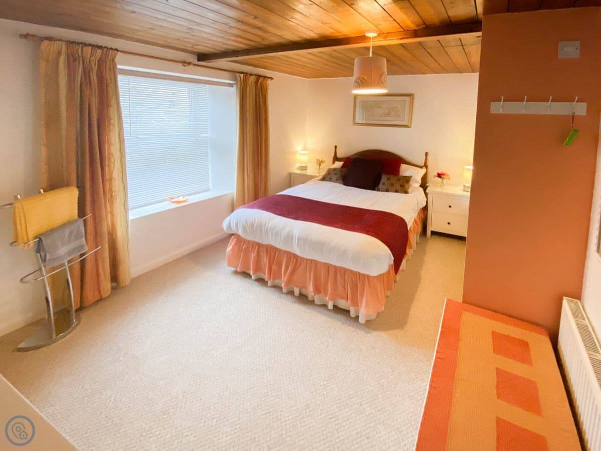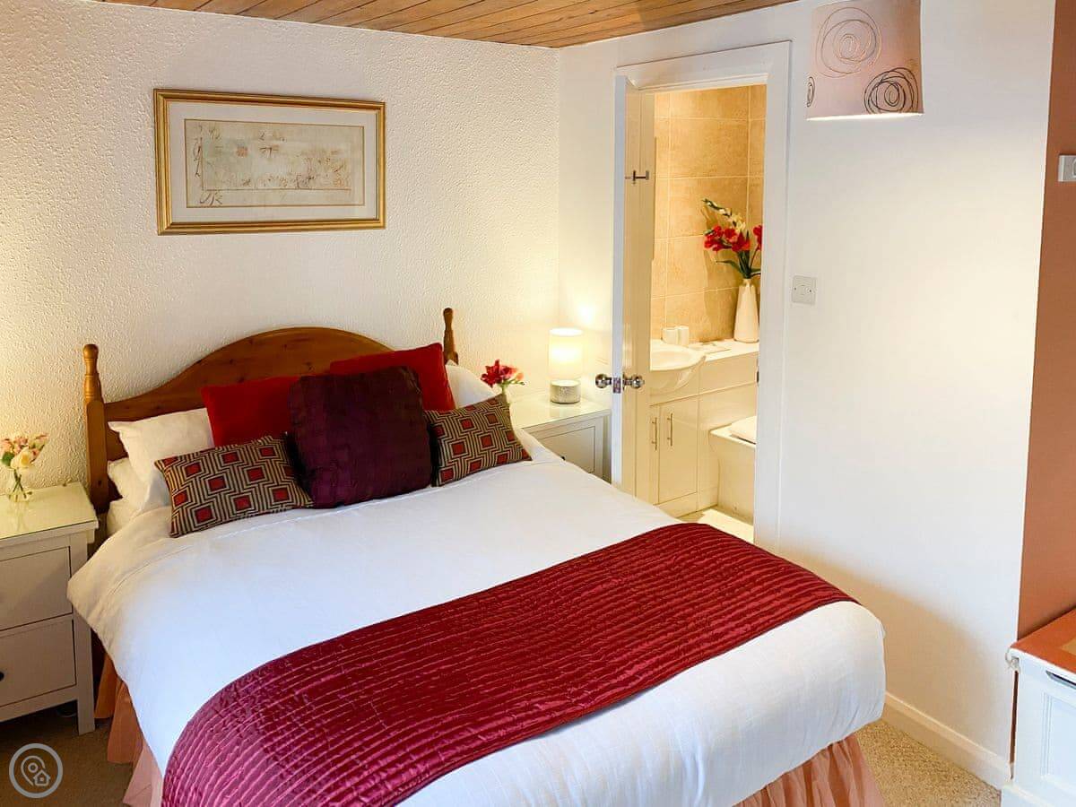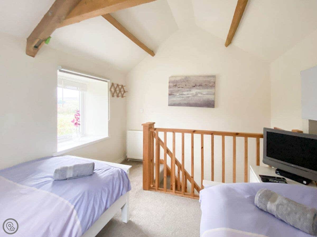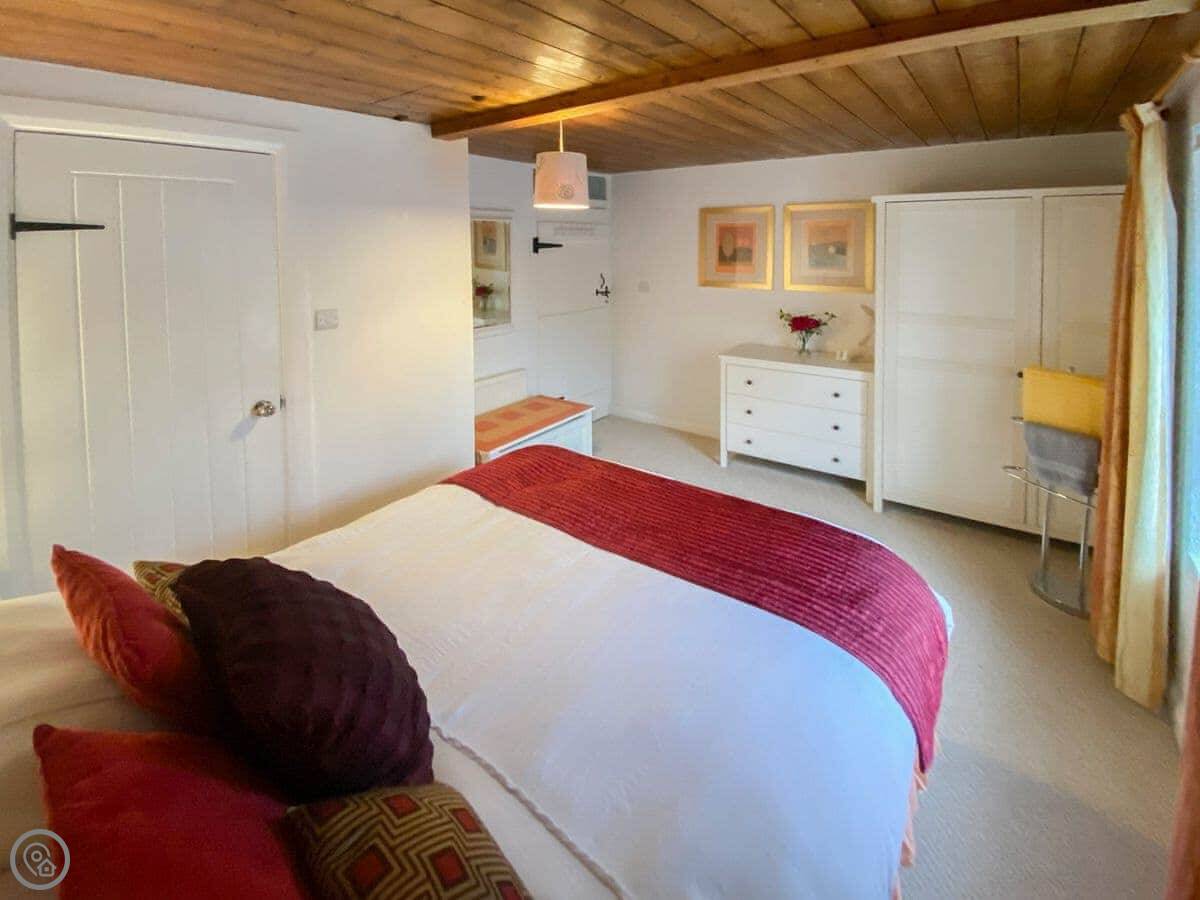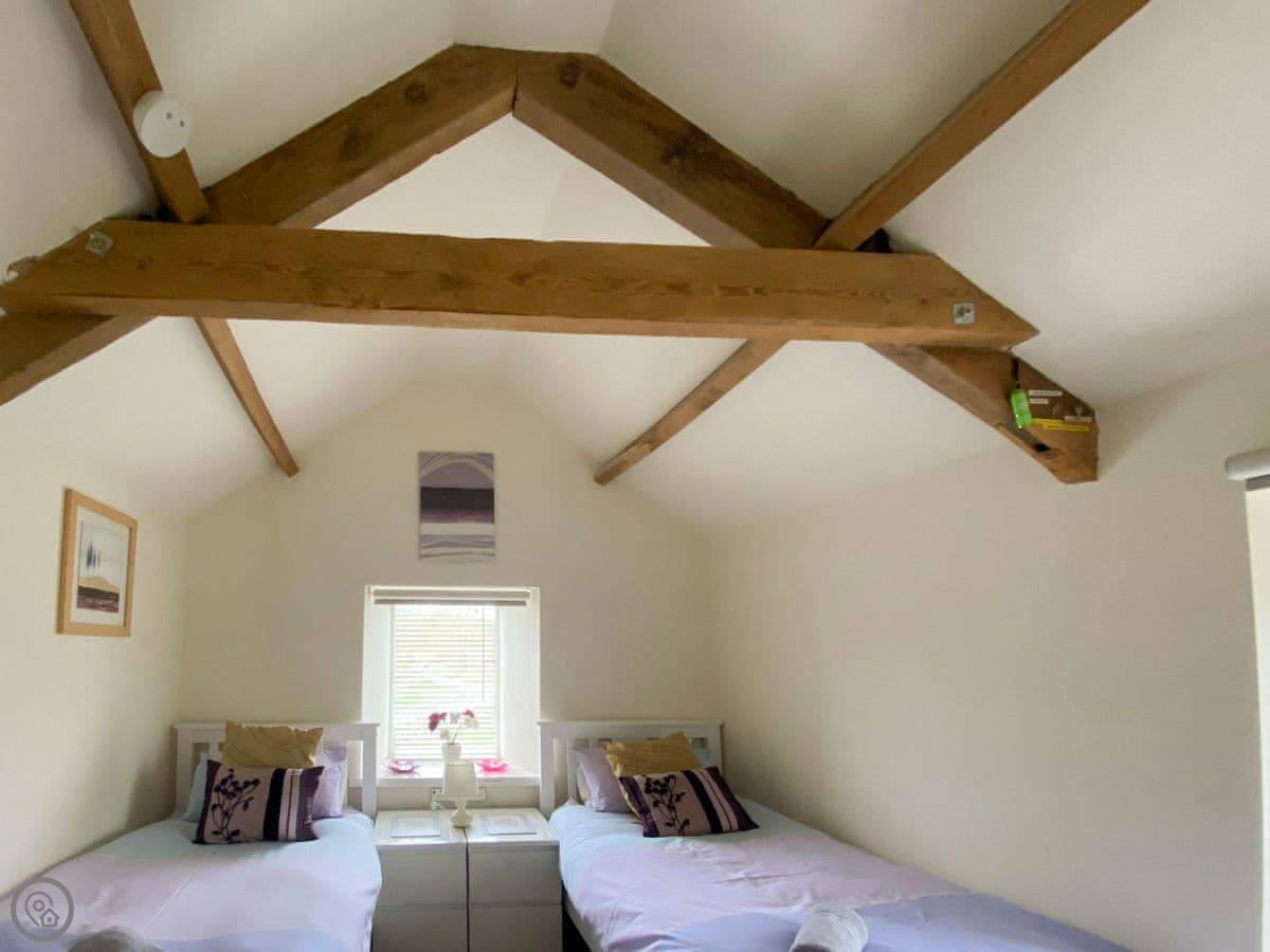 It sleeps six in three bedrooms. There are two bathrooms, one is an en-suite. The third bedroom is in a linked barn across a little porch. That barn room has twin beds and its own bathroom. It's fine for older kids or another couple, but it's separate from the main cottage bedrooms, so maybe not for very young children on their own.