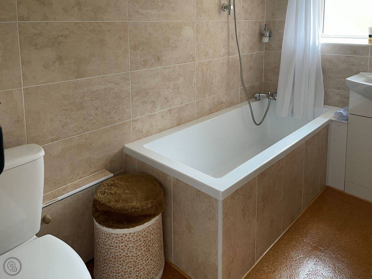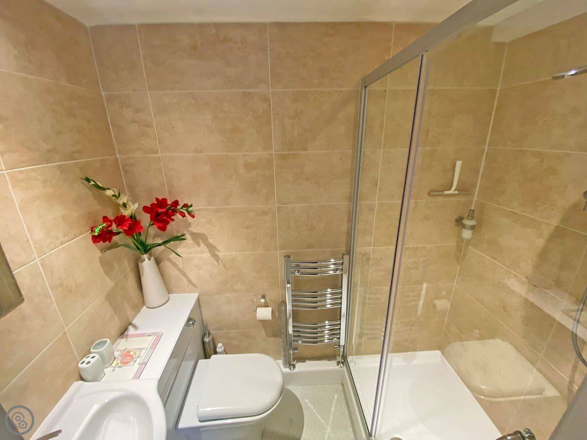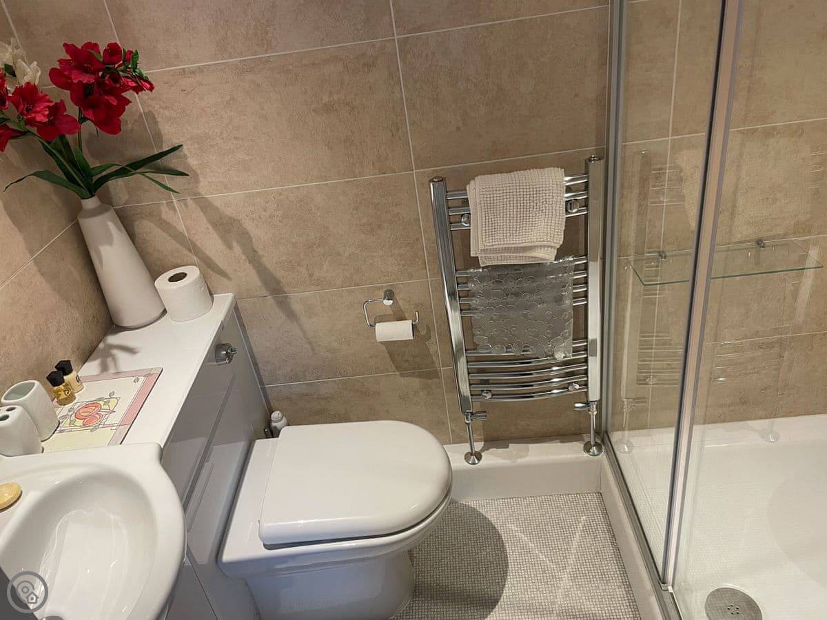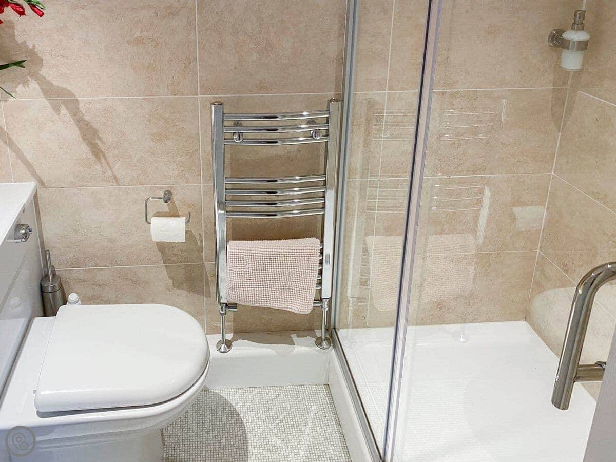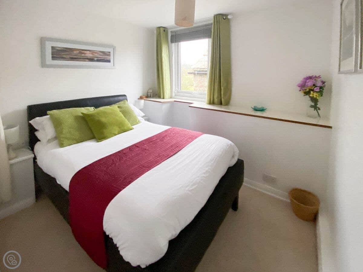 It sleeps six in three bedrooms. There are two bathrooms, one is an en-suite. The third bedroom is in a linked barn across a little porch. That barn room has twin beds and its own bathroom. It's fine for older kids or another couple, but it's separate from the main cottage bedrooms, so maybe not for very young children on their own.