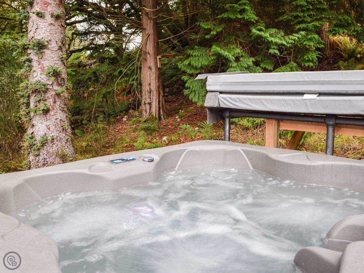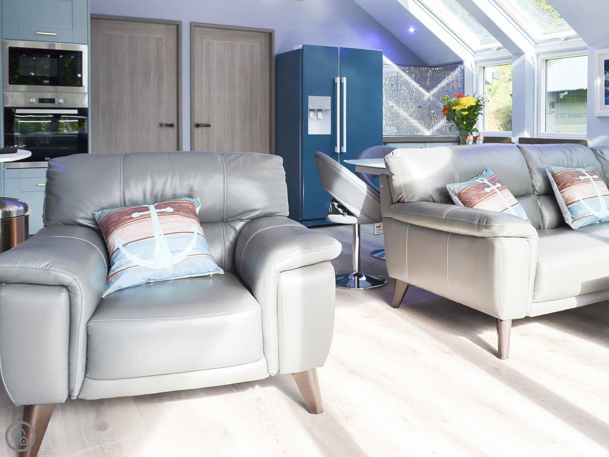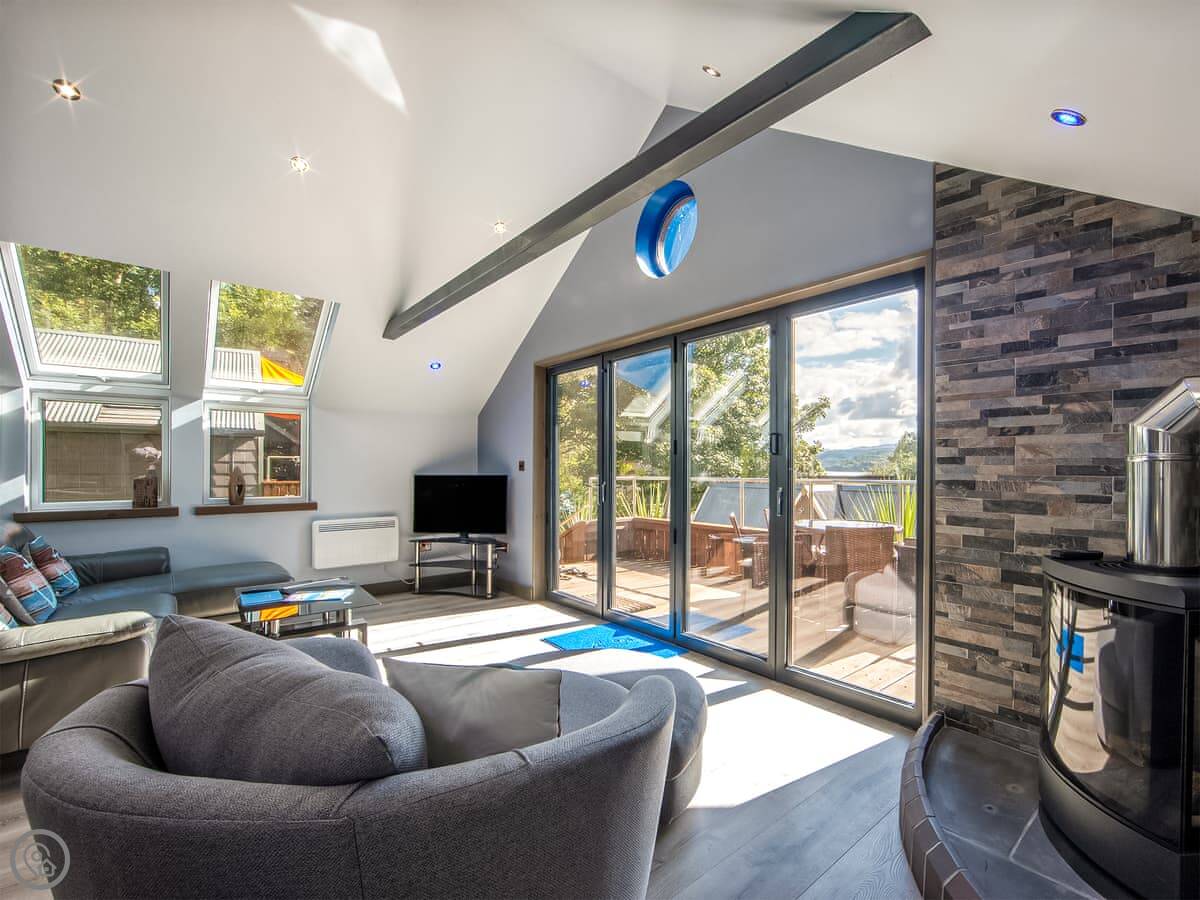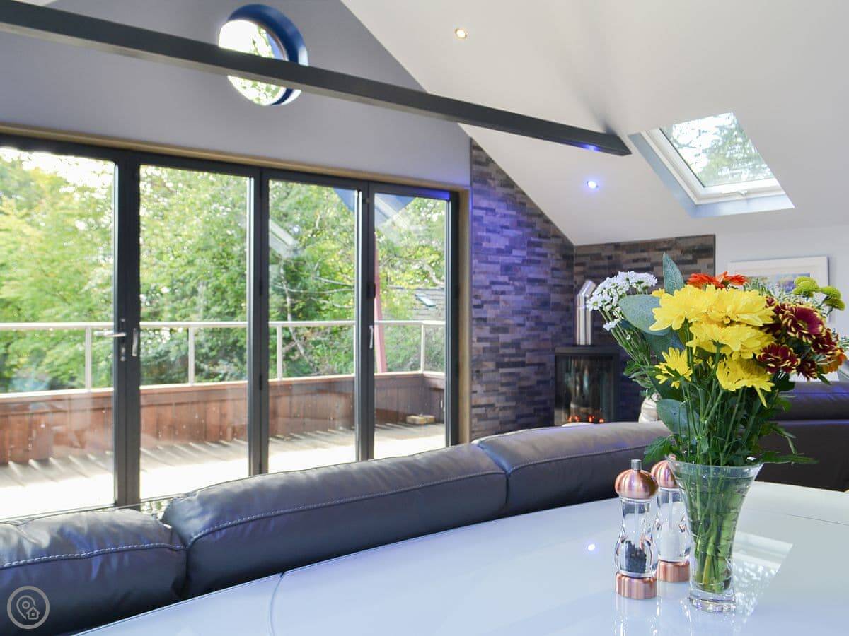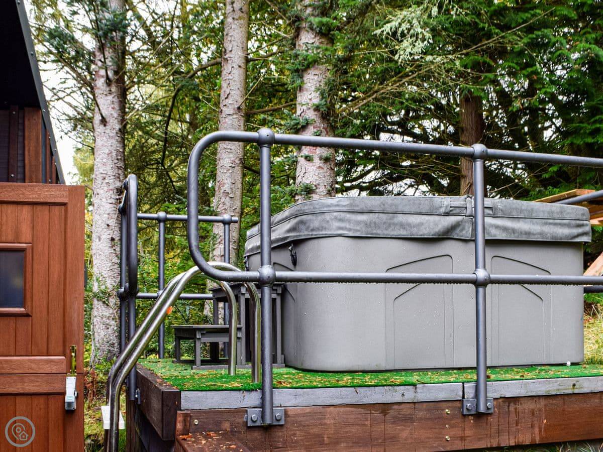 There's a big open plan living area with a kitchen and a sofa. Glazed doors open onto the deck. You get a barbecue and the private hot tub is out the back.