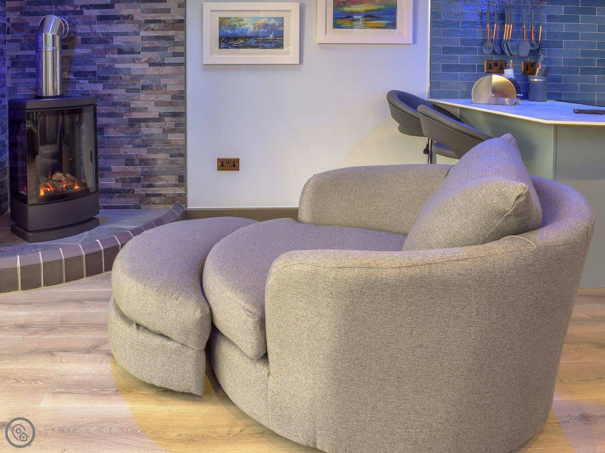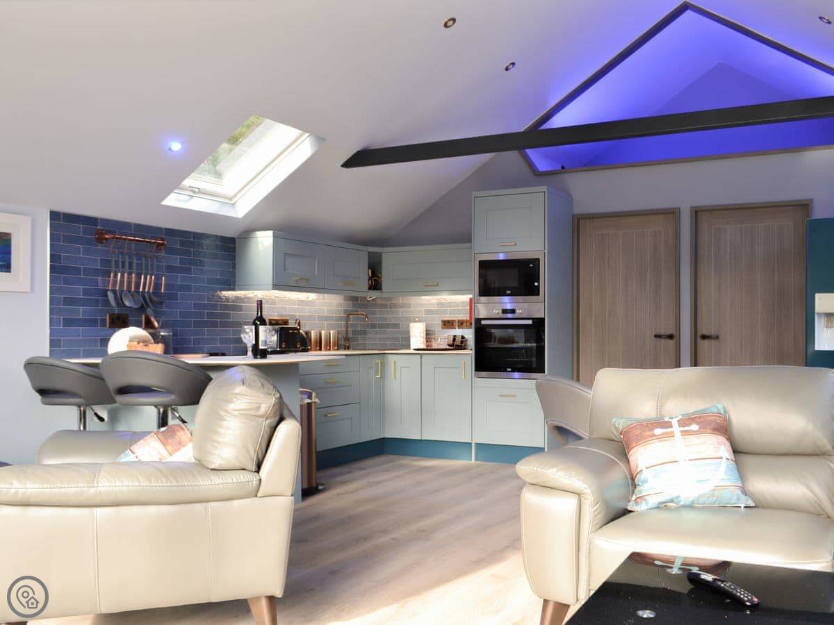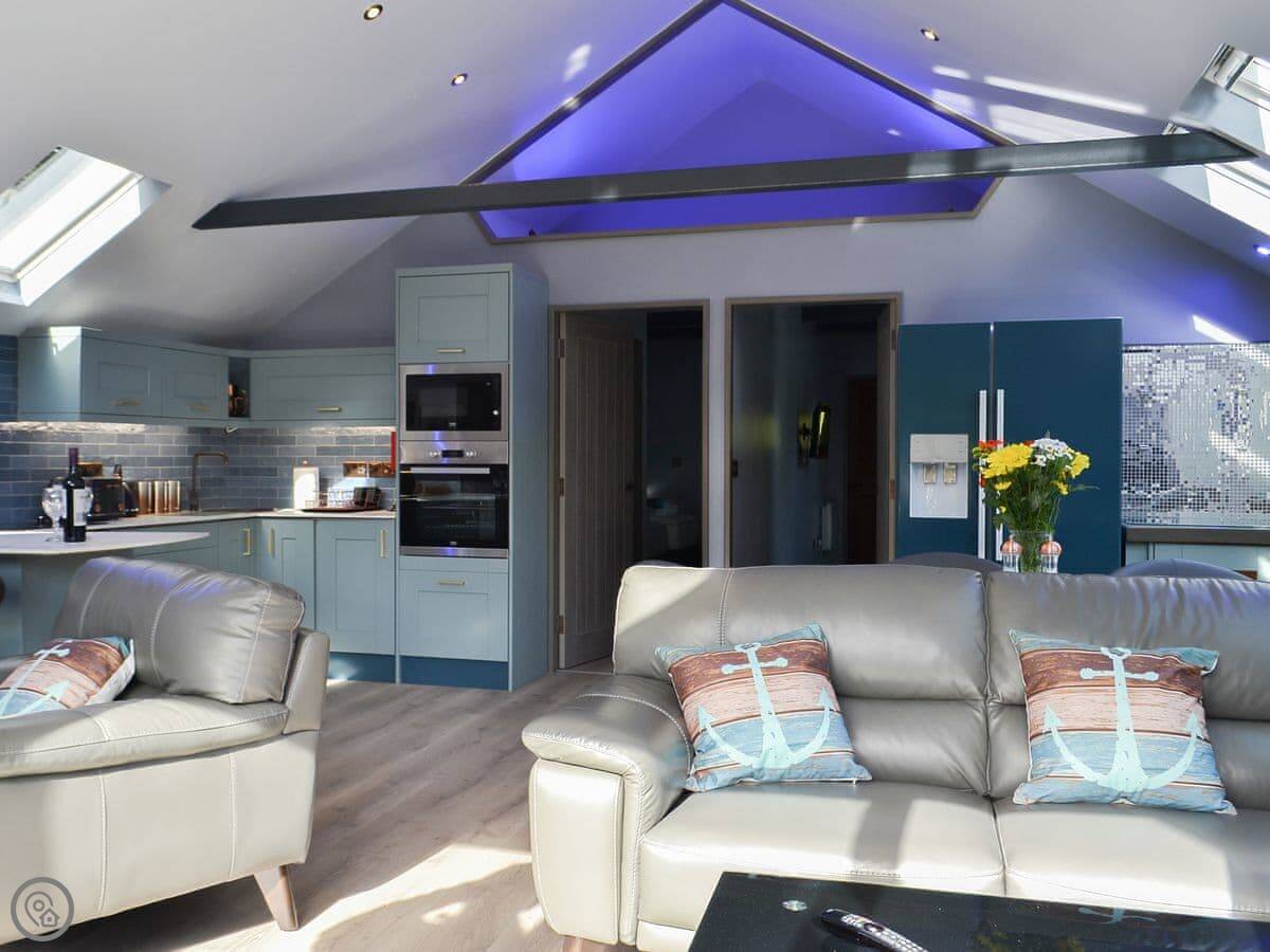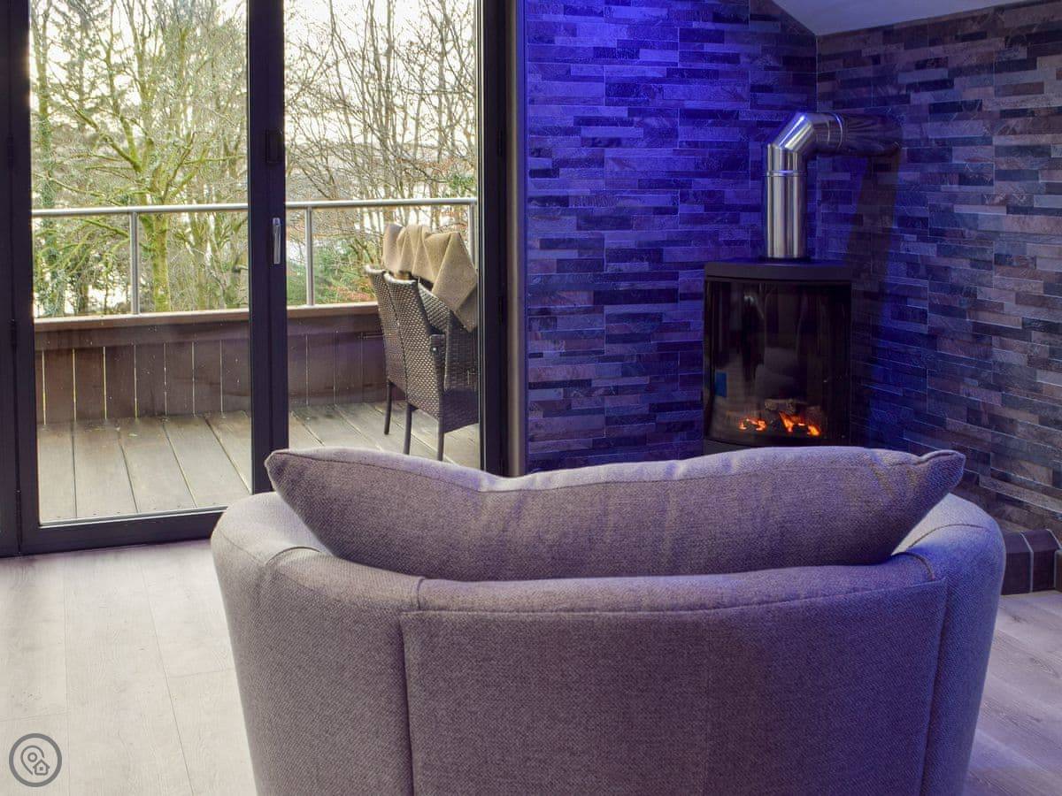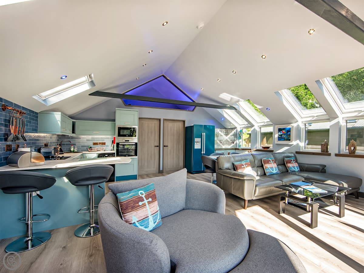 There's a big open plan living area with a kitchen and a sofa. Glazed doors open onto the deck. You get a barbecue and the private hot tub is out the back.
