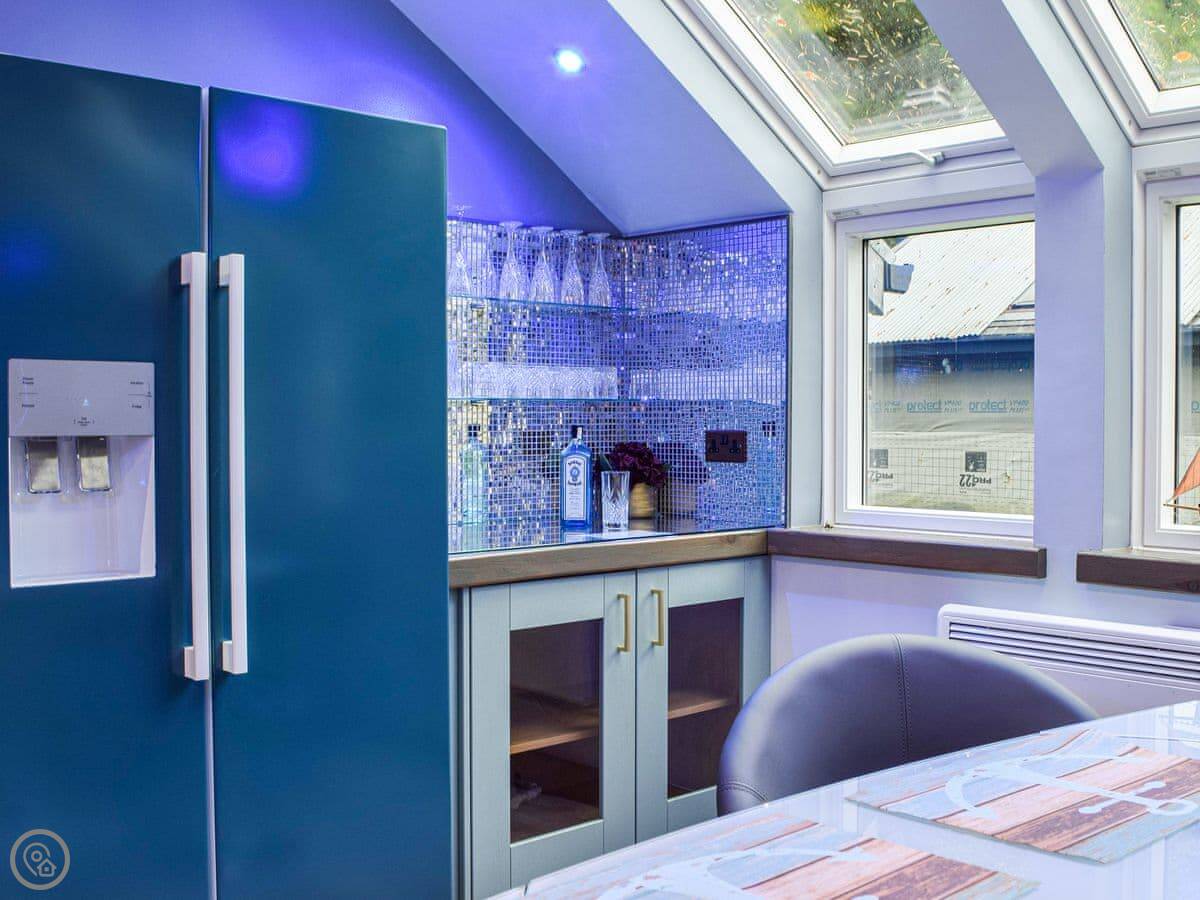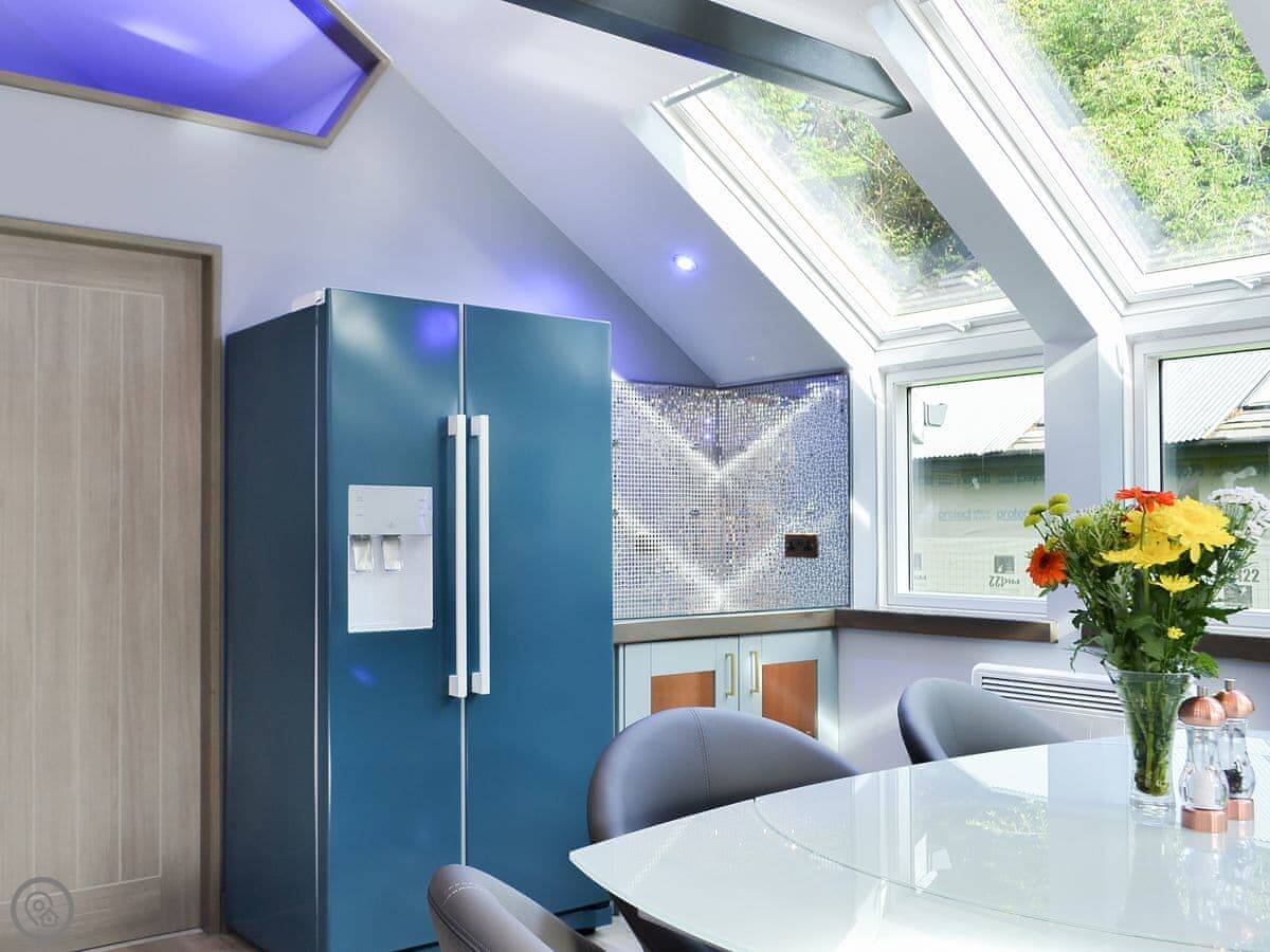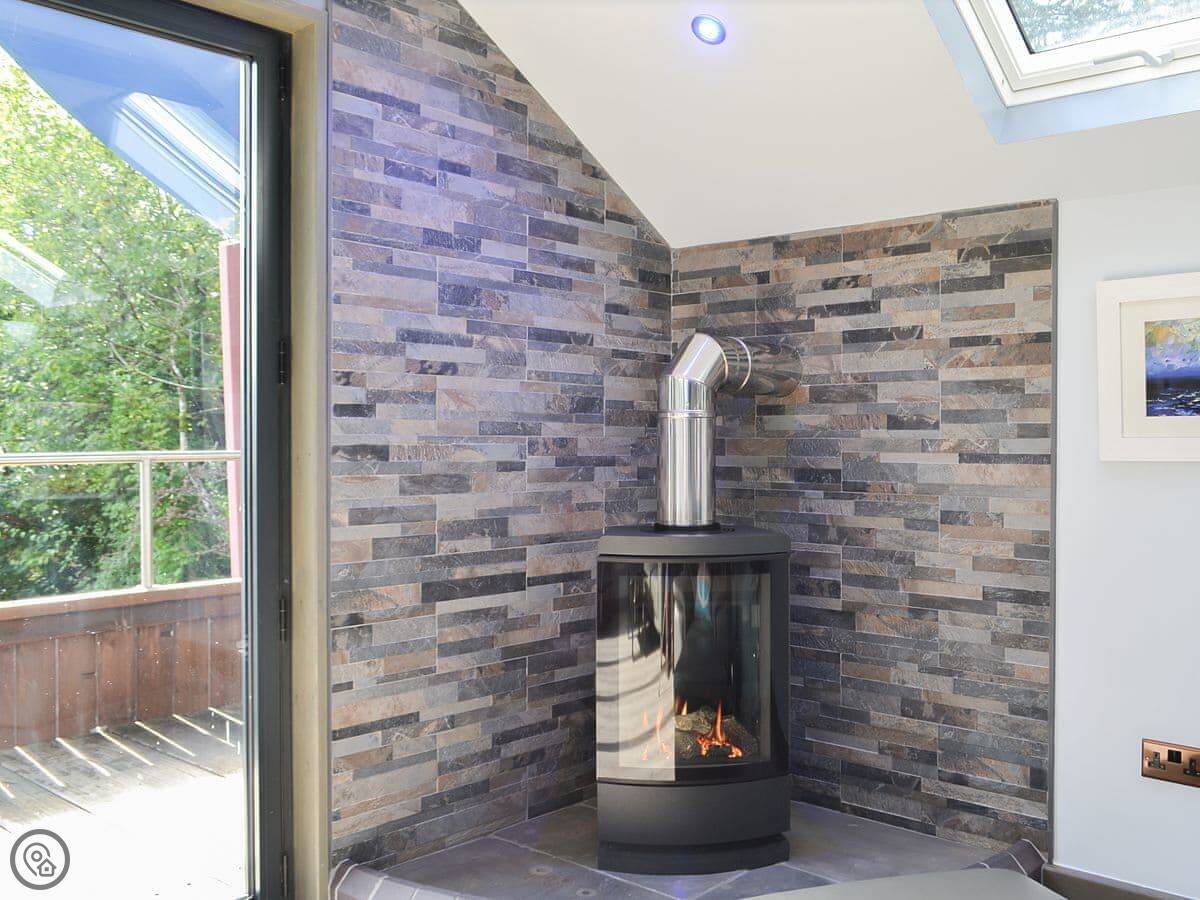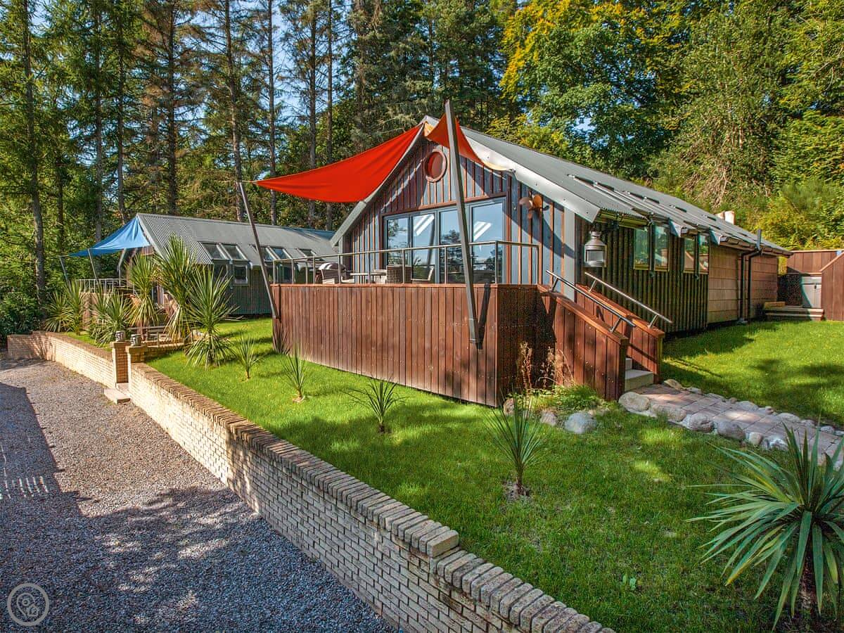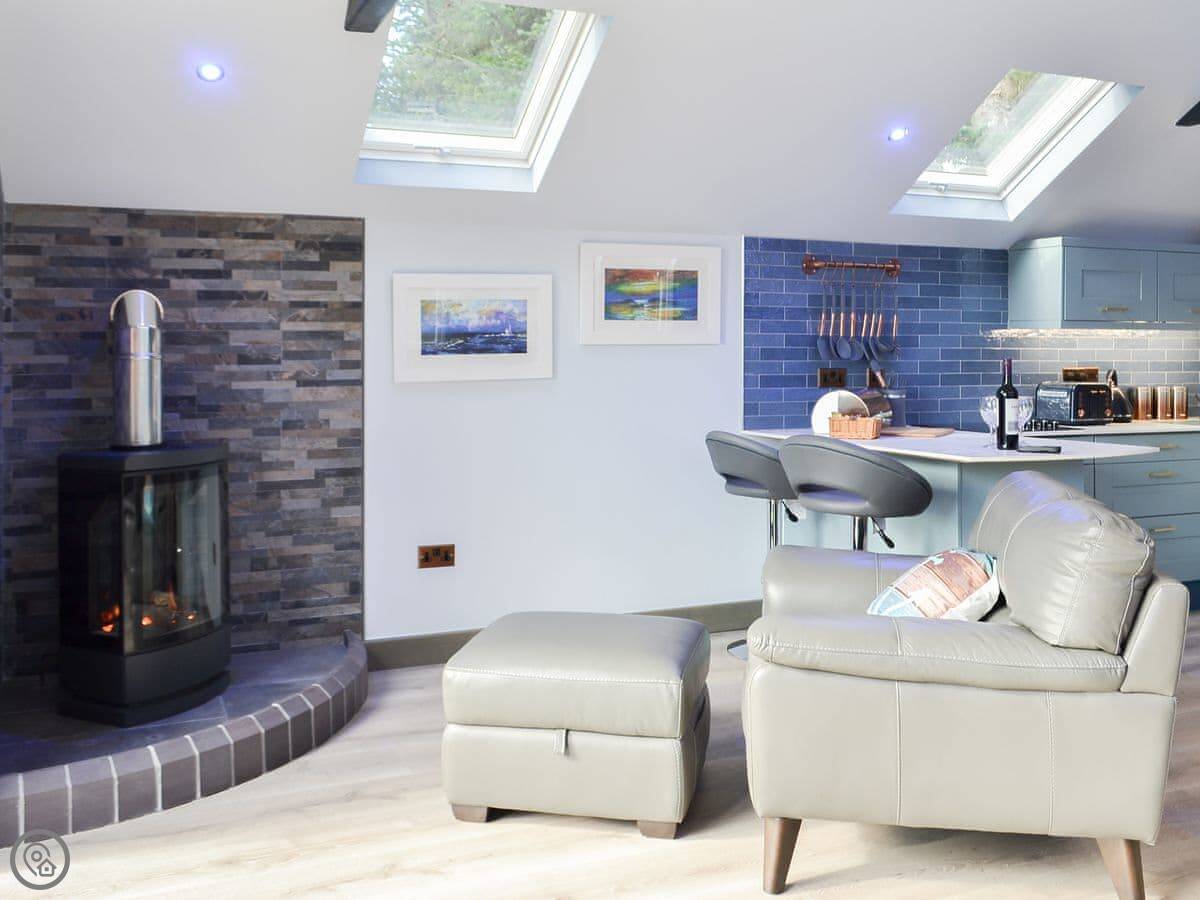There's a big open plan living area with a kitchen and a sofa. Glazed doors open onto the deck. You get a barbecue and the private hot tub is out the back.