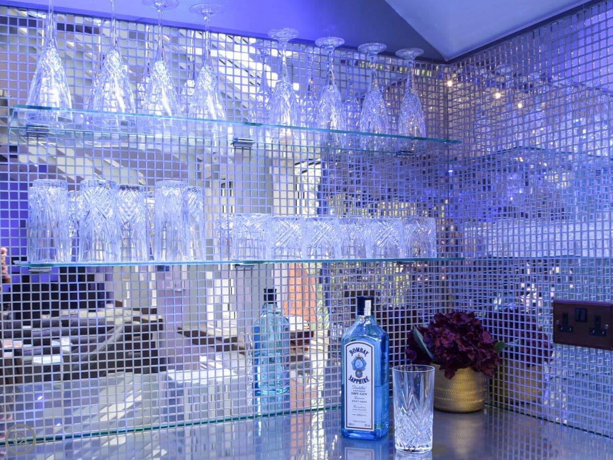 The design is modern. There's a bar area, mood lighting, a big TV. It's comfortable.
