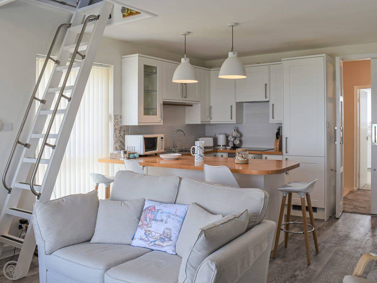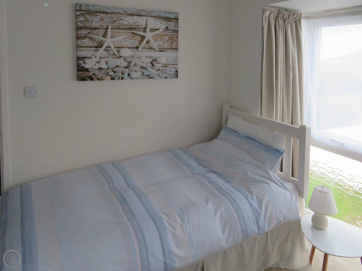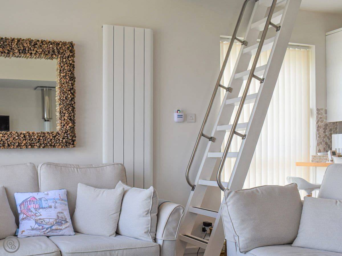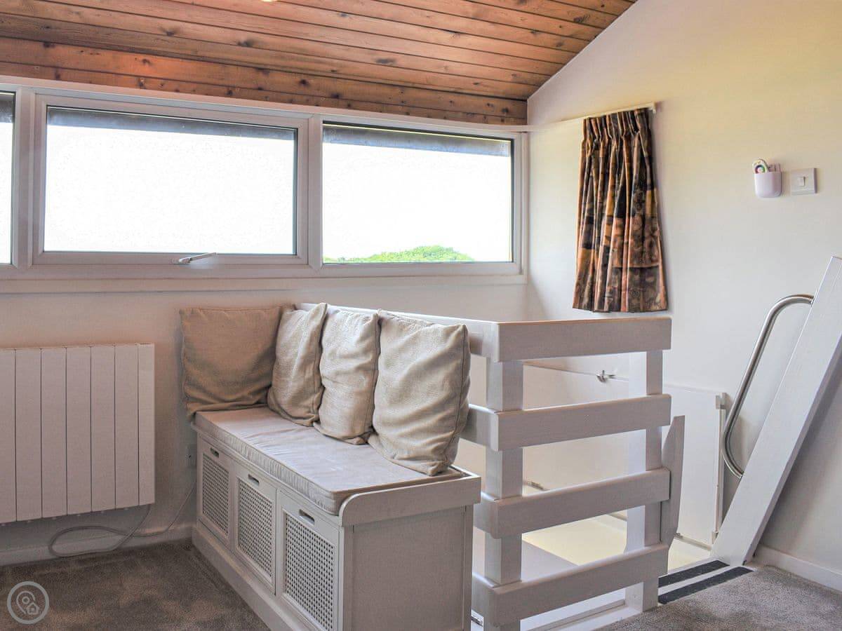 The living area has comfortable sofas, and wood burner. You can access a library of films showing local attractions, while relaxing under remotely controlled, mood lighting. The floor to ceiling glass doors almost bring the coastline into the room and give access to the suntrap balcony from where you can enjoy a 180-degree seascape. The third bedroom - twin or double- is reached via a steep, open staircase; Smart TV/DVD, hatch doors and great views across the bay create the perfect escape or loft den .