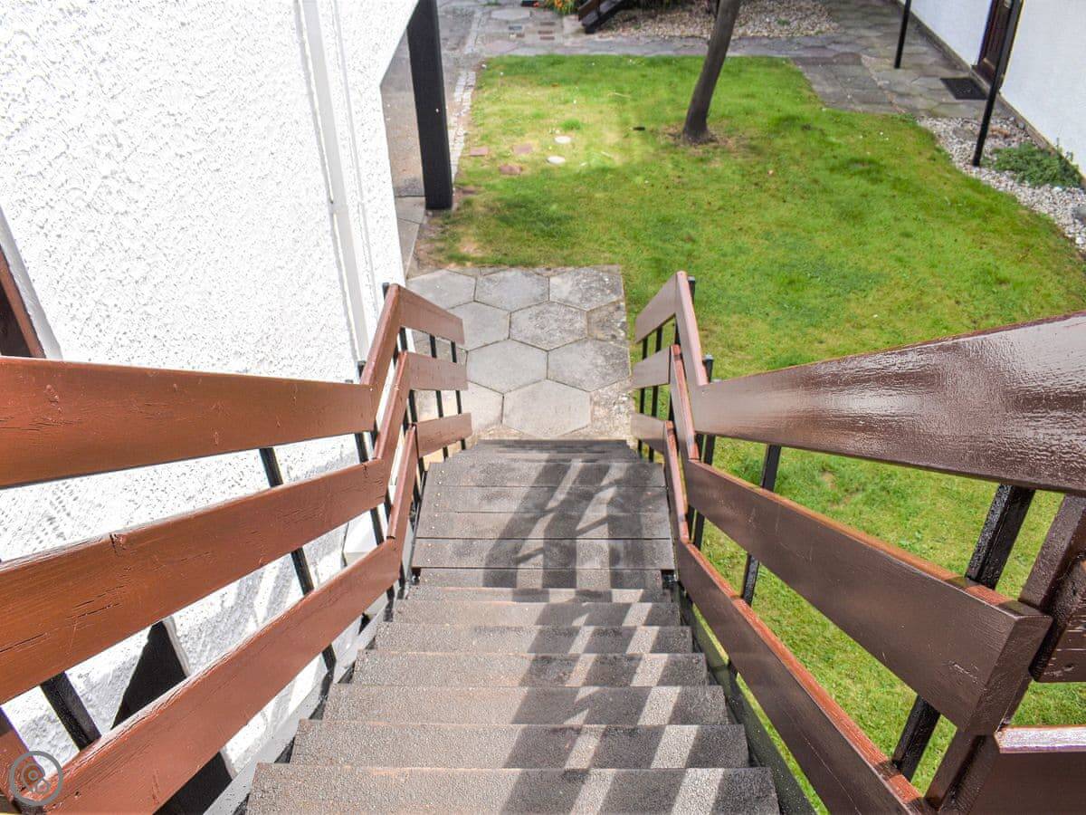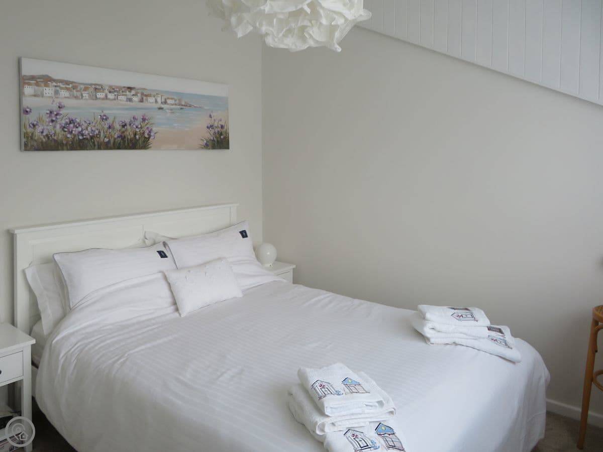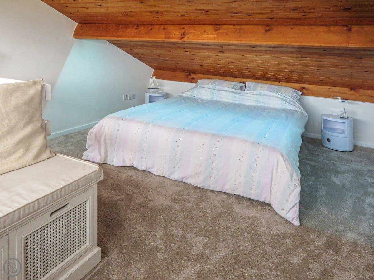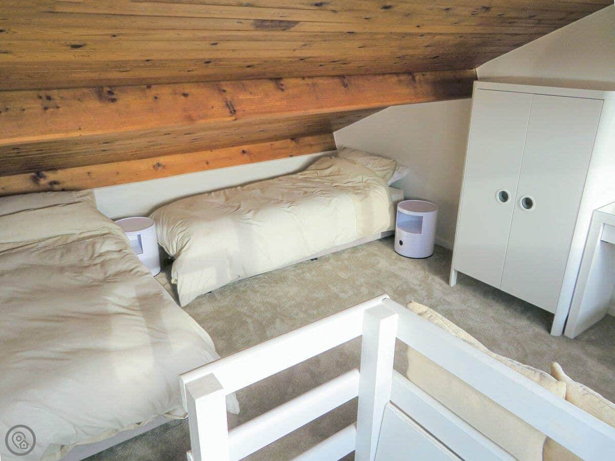 The living area has comfortable sofas, and wood burner. You can access a library of films showing local attractions, while relaxing under remotely controlled, mood lighting. The floor to ceiling glass doors almost bring the coastline into the room and give access to the suntrap balcony from where you can enjoy a 180-degree seascape. The third bedroom - twin or double- is reached via a steep, open staircase; Smart TV/DVD, hatch doors and great views across the bay create the perfect escape or loft den .