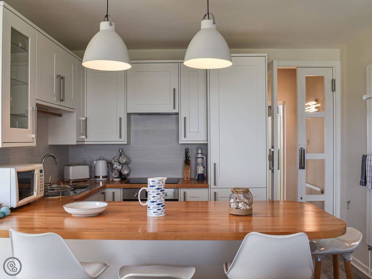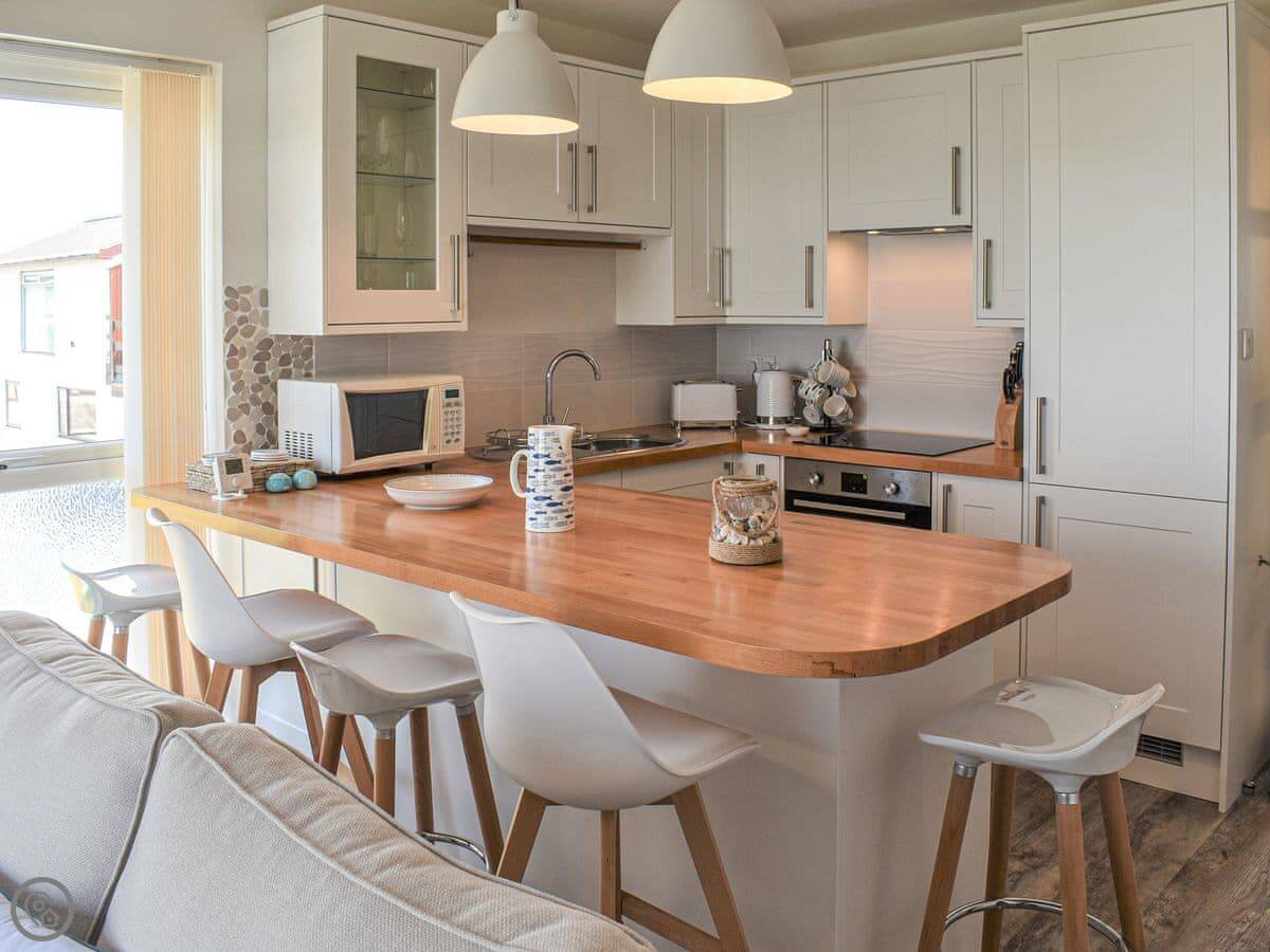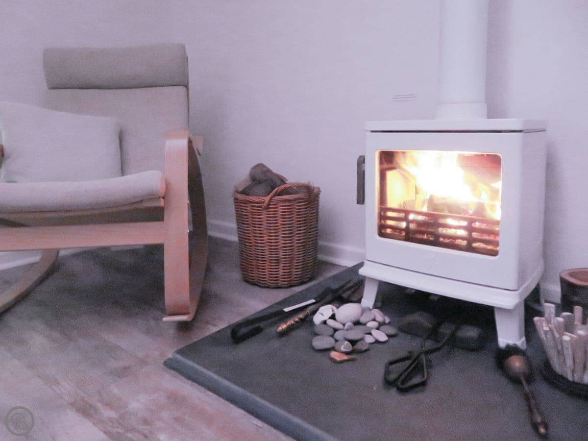 The main bedroom features a kingsize bed, wardrobe, dressing table, romantic lighting and bluetooth audio unit. Through double doors you will be taken with the view, enjoyed from the kitchen or while relaxing in front of the wood burner. This stylish and modern open living space provides a well-equipped kitchen with solid beech breakfast bar.