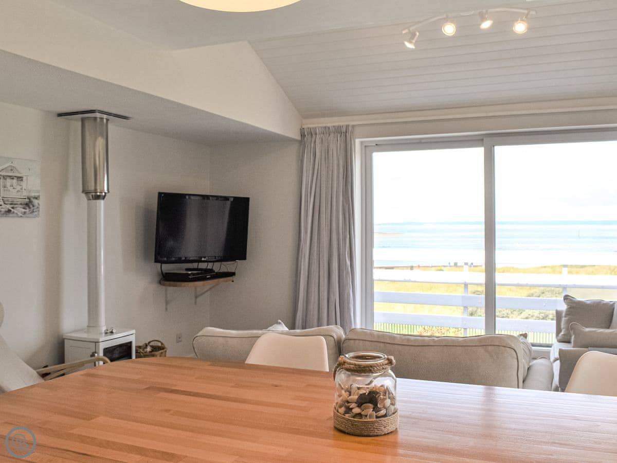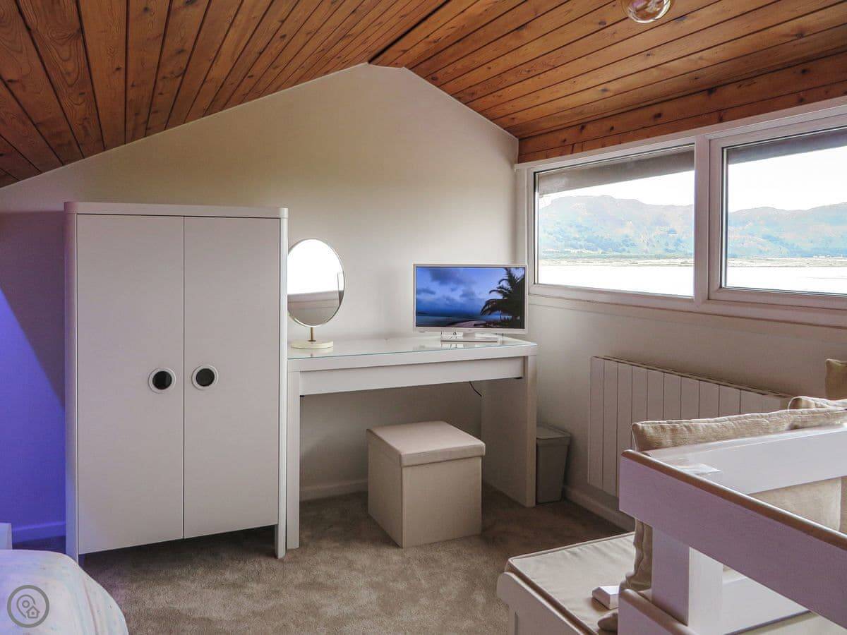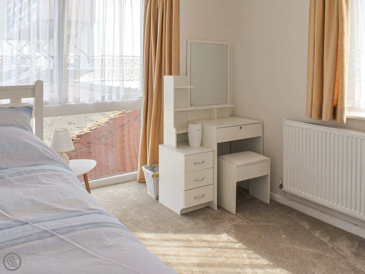 Sea View enjoys impressive views over sandhills out to sea, with mountains, Anglesey and Puffin Island in the distance. The entrance to the property is reached via an external staircase. The lovely apartment in a private estate is spread over three floors and the first floor contains a family bathroom, with shower over a curved bath, toilet, and heated towel rail. There is also a separate toilet. The bedroom on this floor has twin beds, with a double or three single beds on request resulting in one bed in top room. This room has a built-in wardrobe, dressing table, mirrors, USB charging and lovely views.