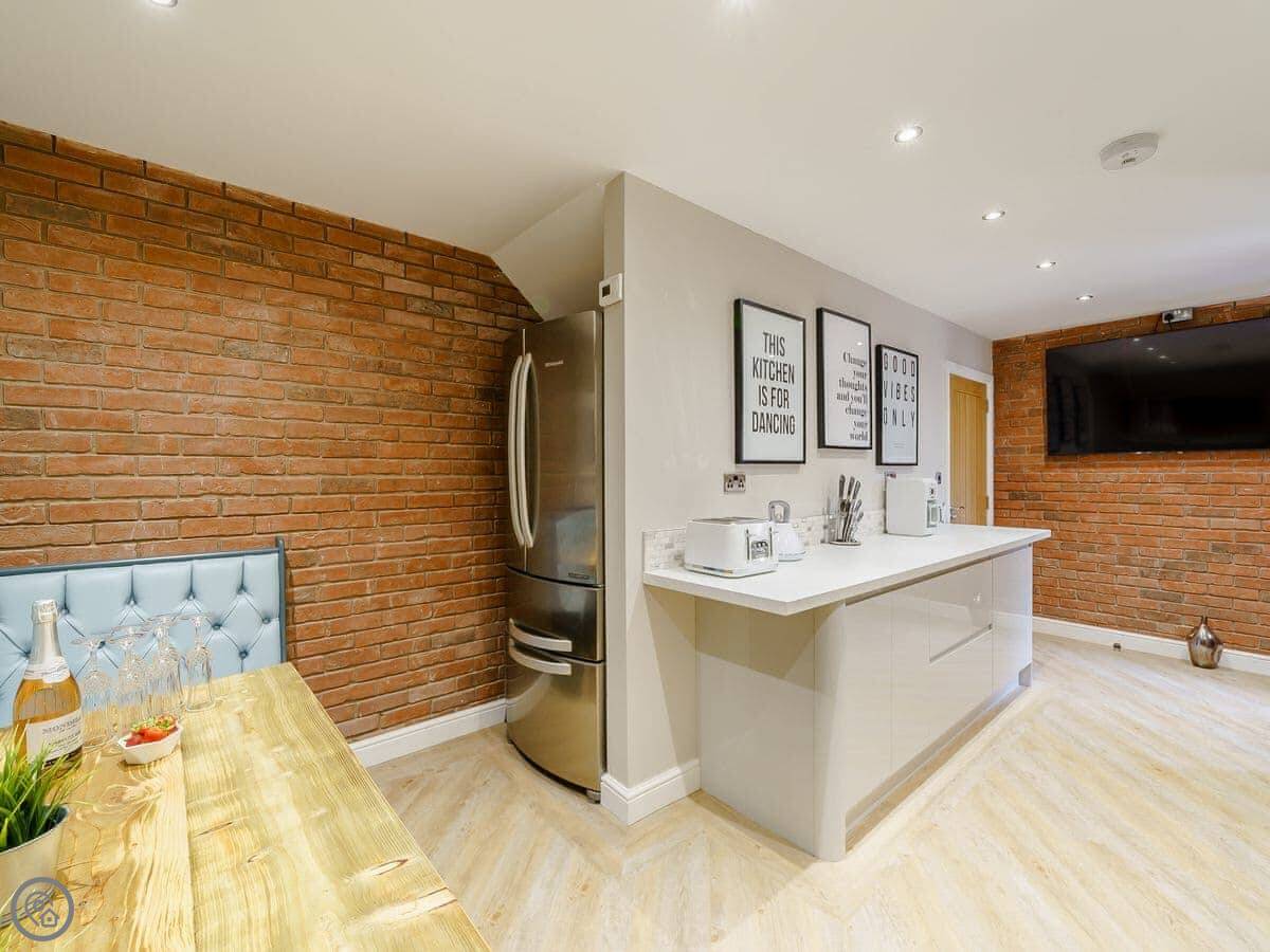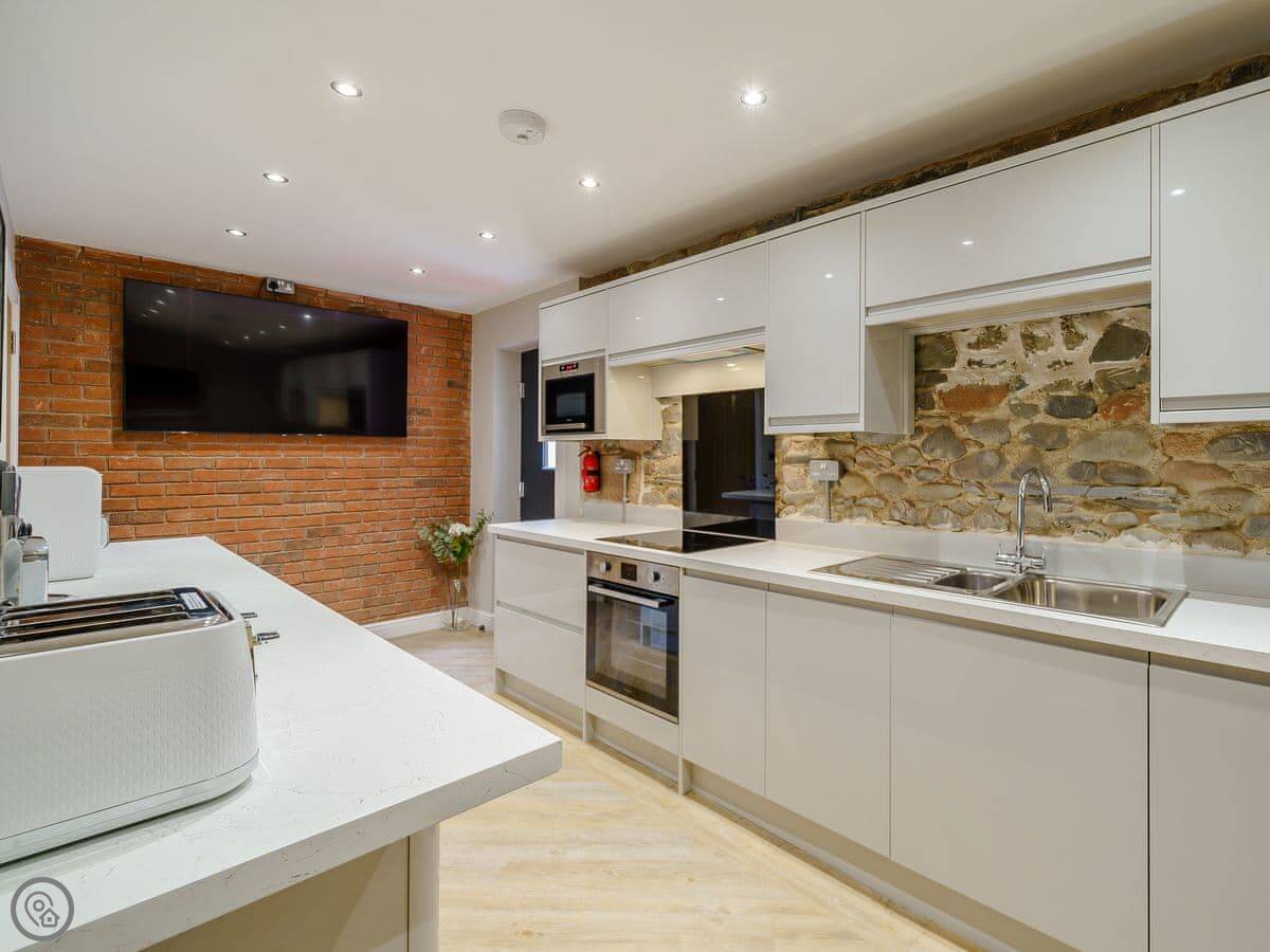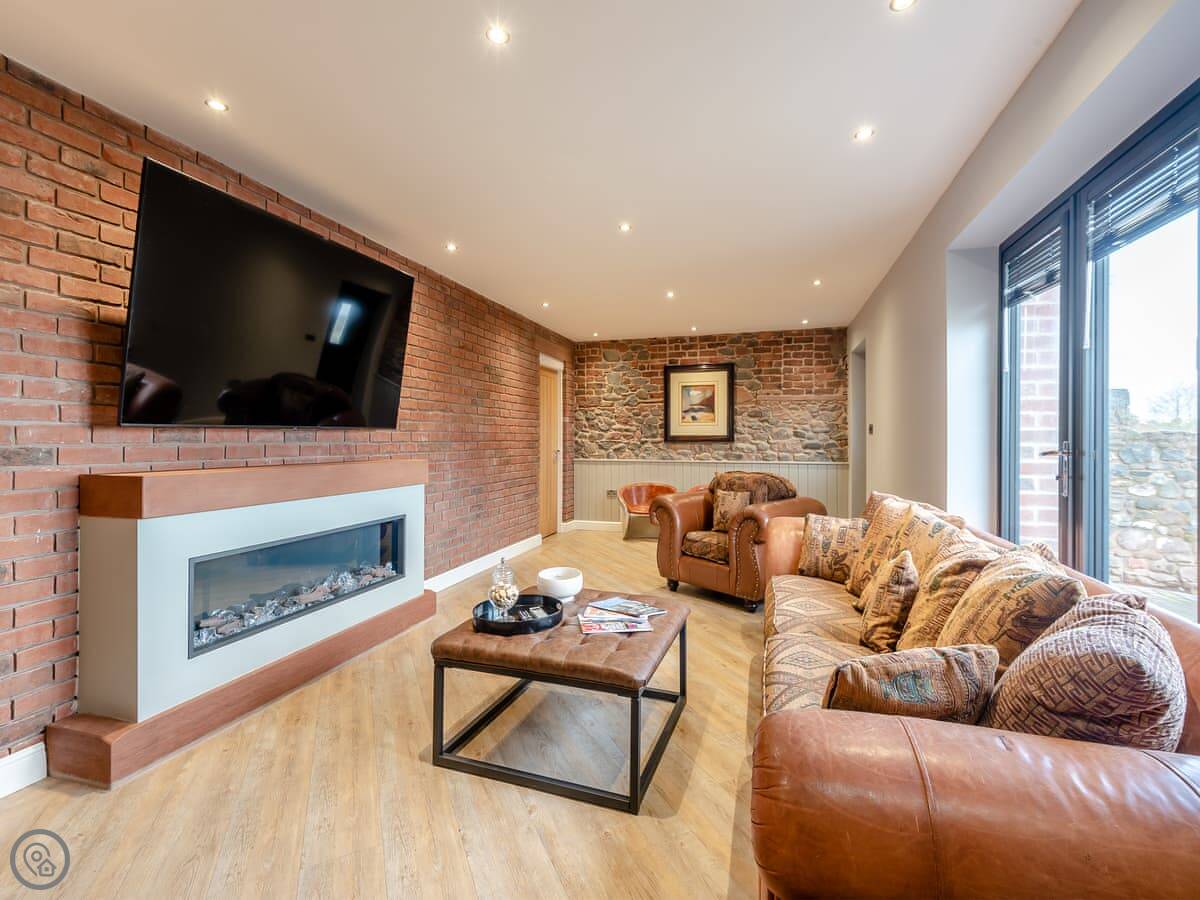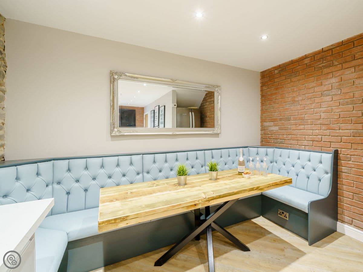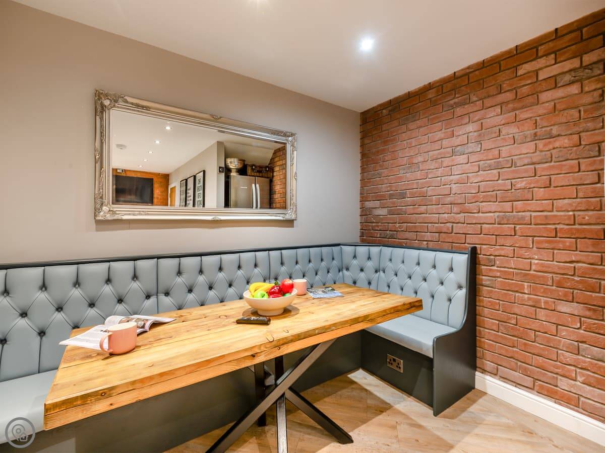Downstairs is all open plan. The ceilings are high, and you can see the original stone walls. It feels spacious. There's a big TV above the fireplace in the living area. The kitchen table is in a diner-style booth, which is good for meals and board games. It's a 5 Star place, so everything is new and works well.