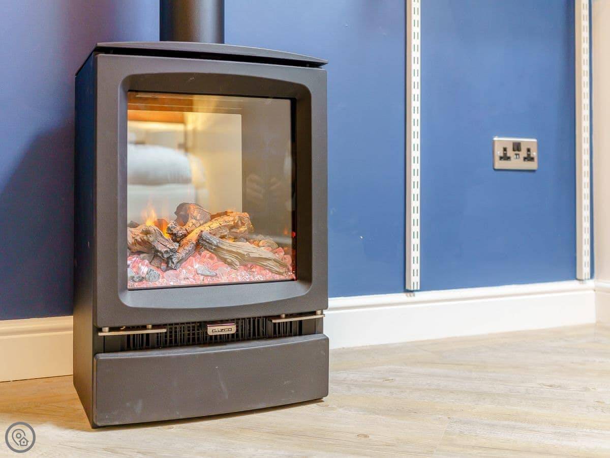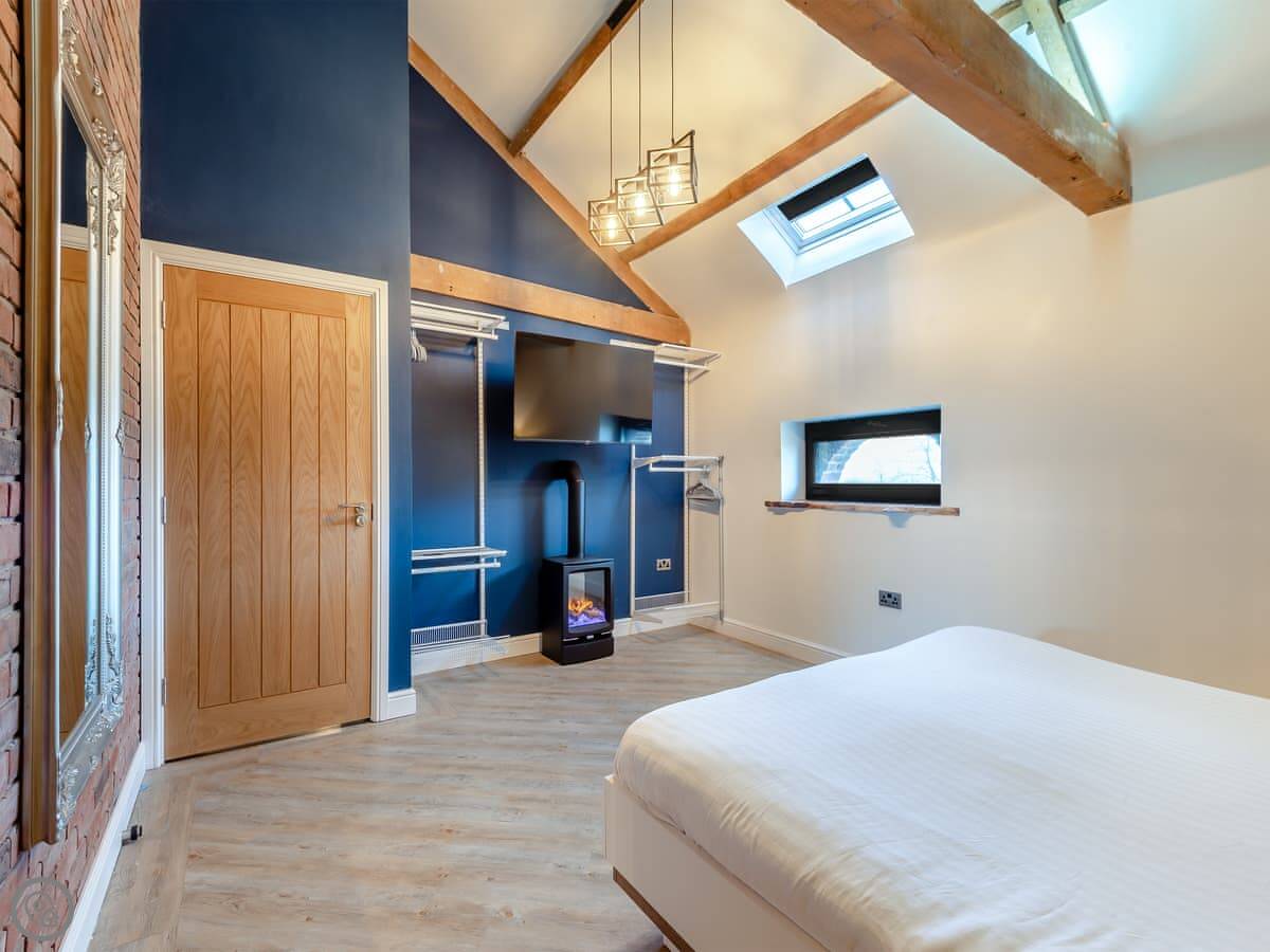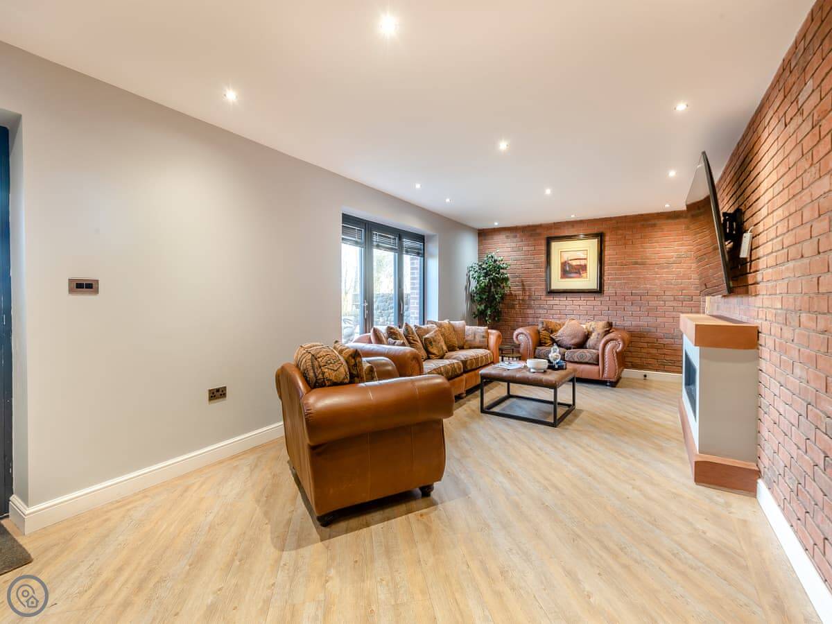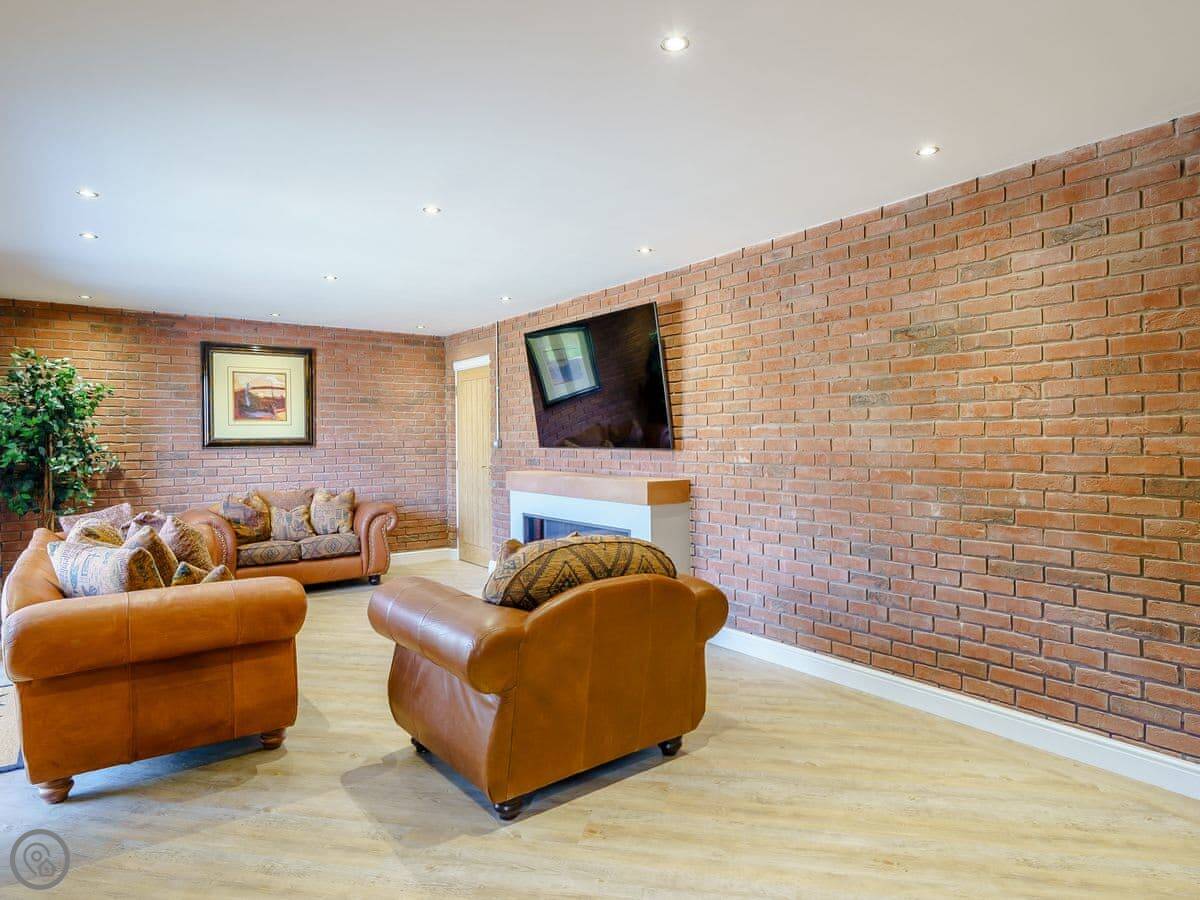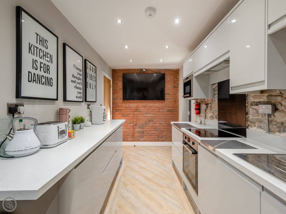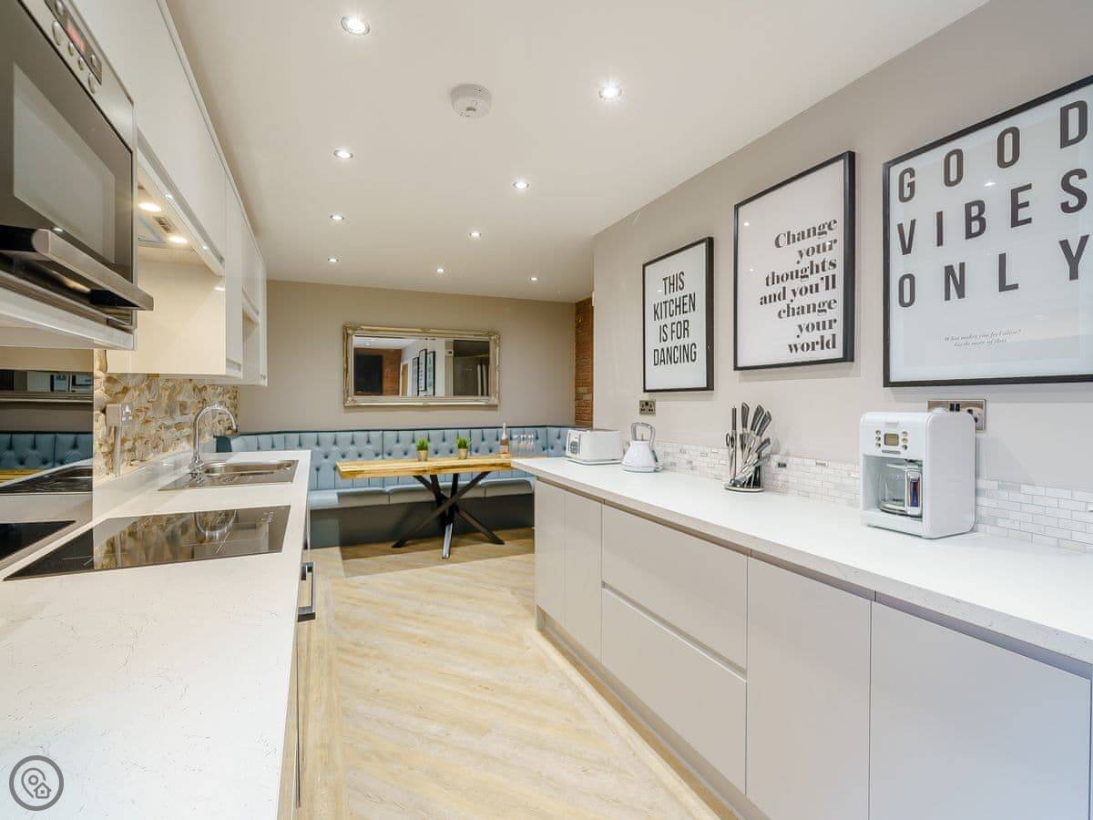 Downstairs is all open plan. The ceilings are high, and you can see the original stone walls. It feels spacious. There's a big TV above the fireplace in the living area. The kitchen table is in a diner-style booth, which is good for meals and board games. It's a 5 Star place, so everything is new and works well.