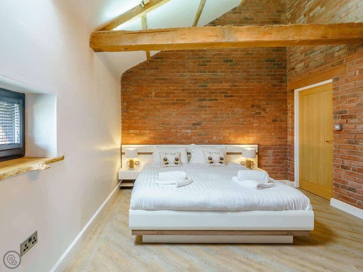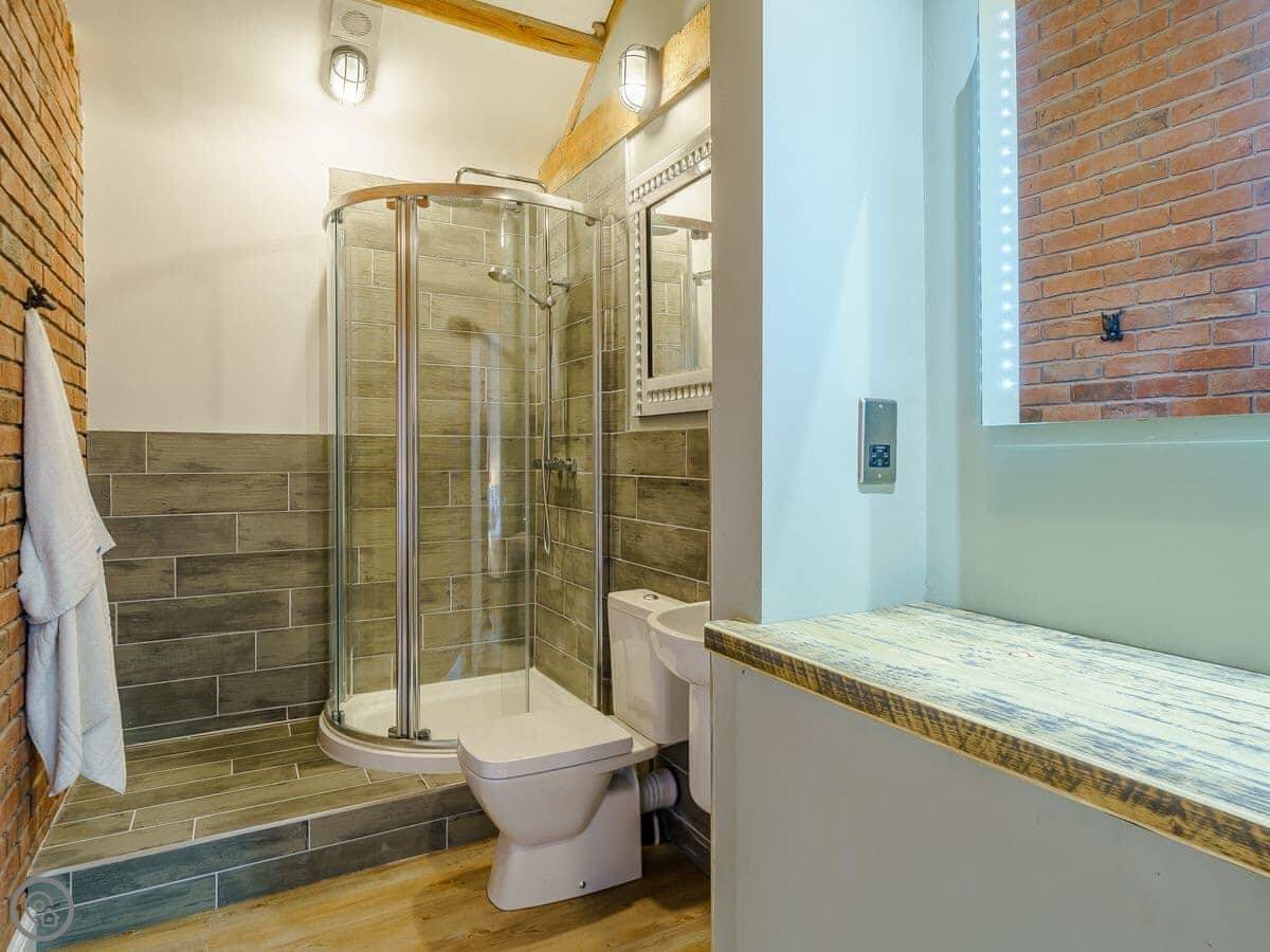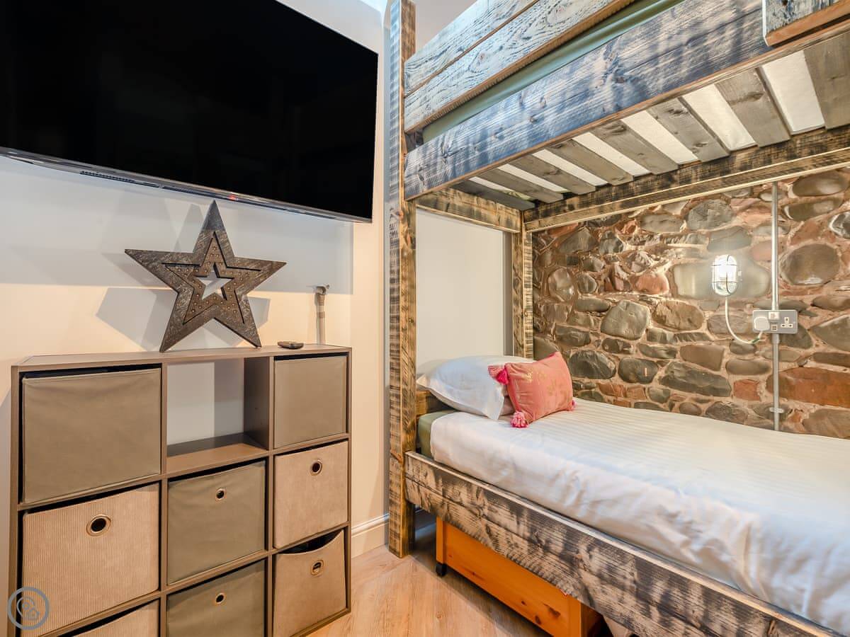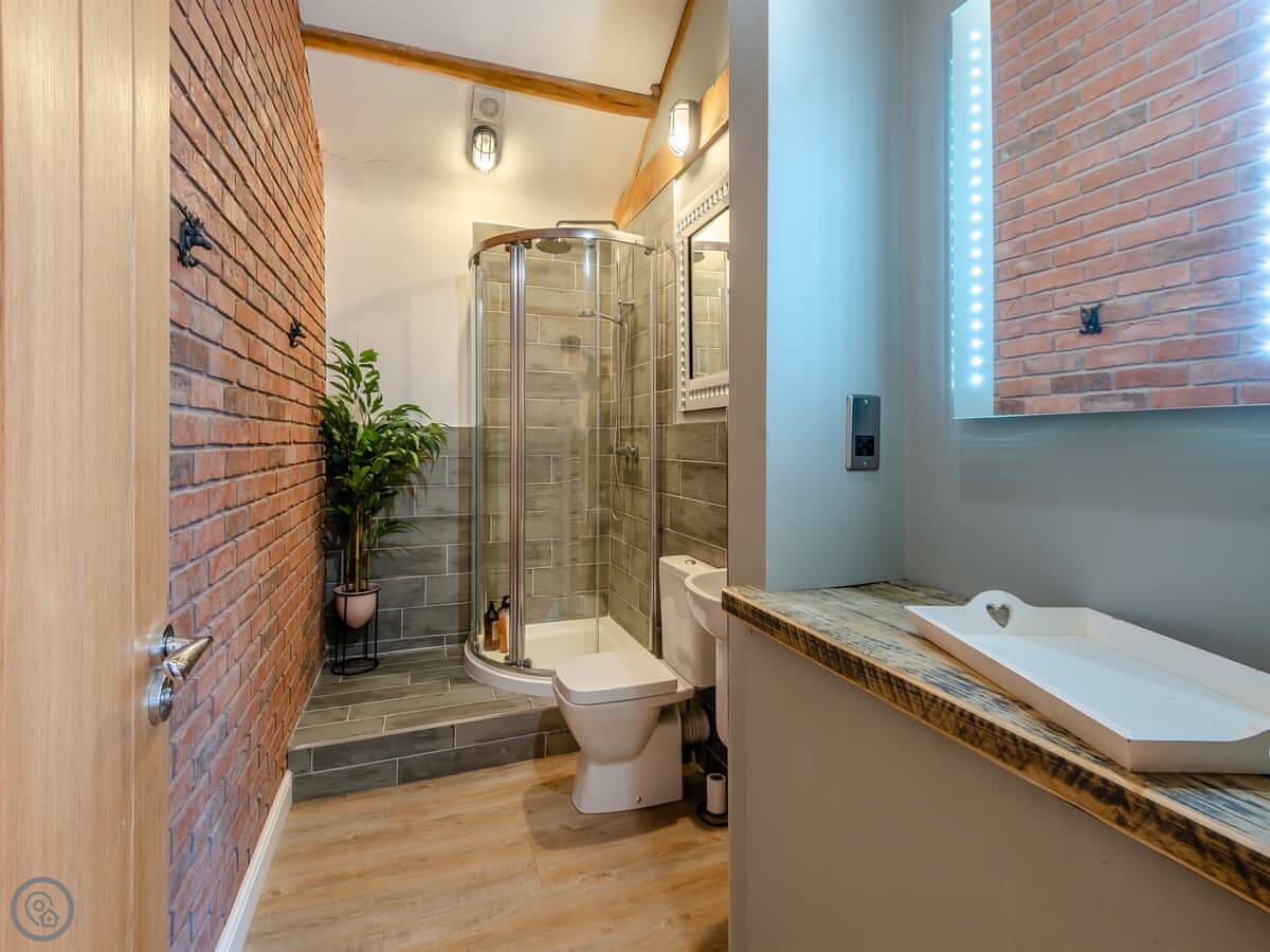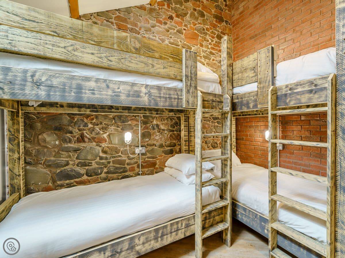 It sleeps up to eight. There are three bedrooms, but two are big. One has a super king bed and its own shower room. Another has a king bed. The third room has two sets of bunk beds, so it sleeps four, and it's got its own toilet. There's a family bathroom upstairs too. So, two toilets and two shower rooms in total.