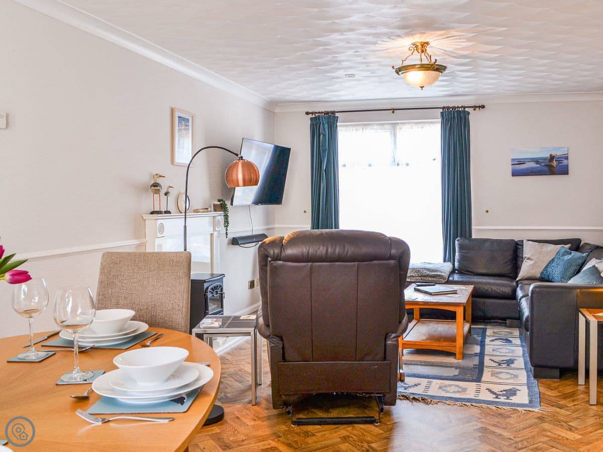 Inside, it's all open plan downstairs. The sofas face an electric fire. The patio doors let in a lot of light. The kitchen has a dishwasher and a washing machine.