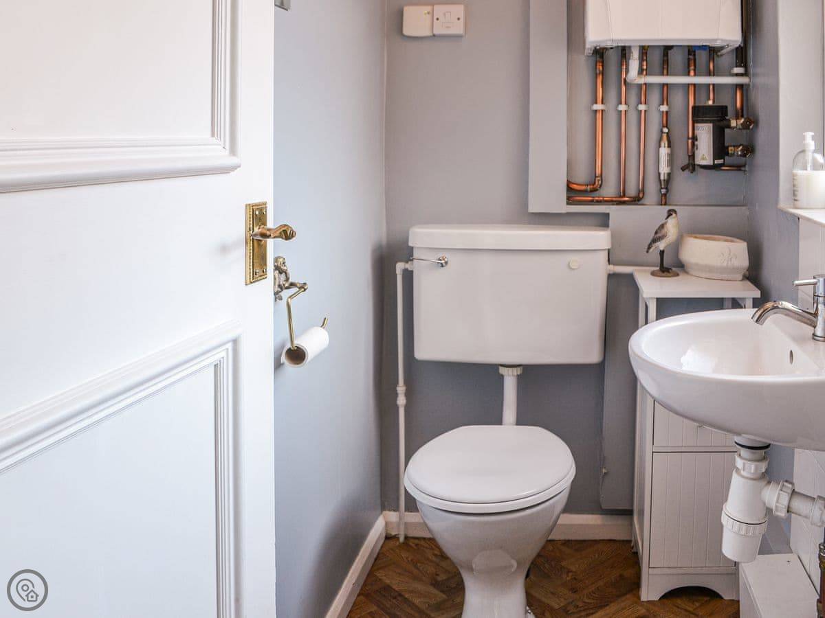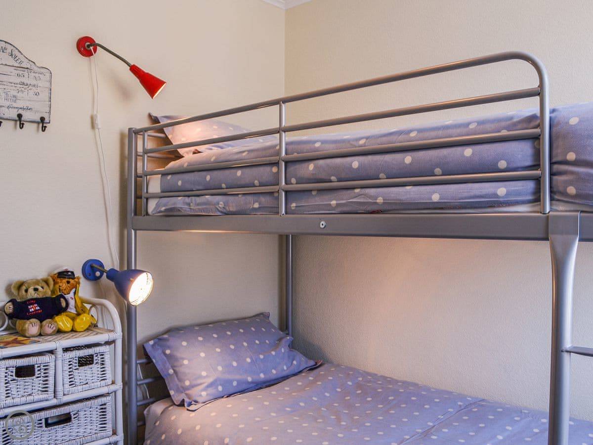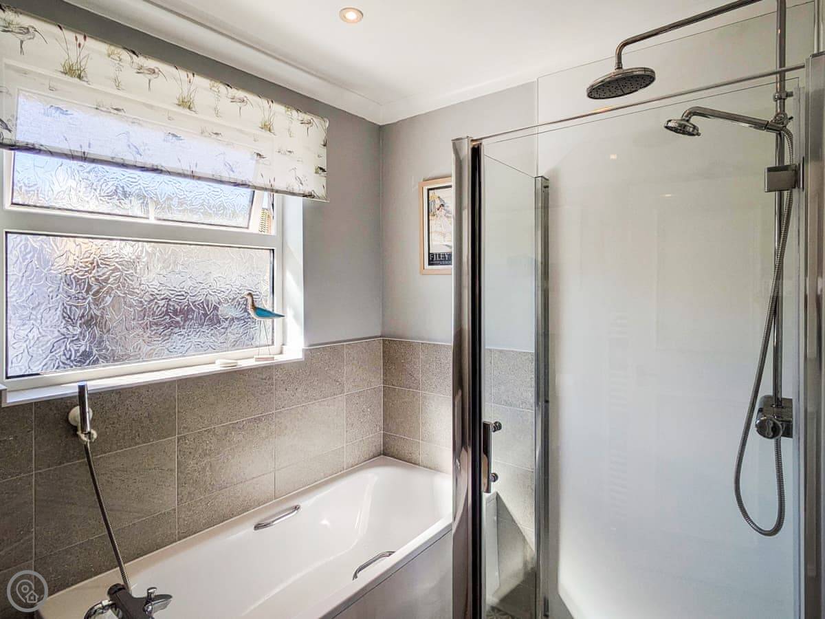 Upstairs, the bedrooms have wooden floors. One has bunk beds, one has a king-size bed, and the other has a super-king that can be made into two singles if you ask beforehand. There's a proper bathroom with a bath and a separate shower.