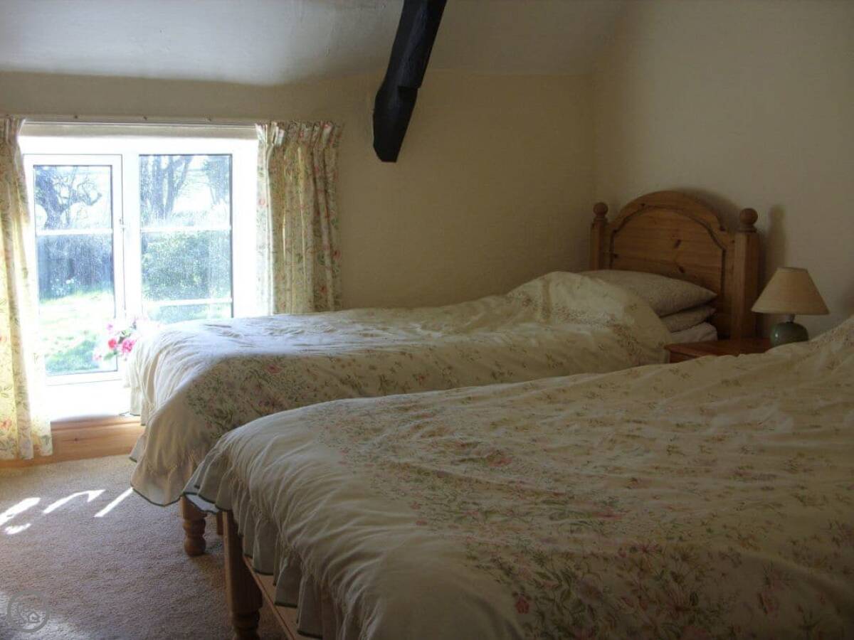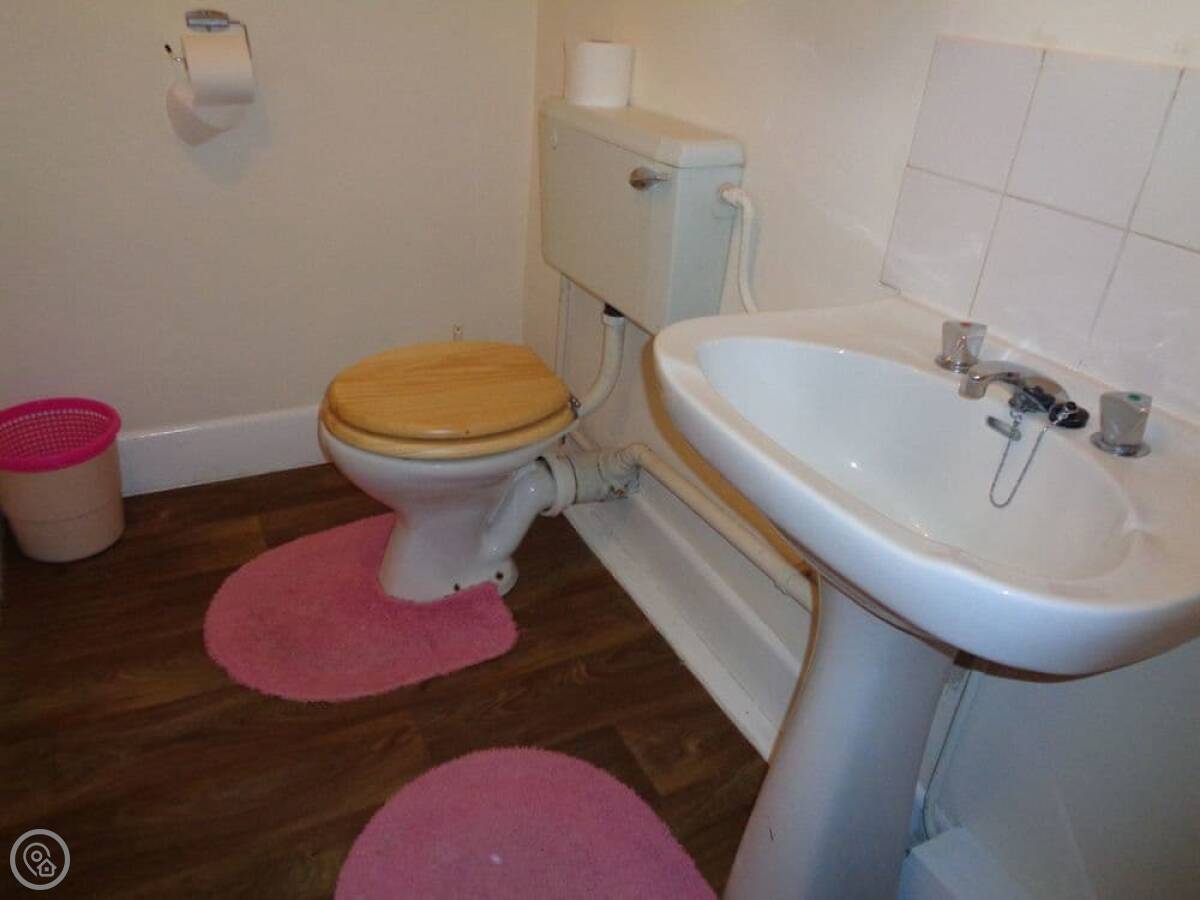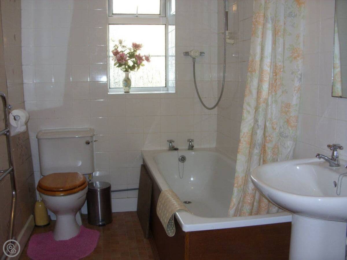 The bathroom is downstairs, with a shower over the bath. Upstairs, there's a double room, a twin room, and a single room with its own toilet and basin. We can put an extra guest bed in the single room if you need it.