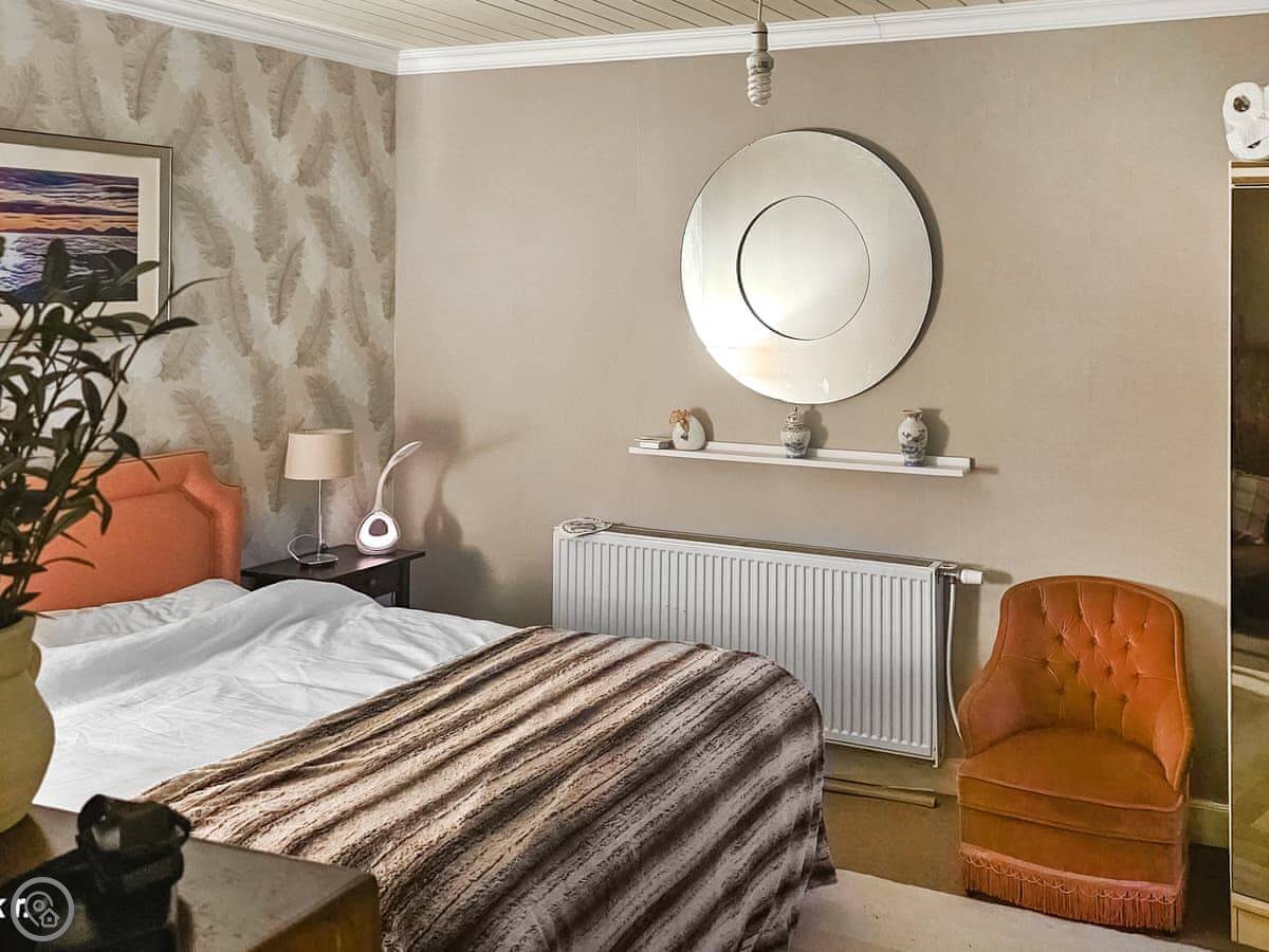 The cottage sleeps two. One bedroom, one bathroom. It's a 3 Star place, so it's comfortable and clean but not luxury. It's a traditional build, so the ceilings are wood-lined and it feels quite old-fashioned inside, but you've got WiFi and a decent kitchen.