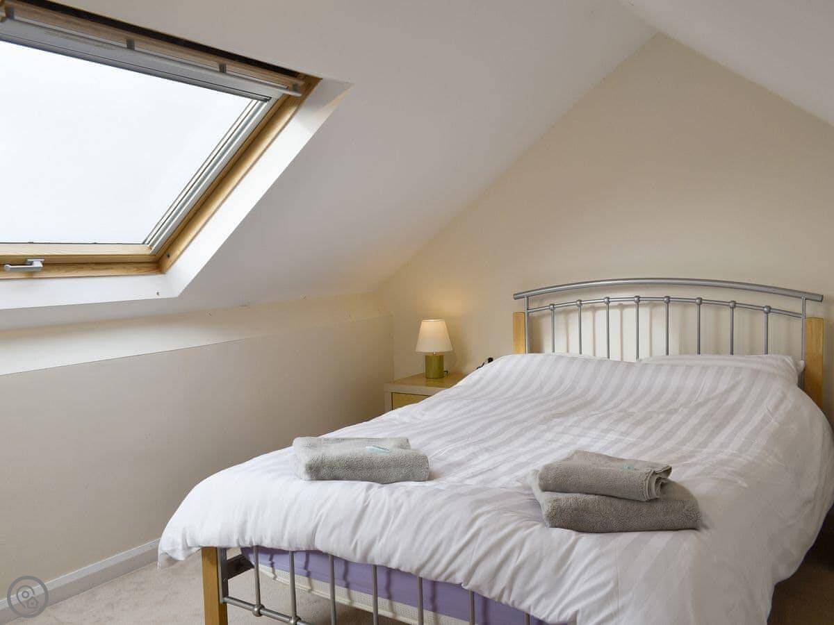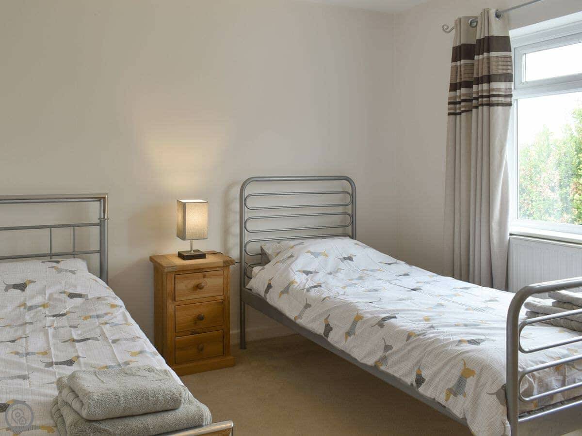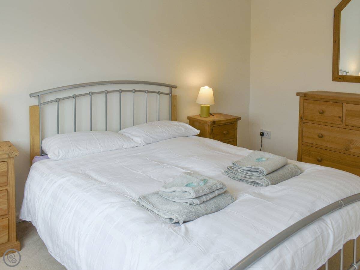 There are three bedrooms and two bathrooms. Two bedrooms are on the ground floor, one with a double and one with twins. The third bedroom is upstairs, it's the master with an en-suite shower room. The stairs are a standard flight, not a ladder or anything, just stairs.