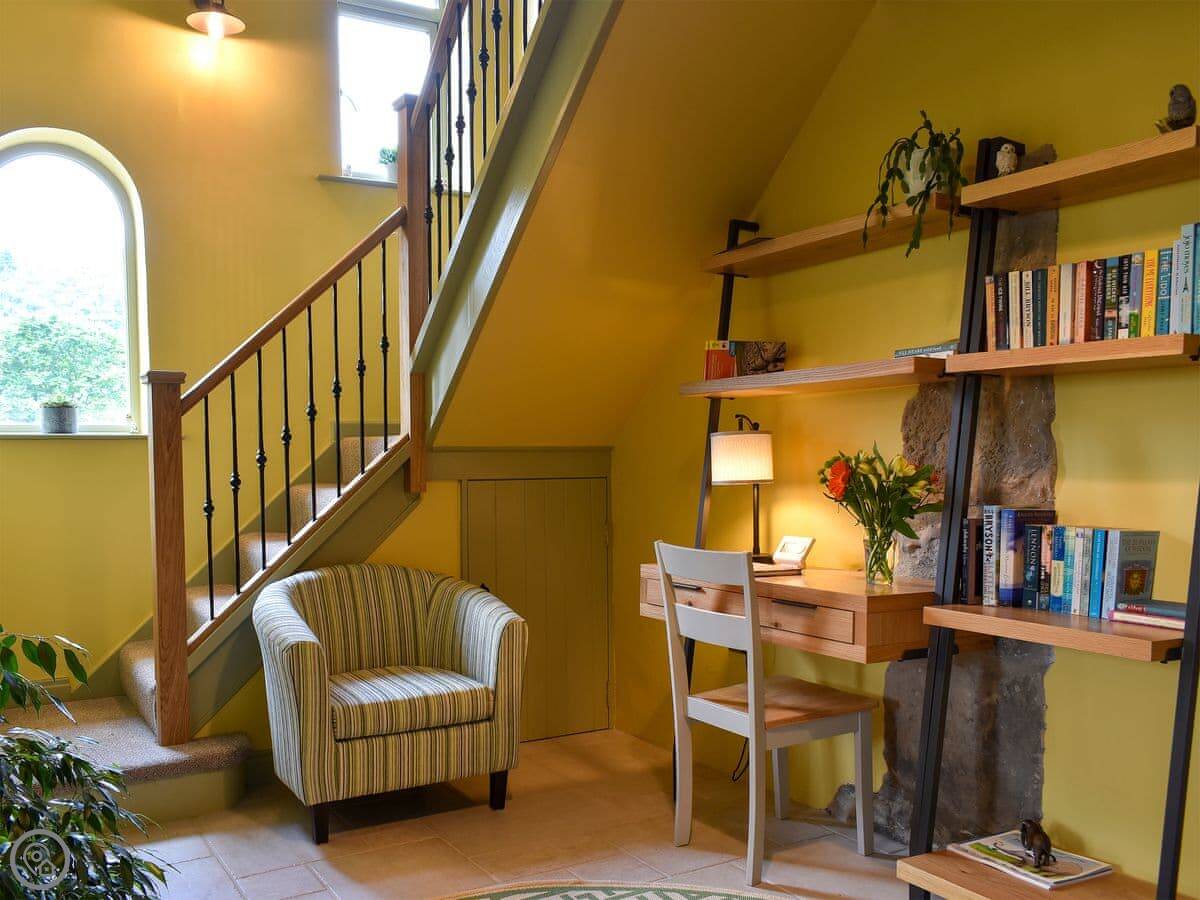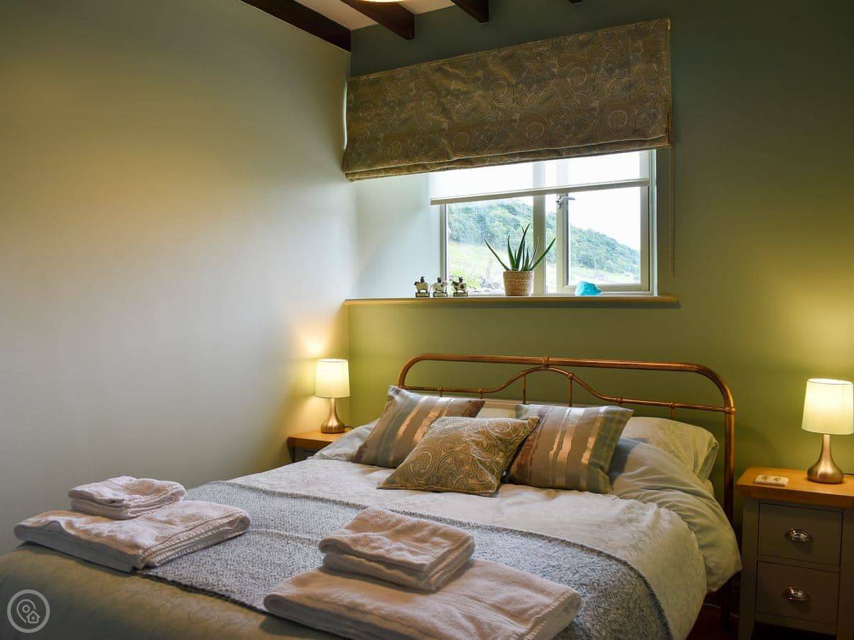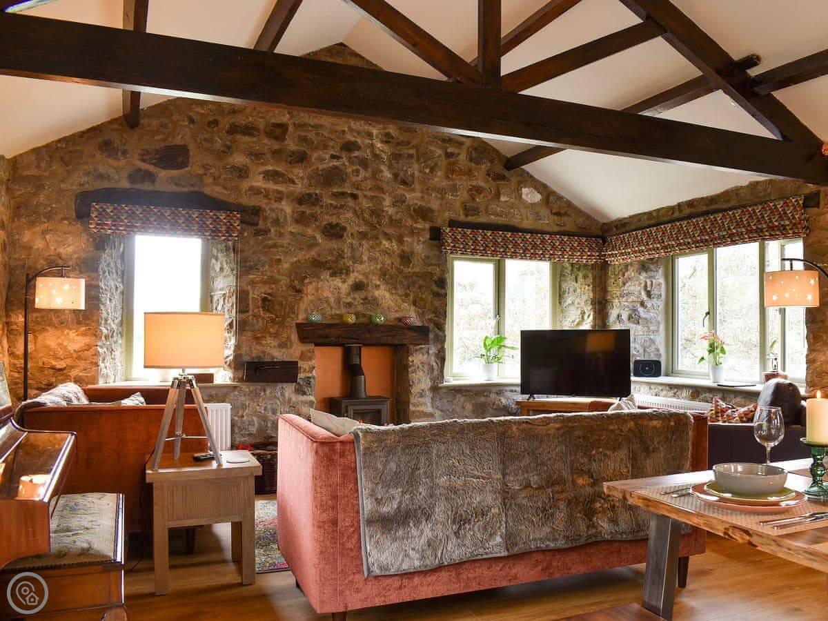 It's a 4 Star rating, so it's comfortable and well-furnished. The living space is upstairs. That's where you get the wide views across the valley. There's a wood burner in there for cooler evenings.