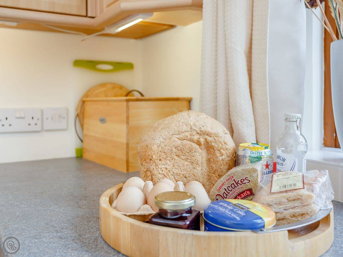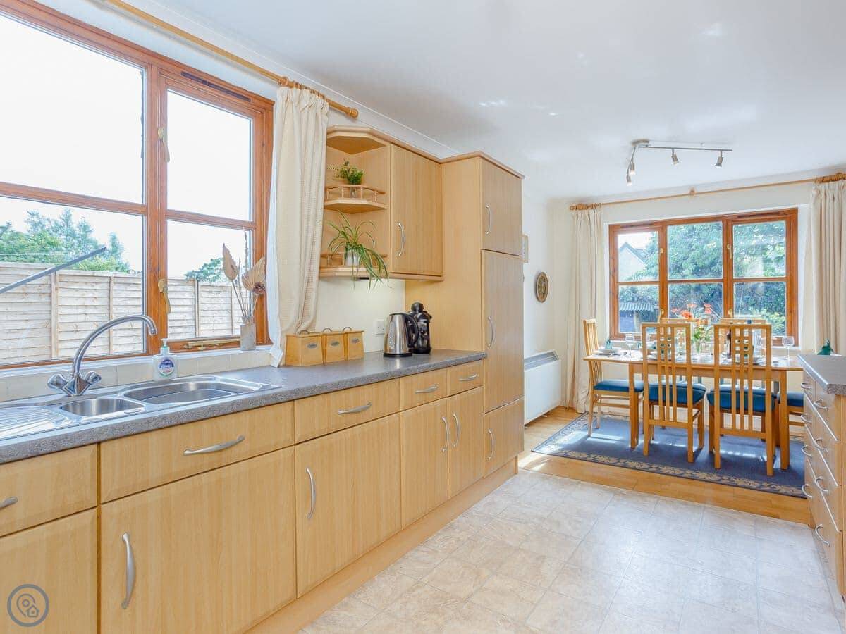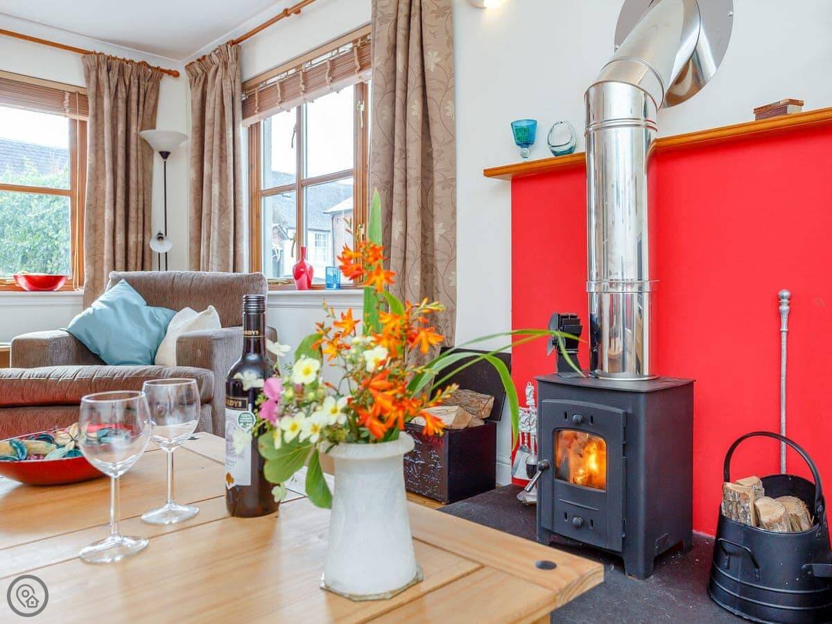 Inside, it's comfortable. There's a woodburning stove in the living room. The kitchen has a dishwasher and a washing machine. Bedding and towels are included. We leave a cot and a highchair there too.