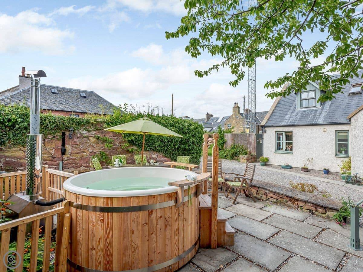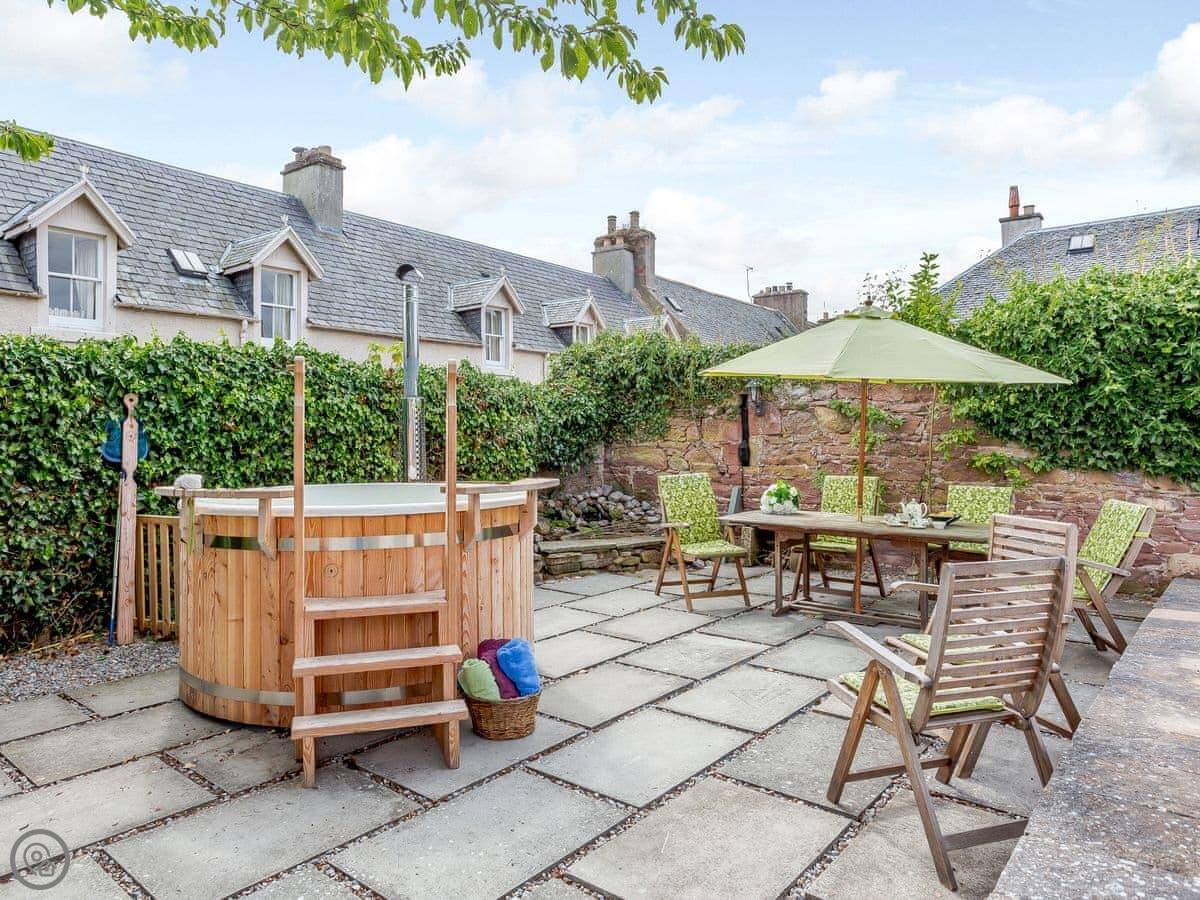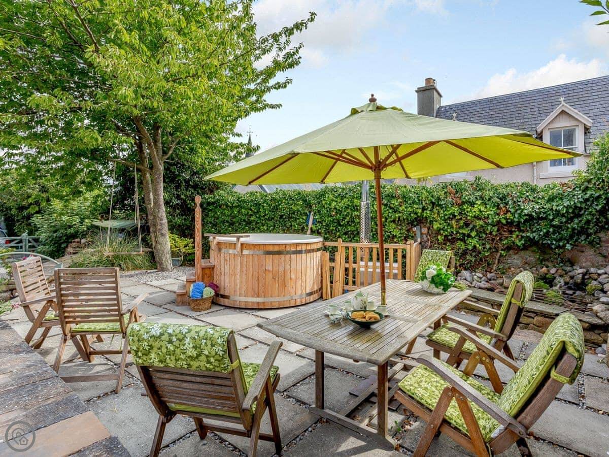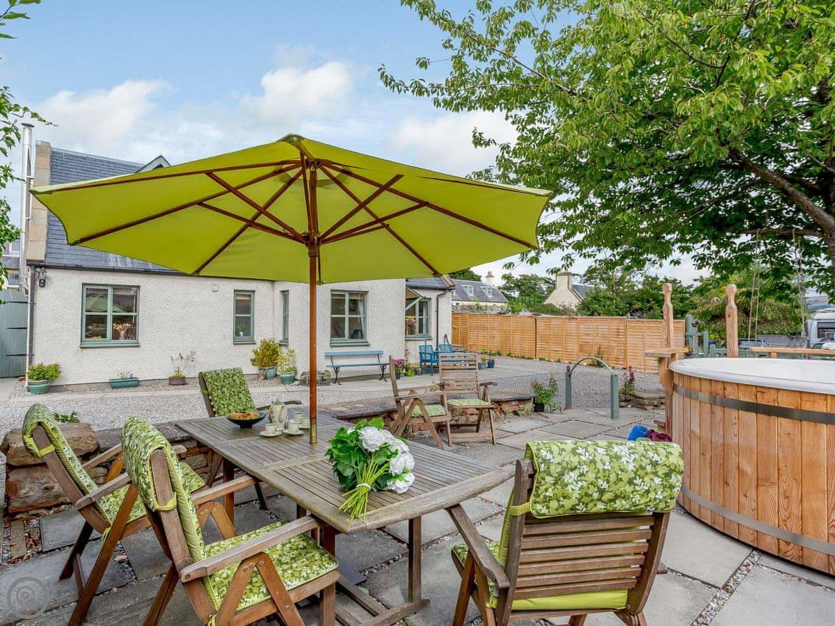 Caldon Cottage is in Cromarty, on the Black Isle. It's a detached house with a decent bit of garden around it. The garden is enclosed, so it's safe for dogs and kids. There's a wood-fired hot tub out there. It's sheltered by old walls, and the weather here is often milder than you'd expect for the Highlands. You can sit outside a fair bit.