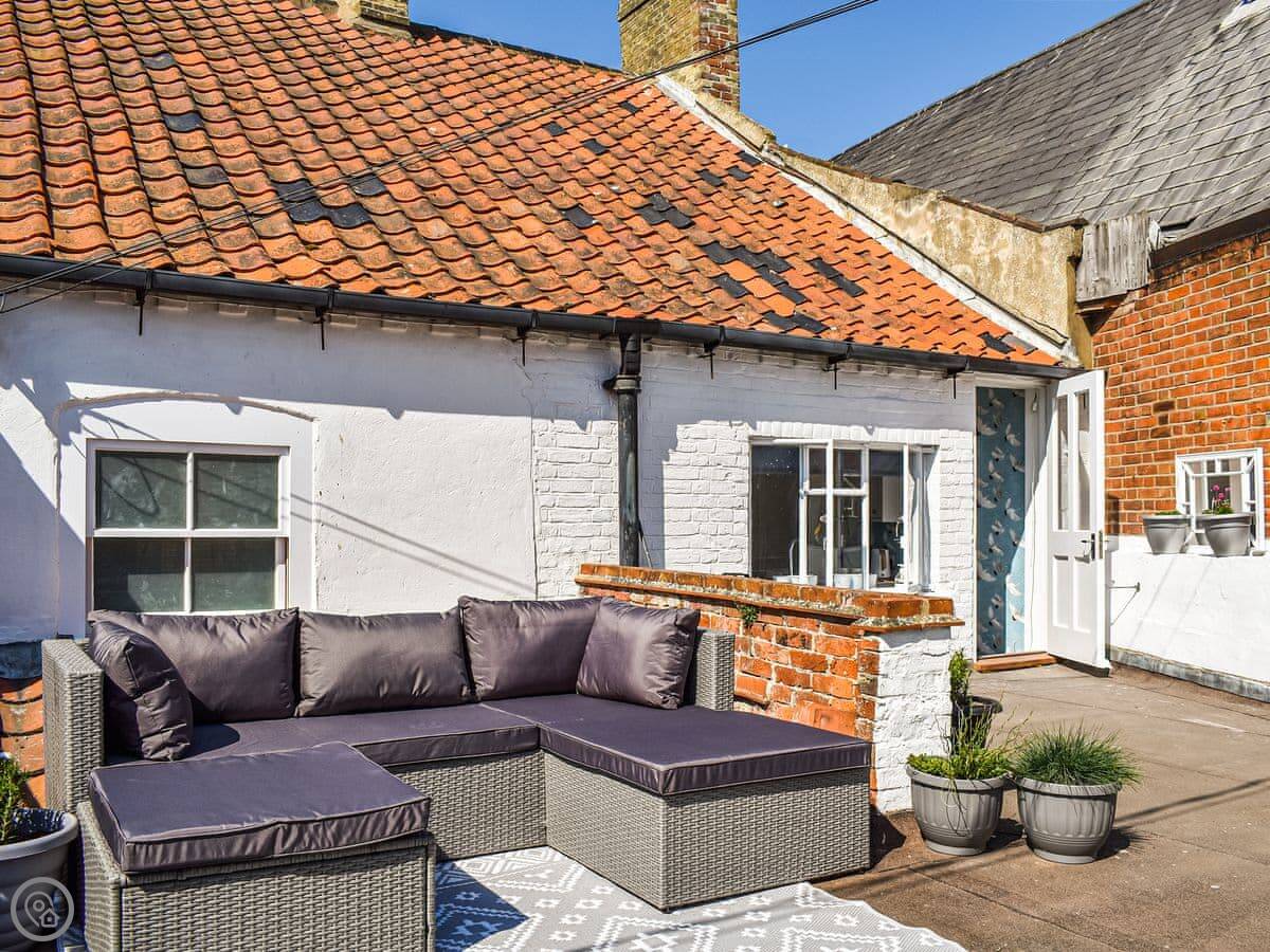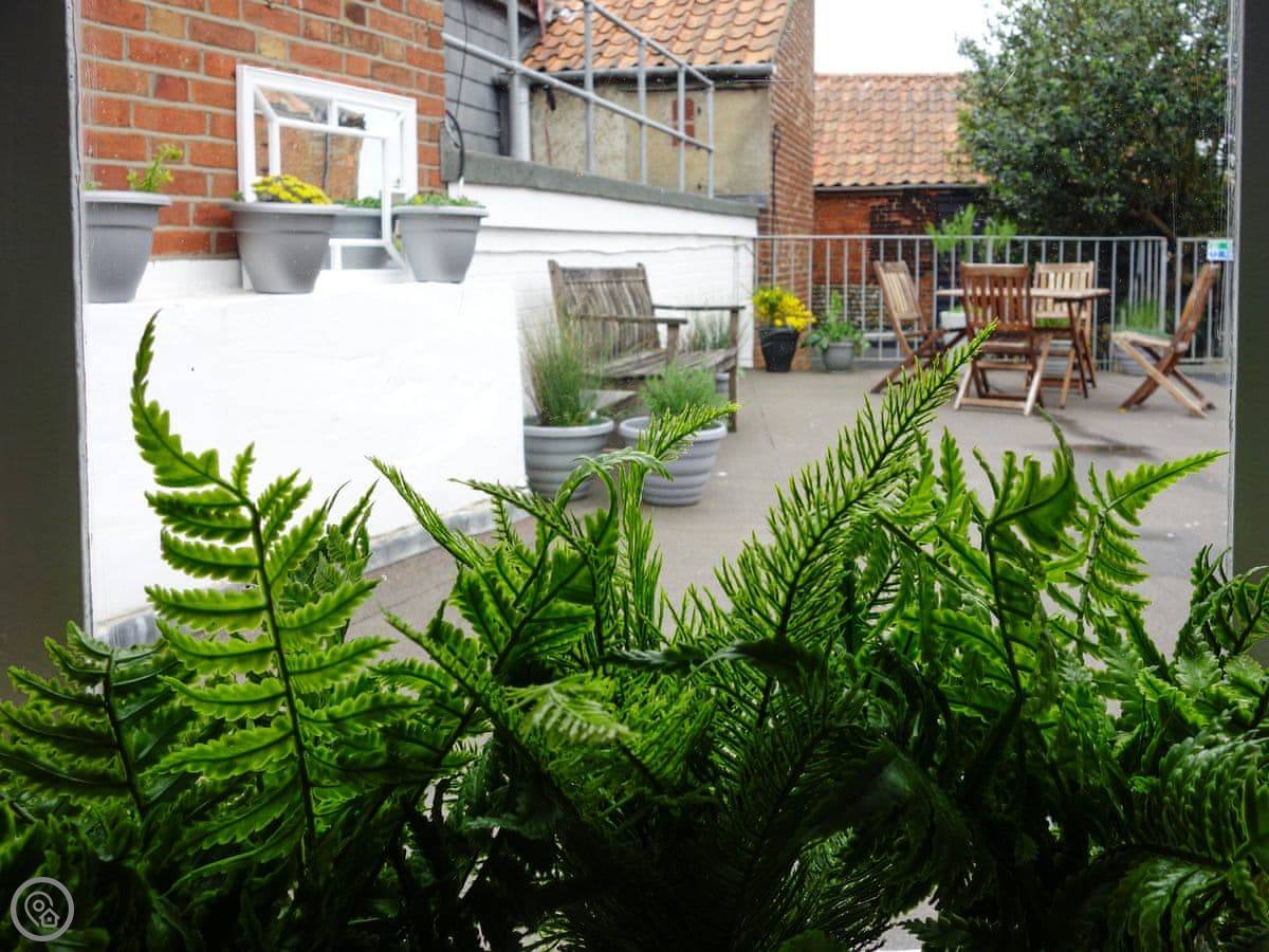 The terrace gets the sun in the morning. It's got a table and chairs. The garden is shared with the neighbours, but it's mainly just a path to the back.