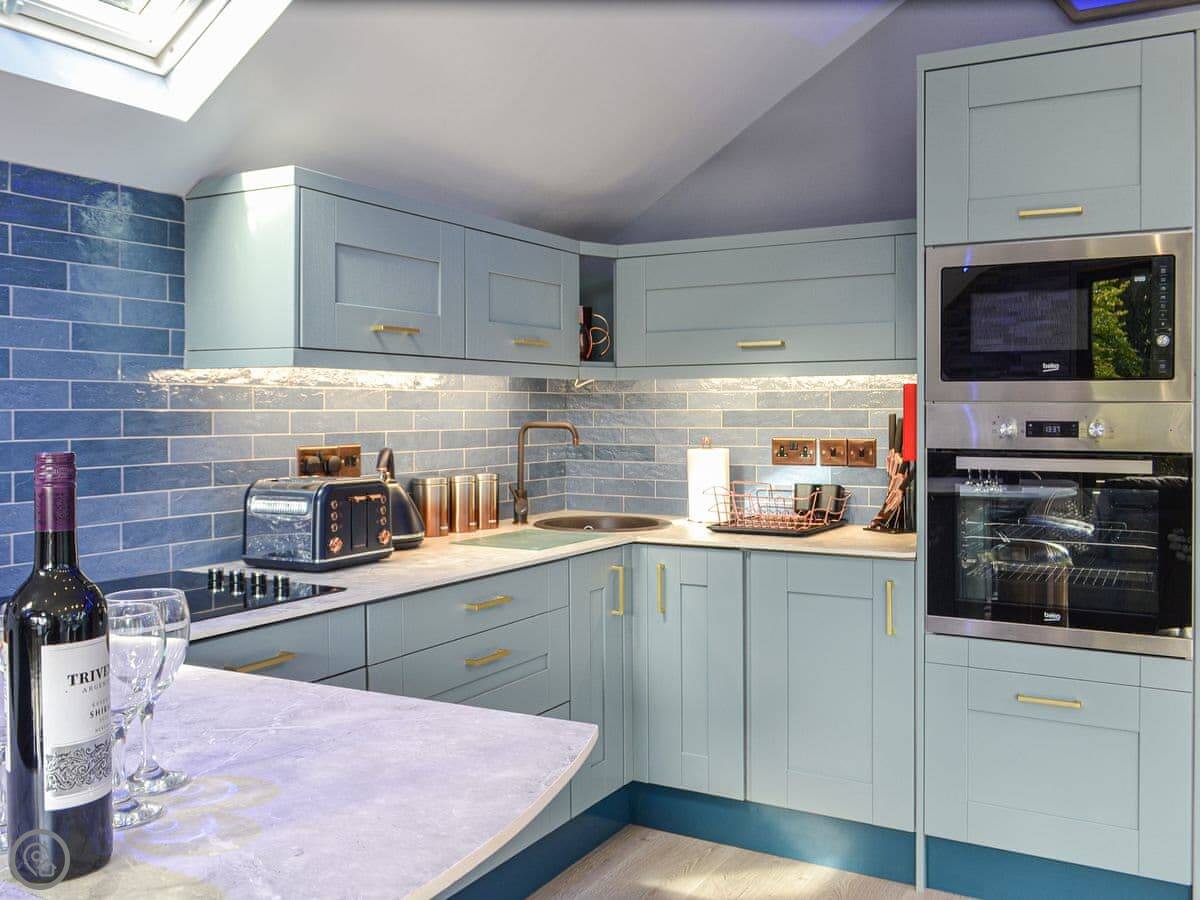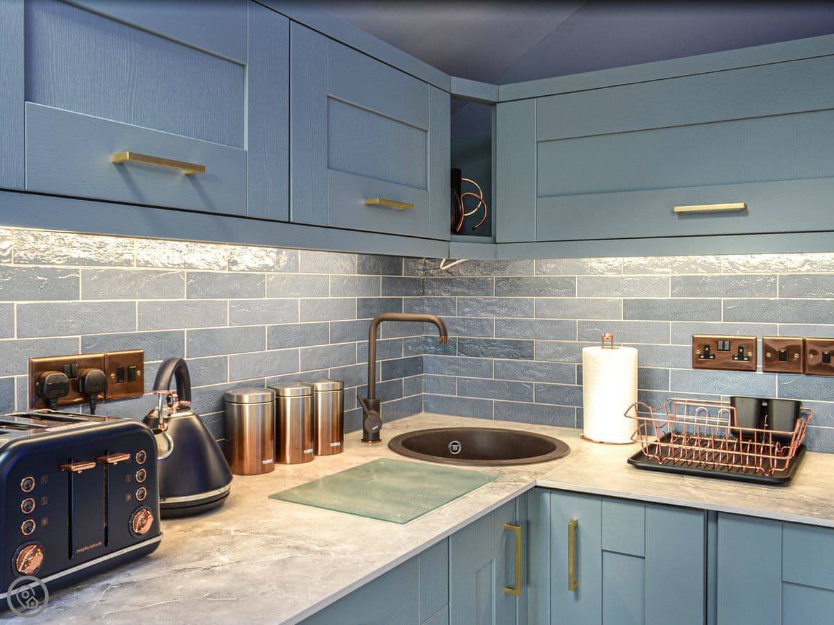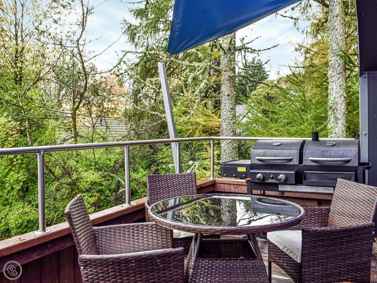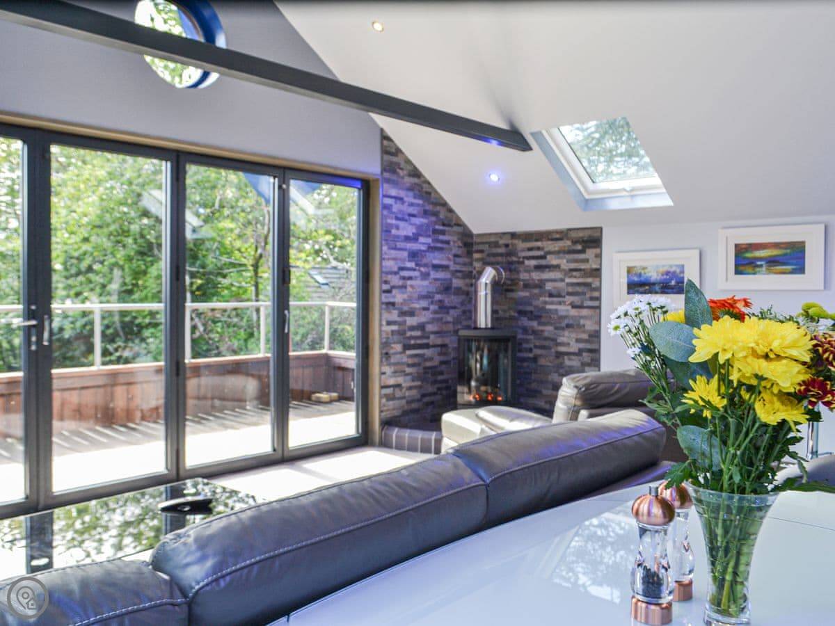The main living space is open plan, with big doors that open onto a deck. That's where the barbecue is. The deck faces south, so it gets the sun. There's a hot tub around the back. The living room has a gas stove that looks like a wood burner, a large smart TV, and one of those corner sofas that swivels. There's also a small bar area with some LED lighting.