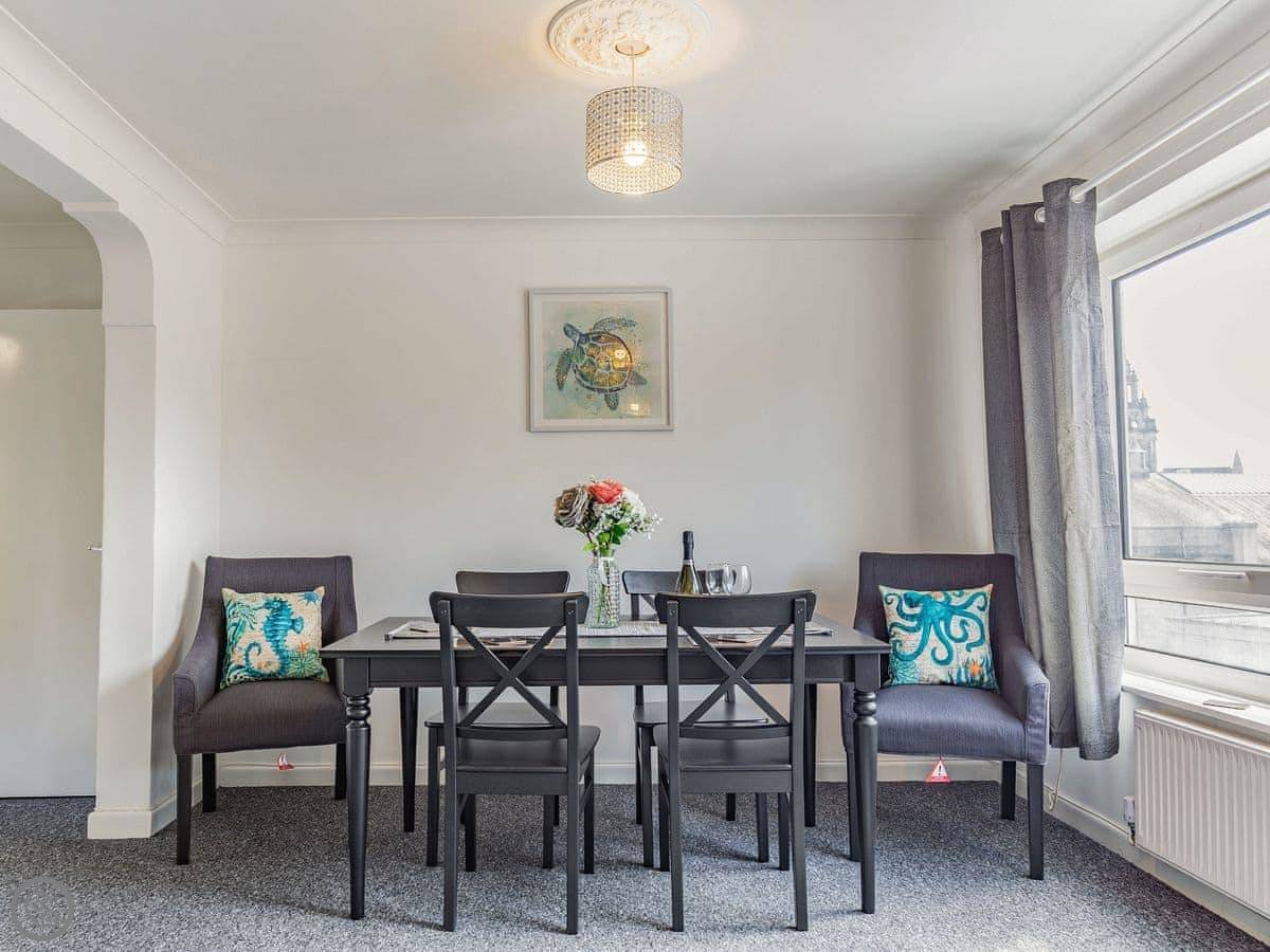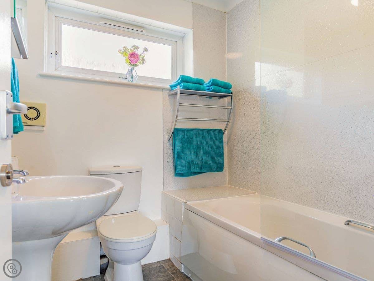 The living and dining area is all one open room on that first floor. It's a decent size and gets the light. The kitchen there has been recently done up and has what you'll need. Up another flight of stairs to the second floor is where the bedrooms and the bathroom are. All the beds are zip and link singles, so you can have them as singles or push them together into super king doubles. That makes it work for different groups. The bathroom has a bath with a shower over it.