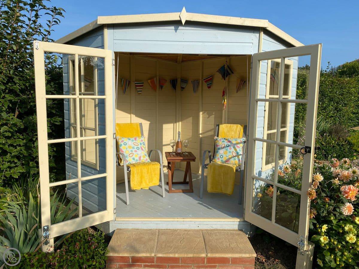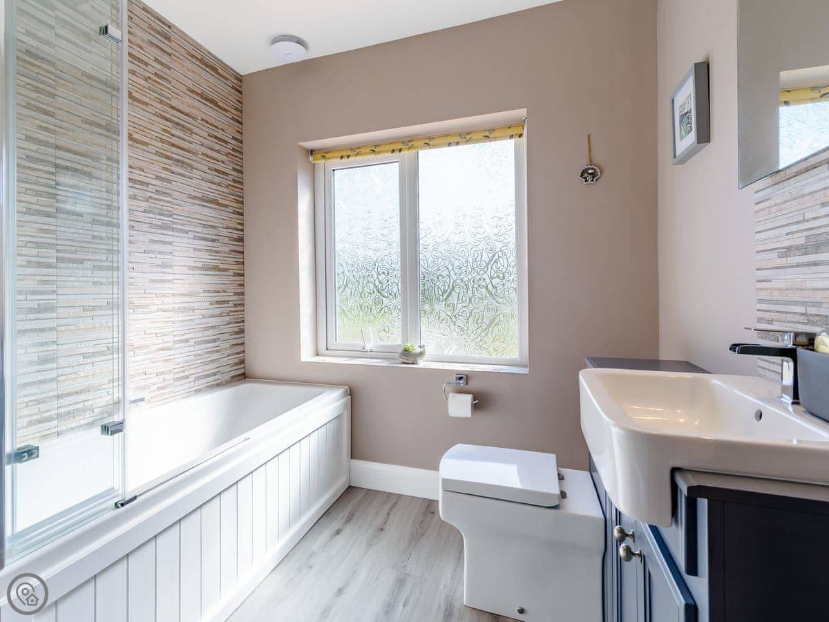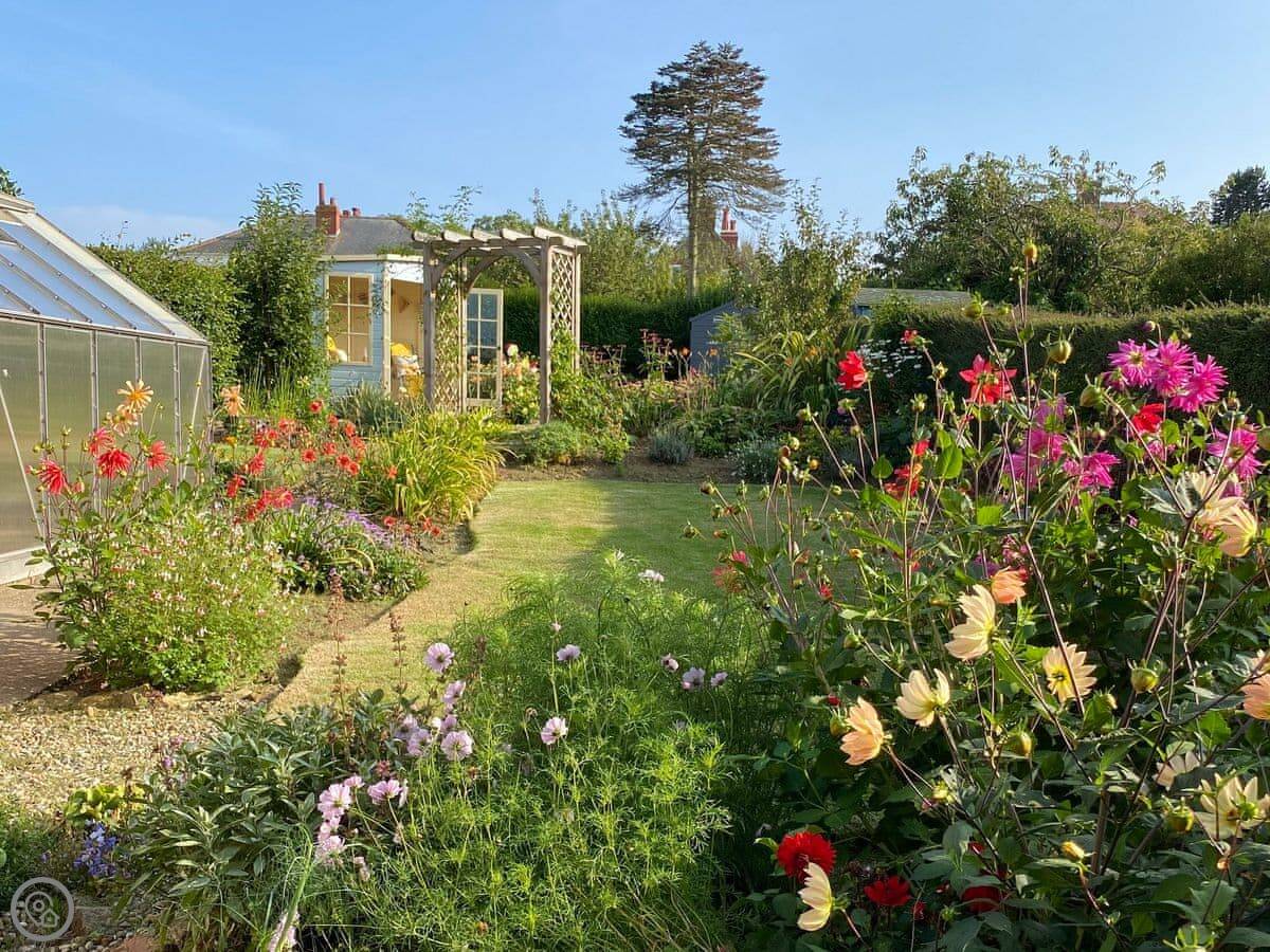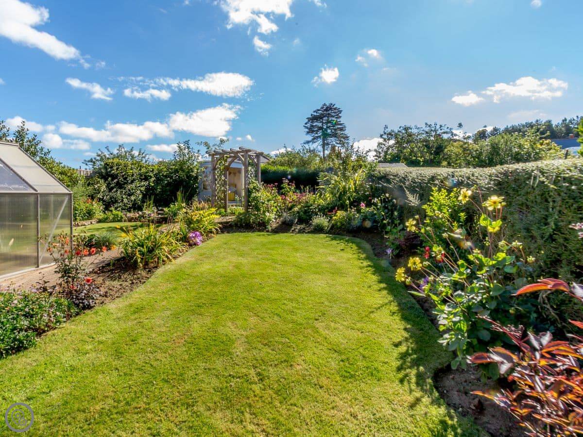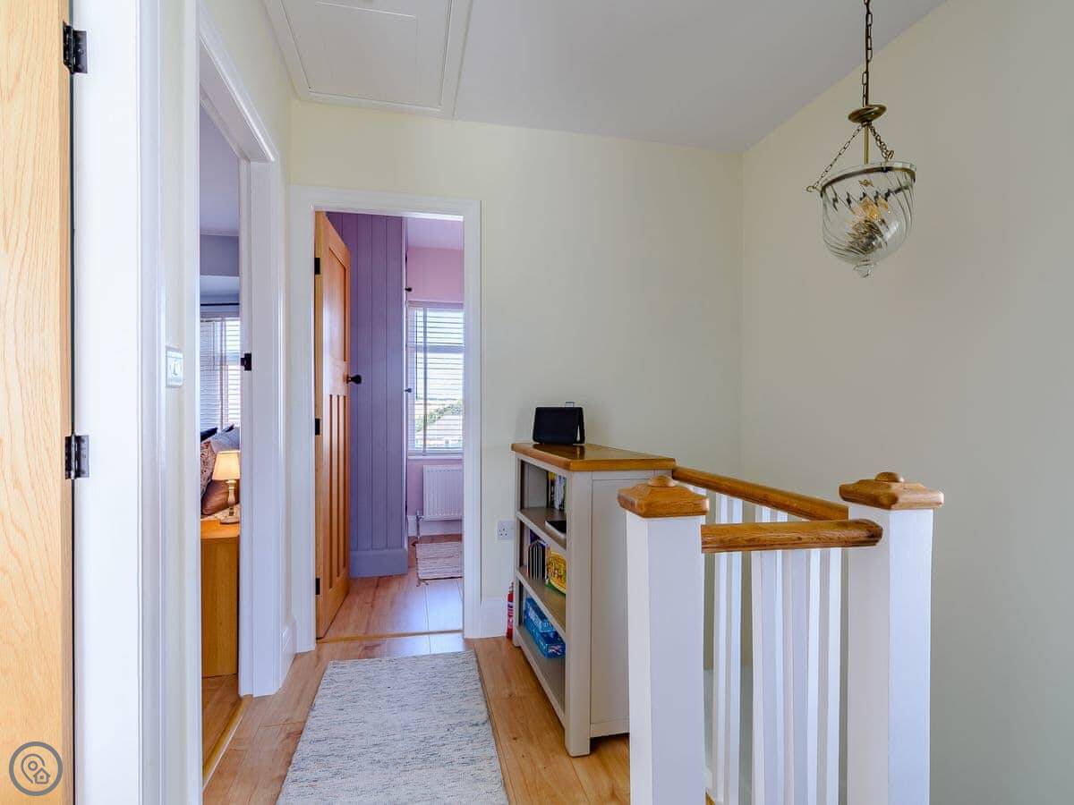 Sea Fever is a fabulous holiday cottage sure to make your holiday one to remember. Beautifully furnished throughout, with careful attention to detail, it has a long private driveway so that you can conveniently park on your doorstep. Inside you step into the hallway which branches out into the rooms. At the front you have the beautiful living room with sofas around the wood burner. There’s nothing like getting cosy in front of real crackling flames. The kitchen is at the rear of the property, with French doors looking out into the stunning garden, which is bursting with colour in the summer. The kitchen has lots of character, with sweeping wooden work tops, table and chairs for a comfortable family dinner and a range cooker beside the feature fireplace. This is a great social space for enjoying meals together, or even having a games night. On sunny days why not dine al fresco in the garden, enjoying the beautiful flowers which are a haven for bees and butterflies. There is a summerhouse out on the lawn, with seats so that you can sit out peacefully in the garden, with only birdsong to break the silence. Also outside you have a utility room adjacent to the kitchen, which is ideal for washing towels and drying wetsuits after a day out at the beach. The ground floor is complete with a convenient toilet. Upstairs you have the family bathroom with a shower over the bath. There are three bedrooms, each room has built in wardrobes for all of your belongings.
