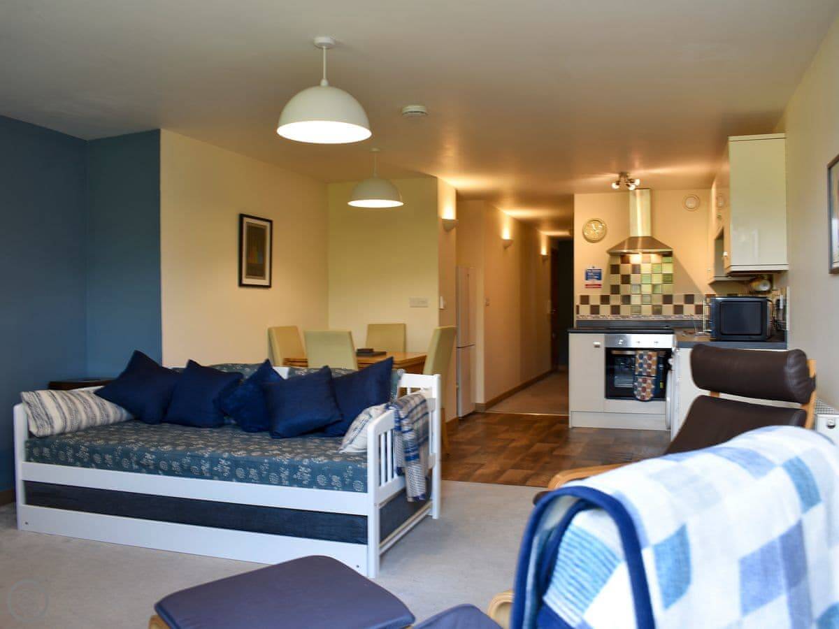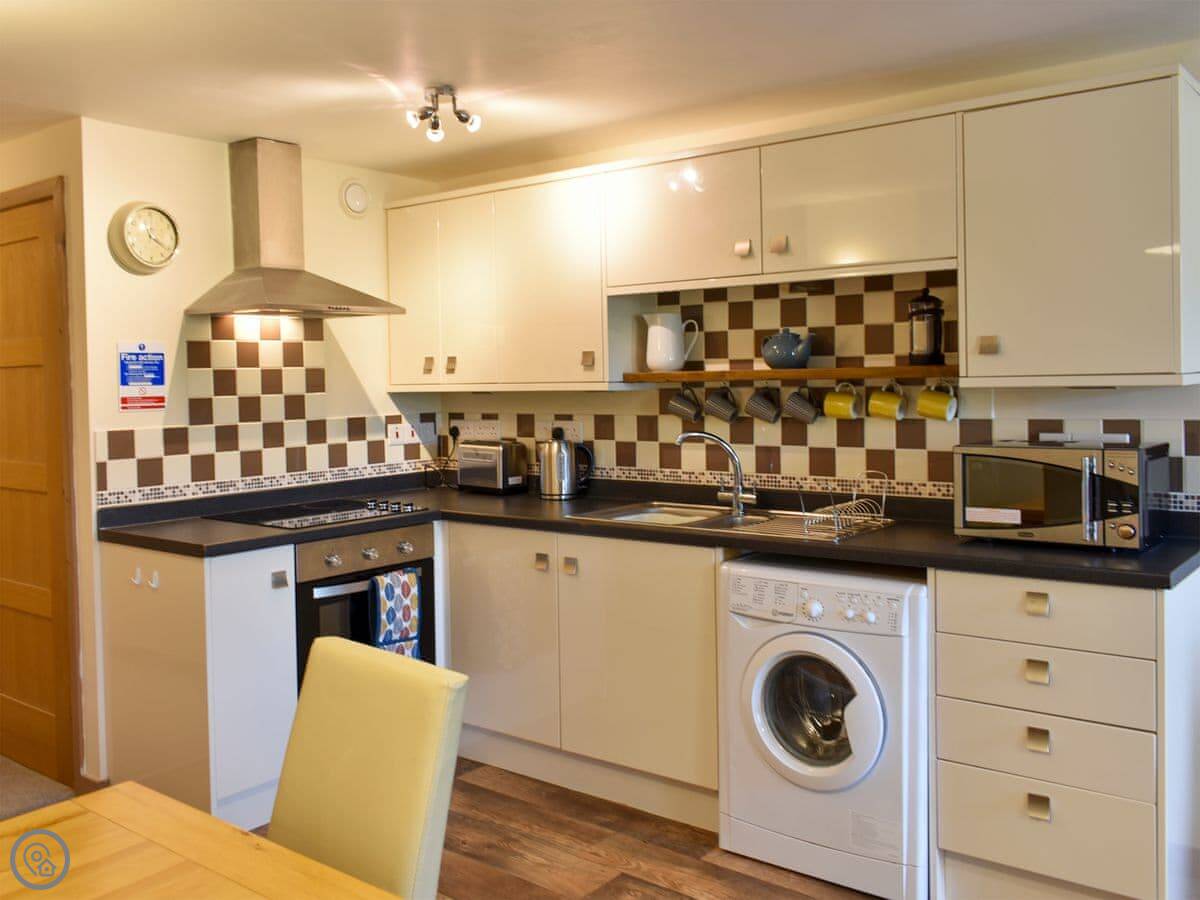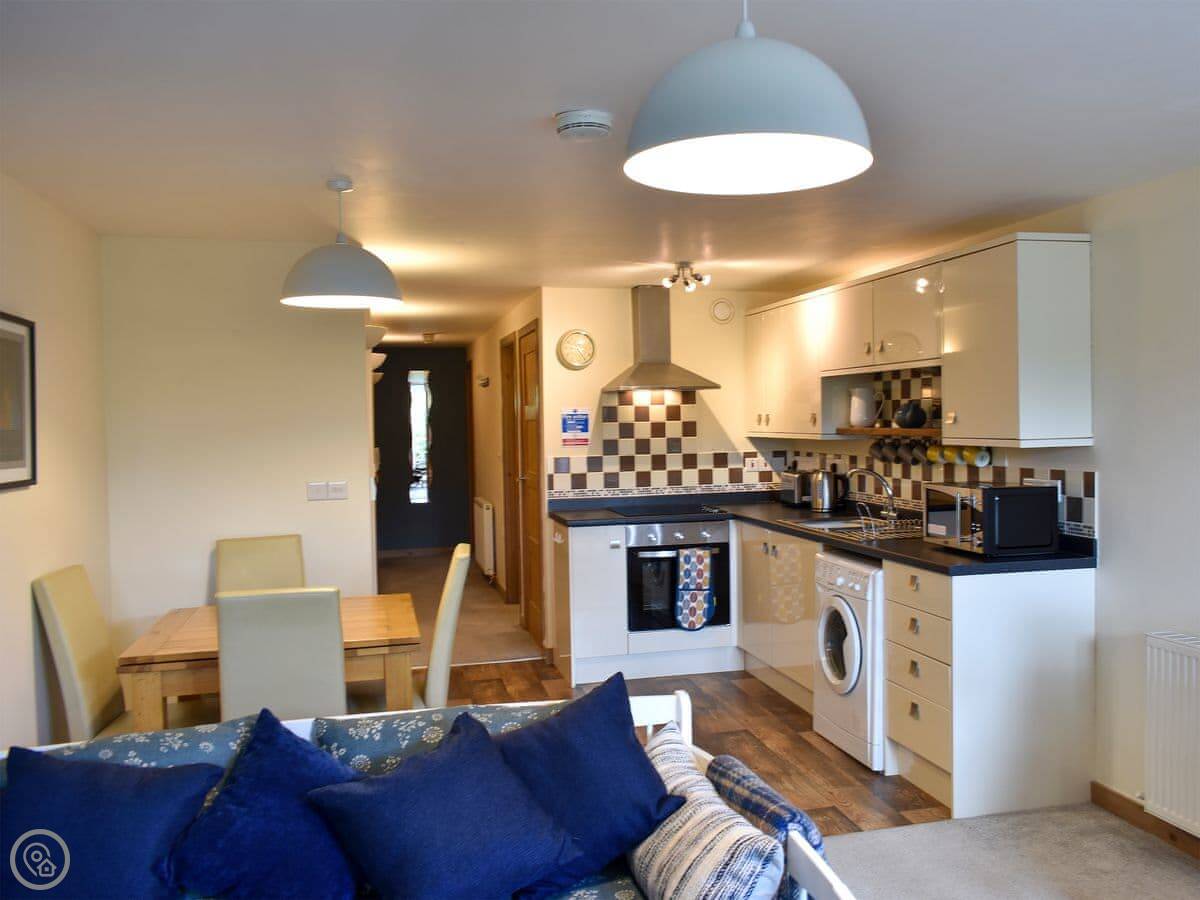 The design is open plan downstairs. The front door and the bathroom are both wheelchair accessible. There's a washing machine, WiFi, and towels and bedding are provided.
