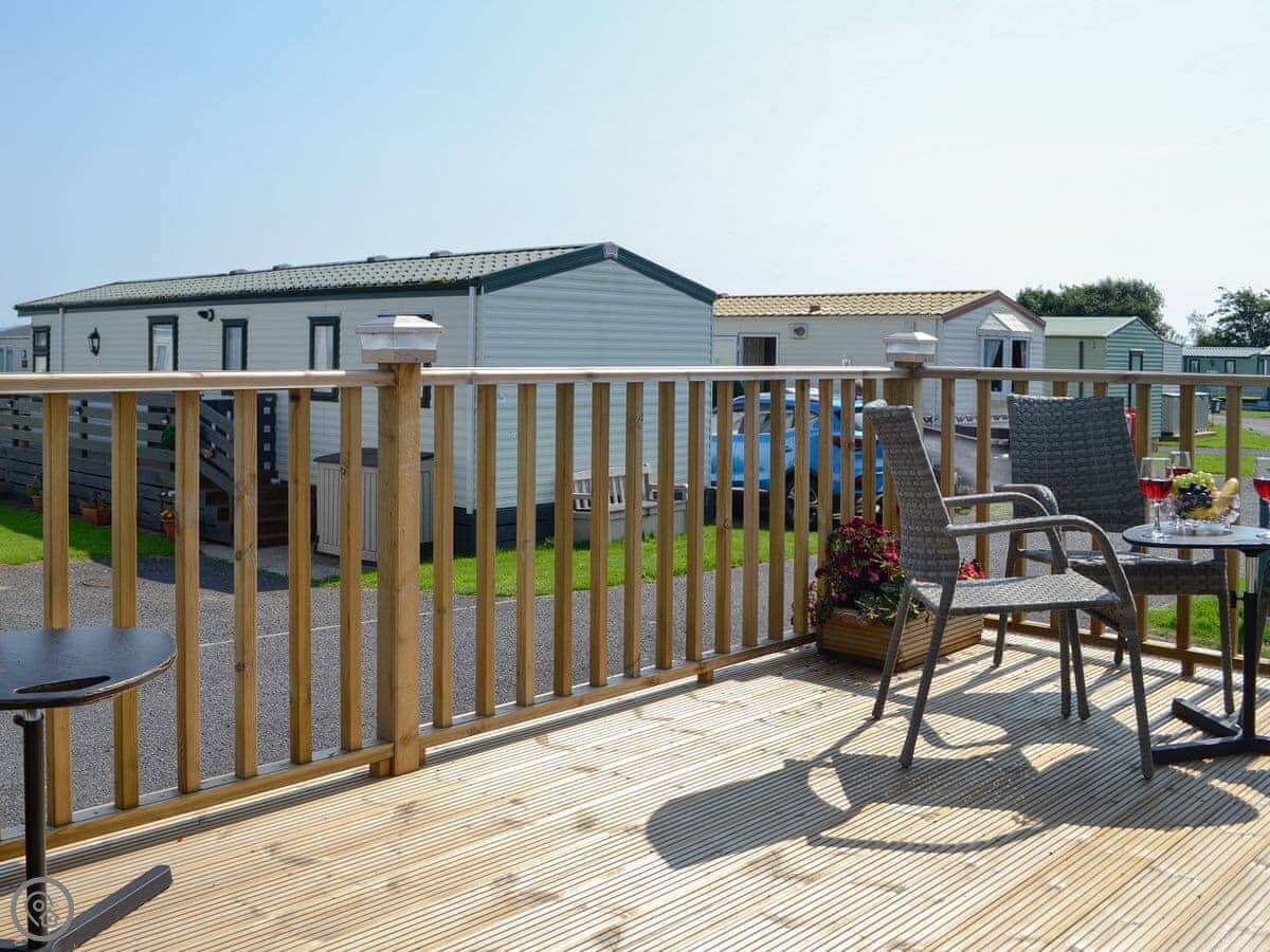 The decking outside gets the sun in the morning and下午. There's a table and chairs out there. The park itself is family-run. There's an indoor pool, a soft play area for kids, and a bar and restaurant on site. The bar does food.