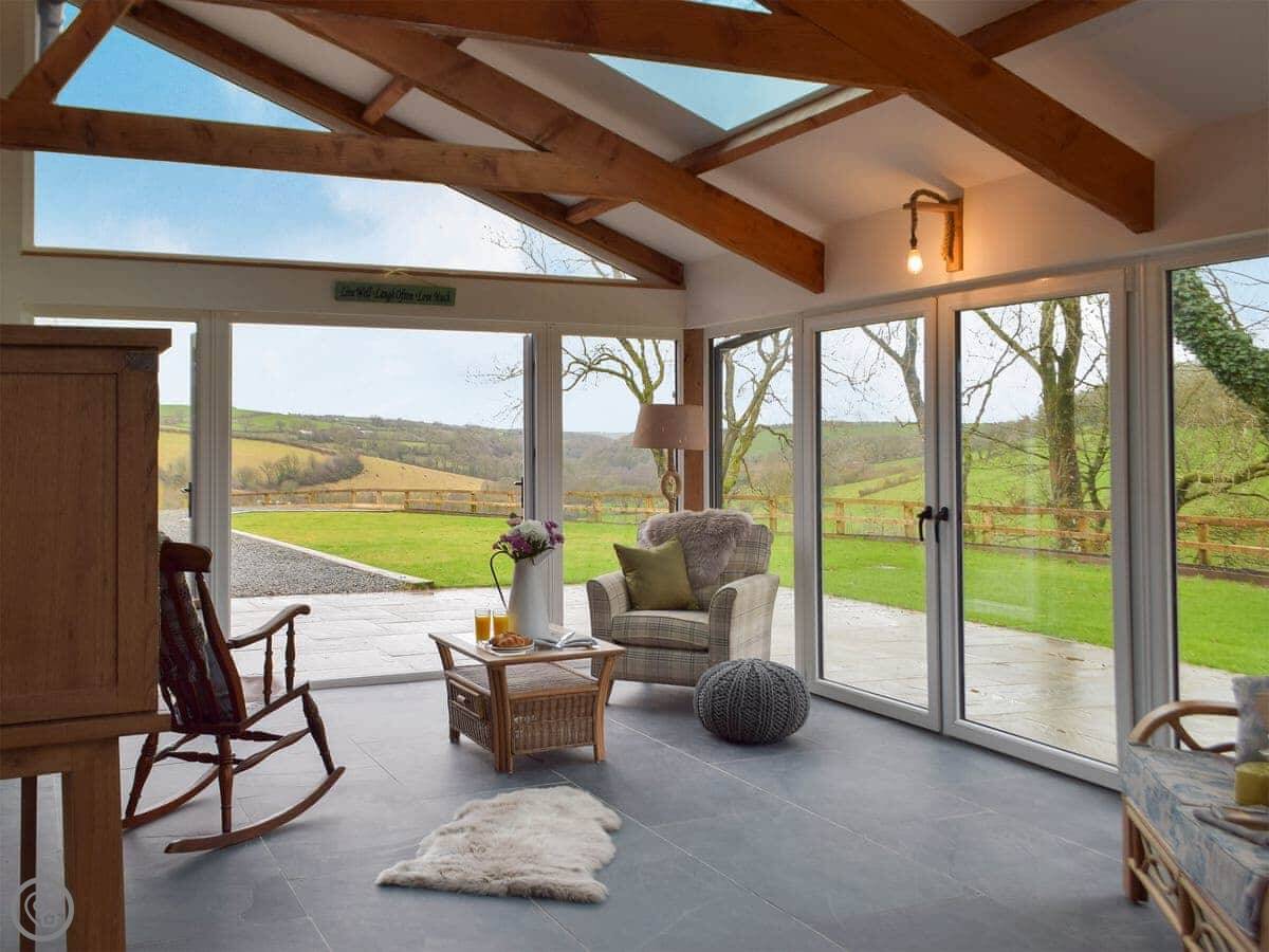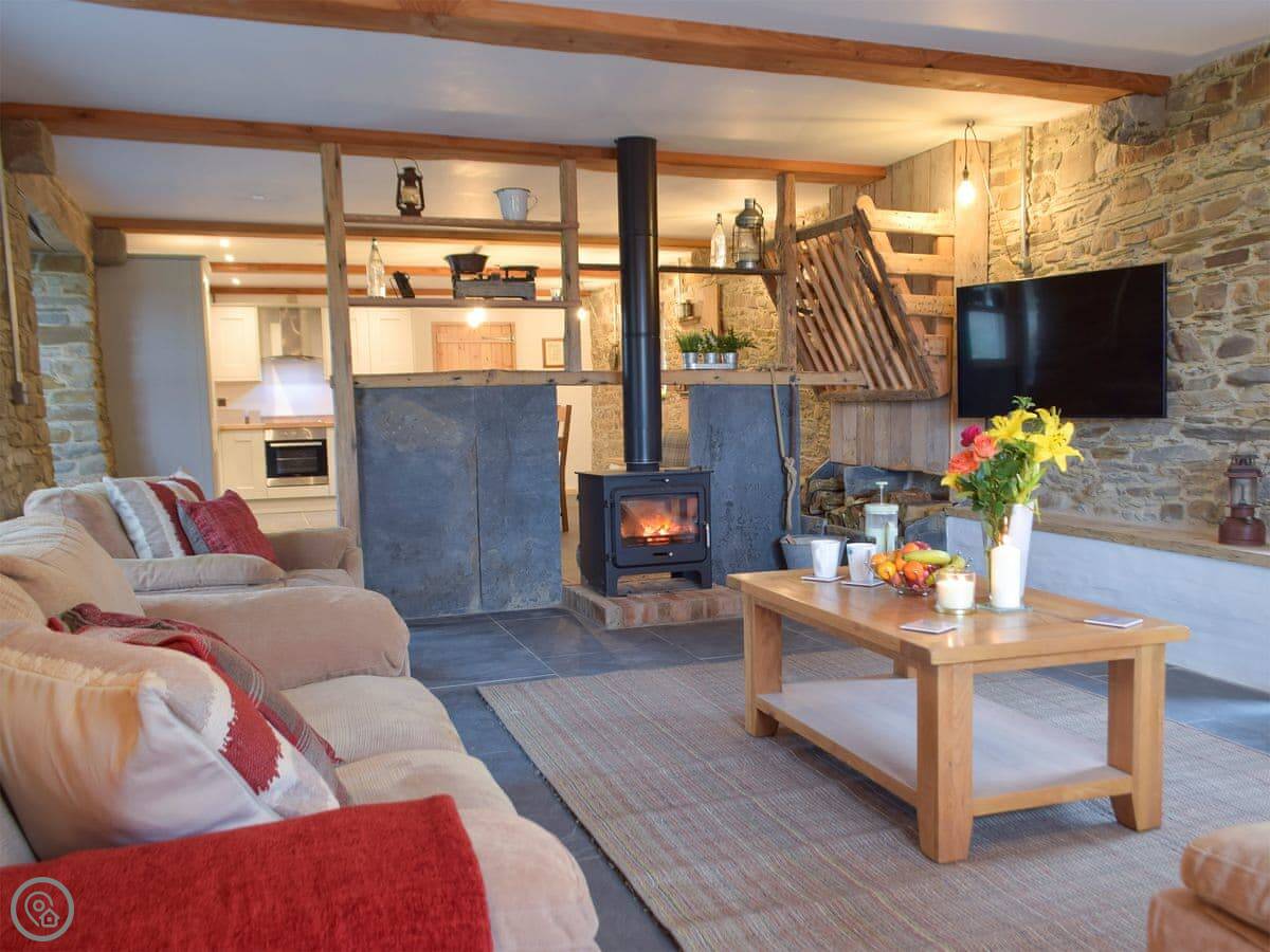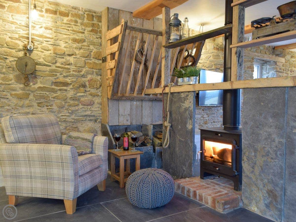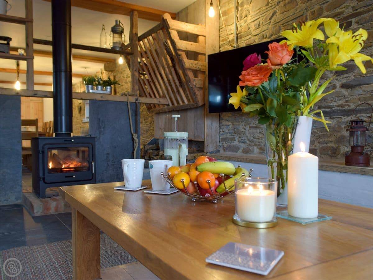 Inside, it's one big open space on the ground floor: kitchen, dining, and sitting area. There's a wood burner. The old hay feeder from when it was a barn is still there, in the living area. The sunroom doors open straight out to the patio and the hot tub.
