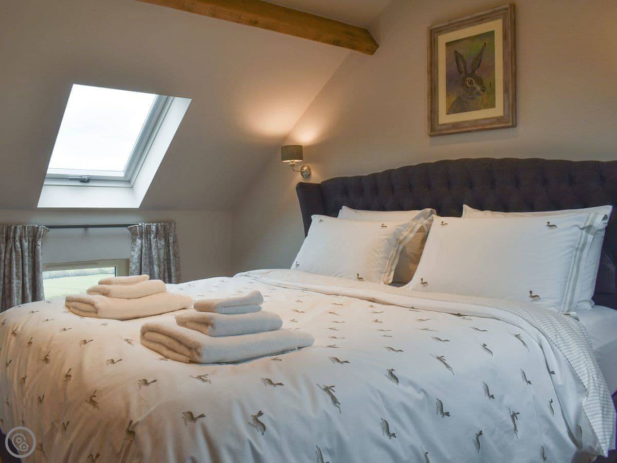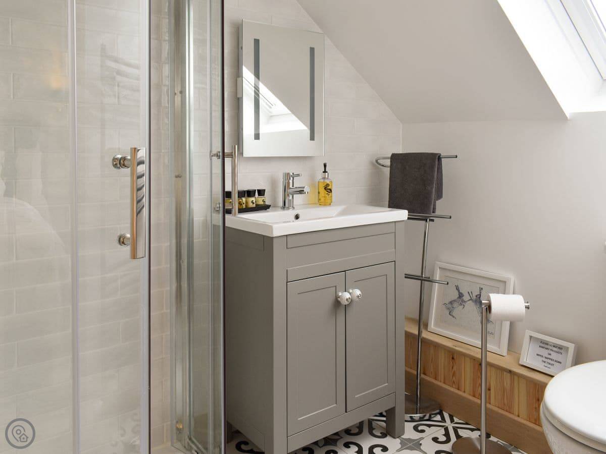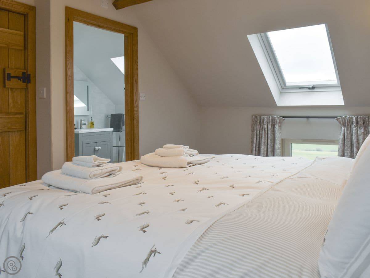 Upstairs is the bedroom with a kingsize bed and an ensuite shower room. The stairs are a proper wooden cottage staircase, so they're a bit steep.