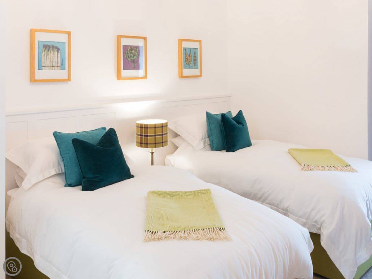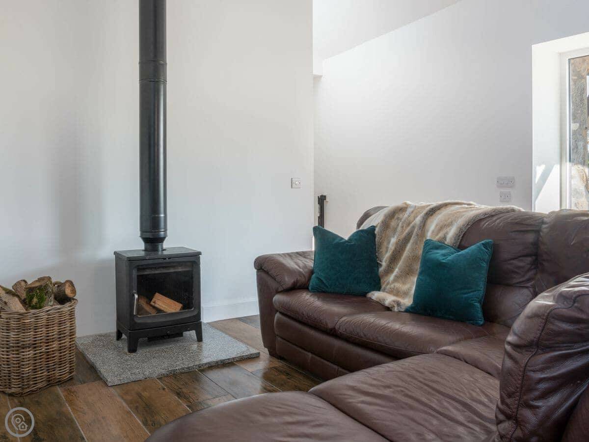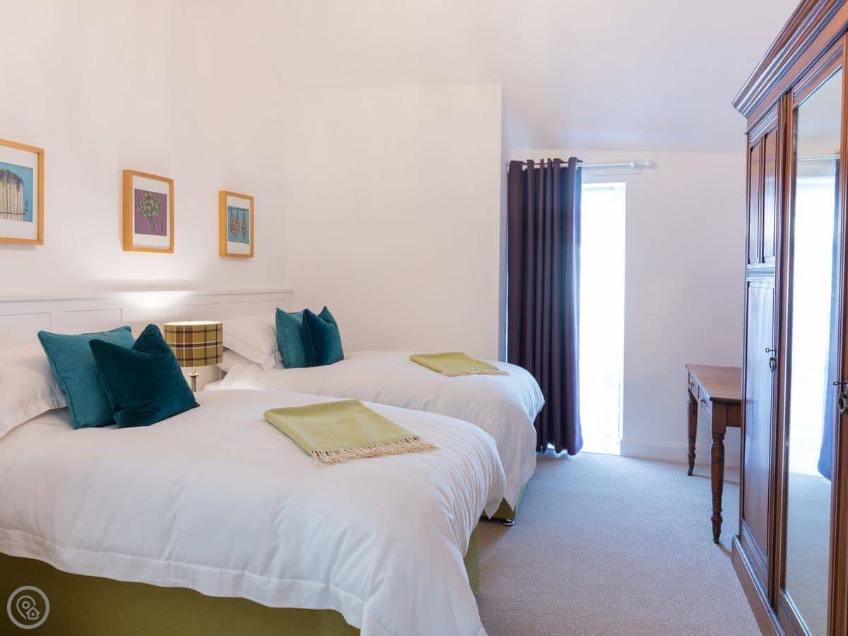 It sleeps four. Two bedrooms, both doubles, and two bathrooms. It's got the 5 Star rating, which basically means it's very well finished and everything's new. Underfloor heating, wood burner, that sort of thing.