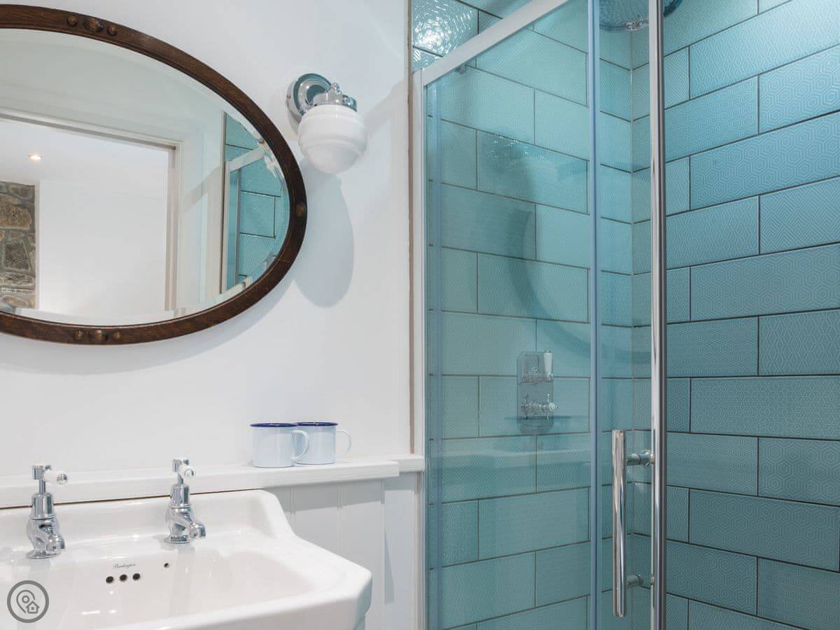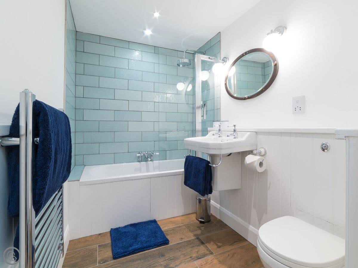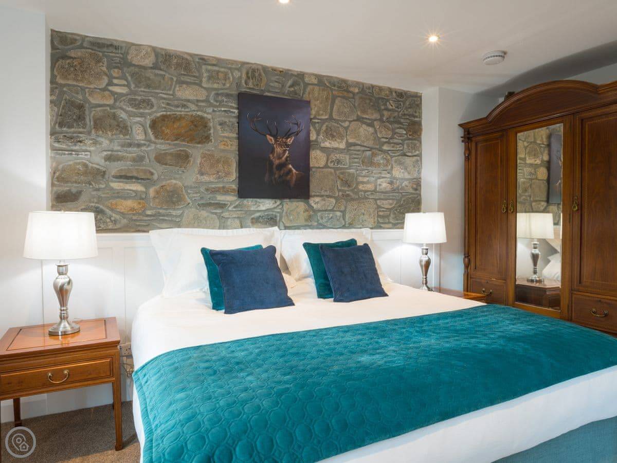 It sleeps four. Two bedrooms, both doubles, and two bathrooms. It's got the 5 Star rating, which basically means it's very well finished and everything's new. Underfloor heating, wood burner, that sort of thing.