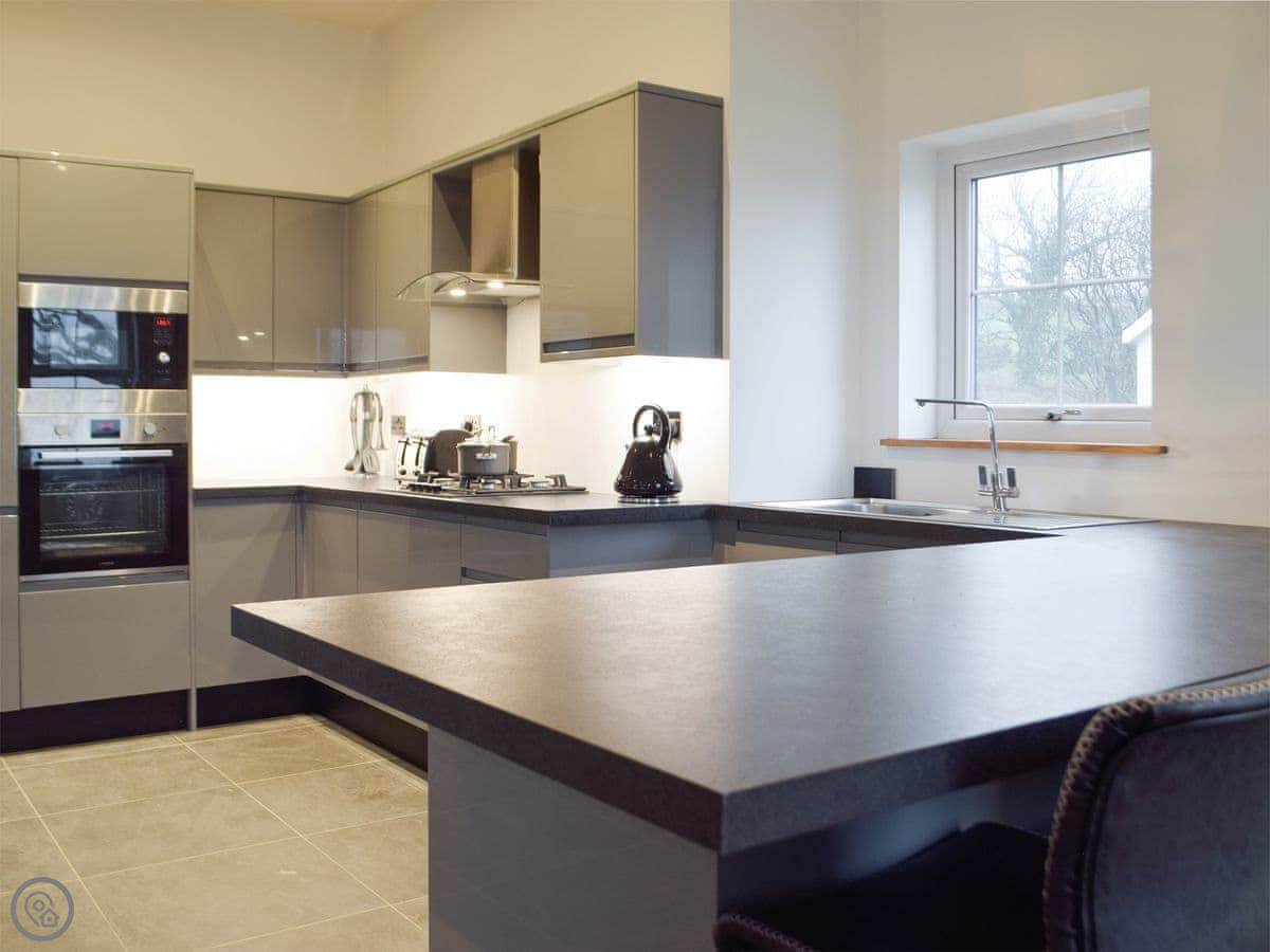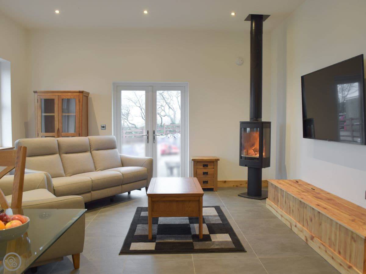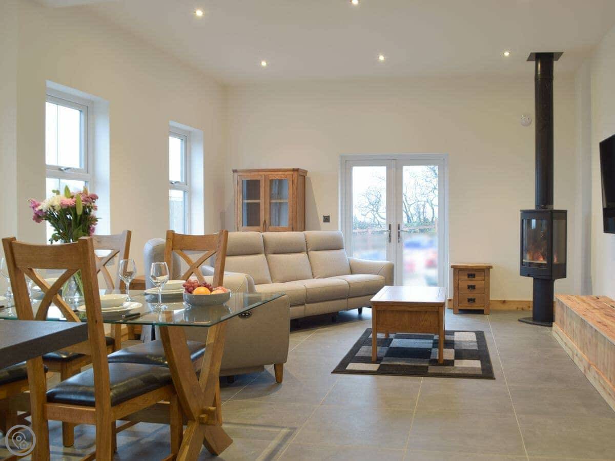 There's a kitchen, dining and sitting area all in one open plan room. French doors open onto your own patio. The hot tub is out there. The ceilings are high and there are exposed stone walls in places.