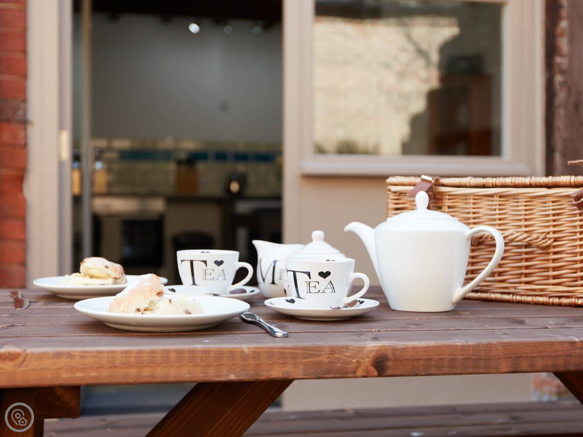 The living space is open plan, kitchen and sitting area together. It's a good size. There's a patio with a table and a hot tub. The view from there is over our fields. It's just fields, really.
