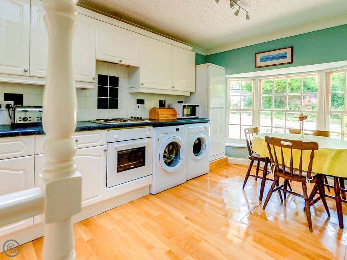 Inside, it’s got the things you’d need. Washing machine, dishwasher, WiFi. There’s a wood burner in the living room. Bedding and towels are included. We allow up to two dogs. There’s a cot and a highchair if you need them.