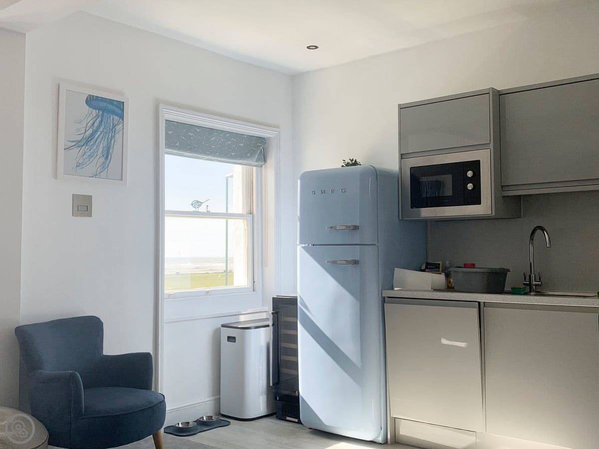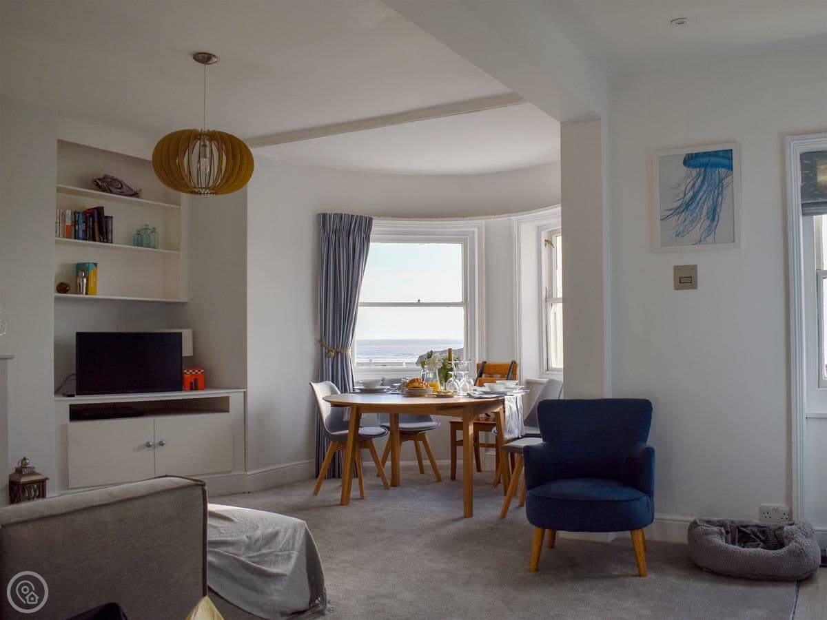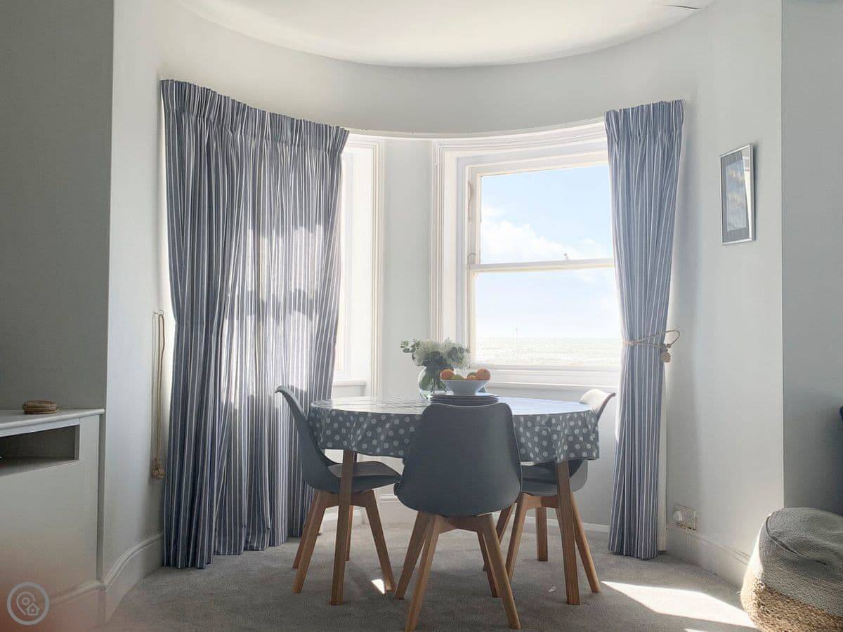 Guillemots is a seafront apartment on the first floor of an old Georgian house in Littlehampton. It looks straight out over the beach. The beach is sandy and it's about a minute's walk from the door.