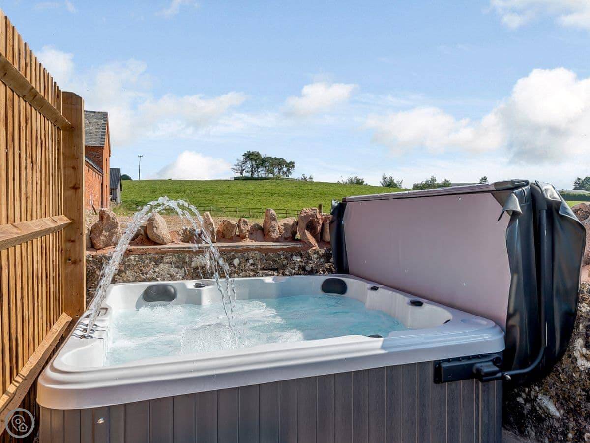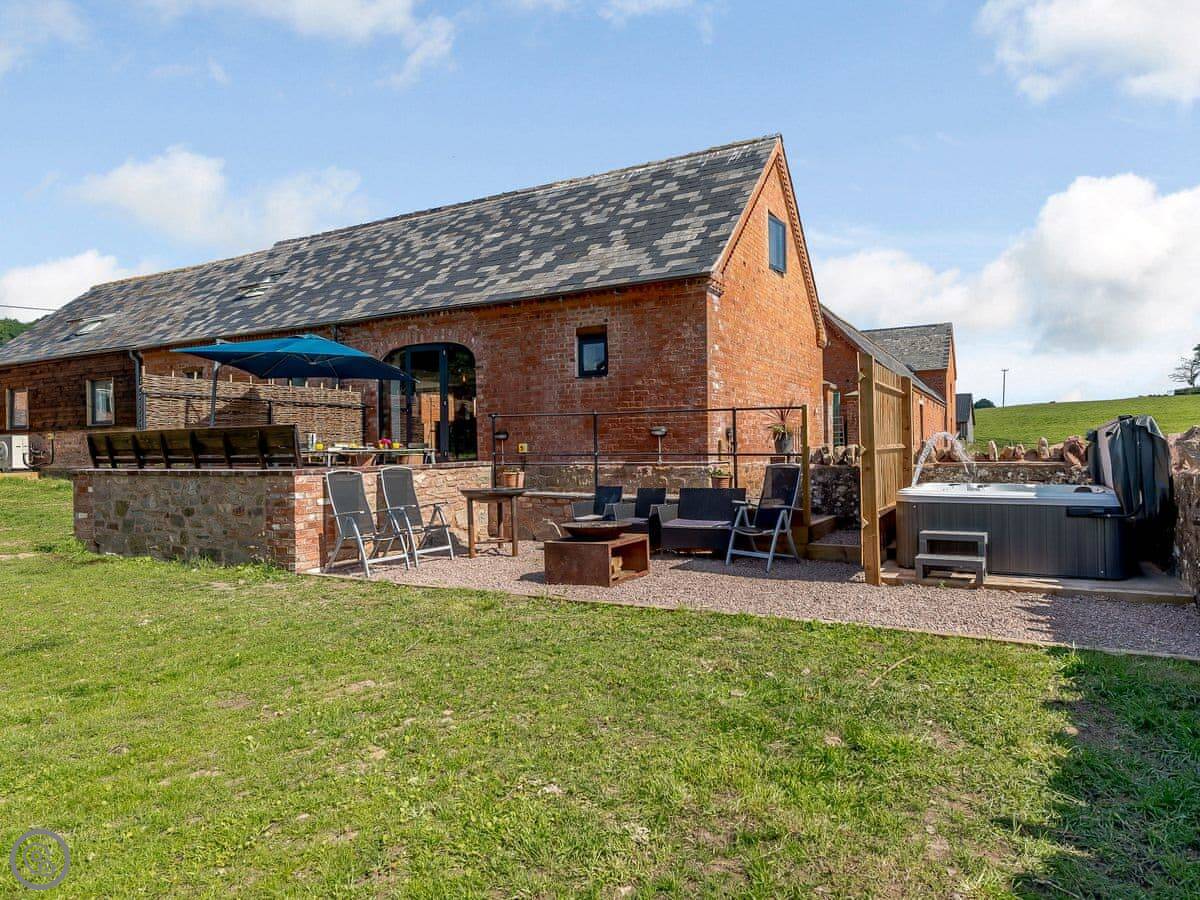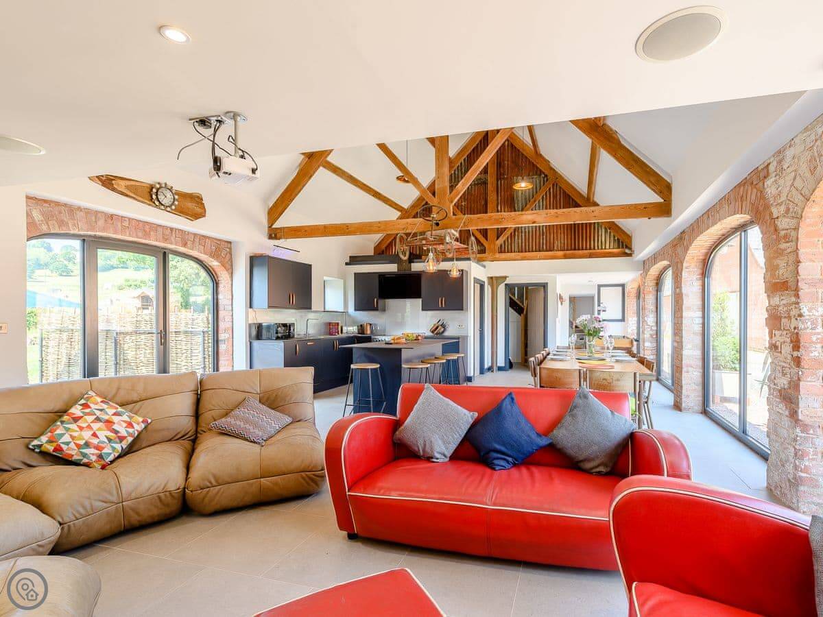 The main living area is open plan. There's a kitchen at one end, a dining table, and then sofas and a projector screen at the other. The kitchen has a big electric range. Outside, there's a walled garden with a six person hot tub, a barbecue, and a fire pit.