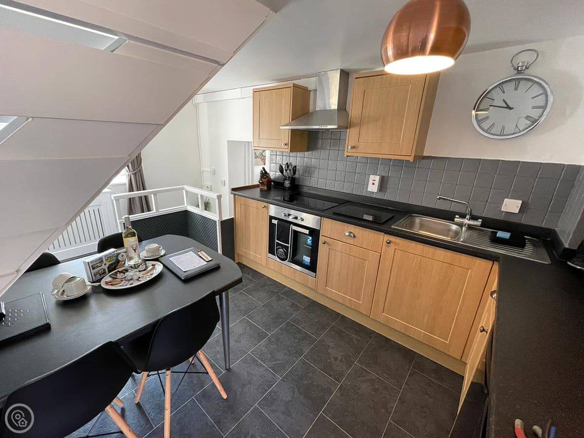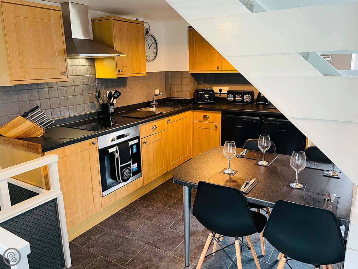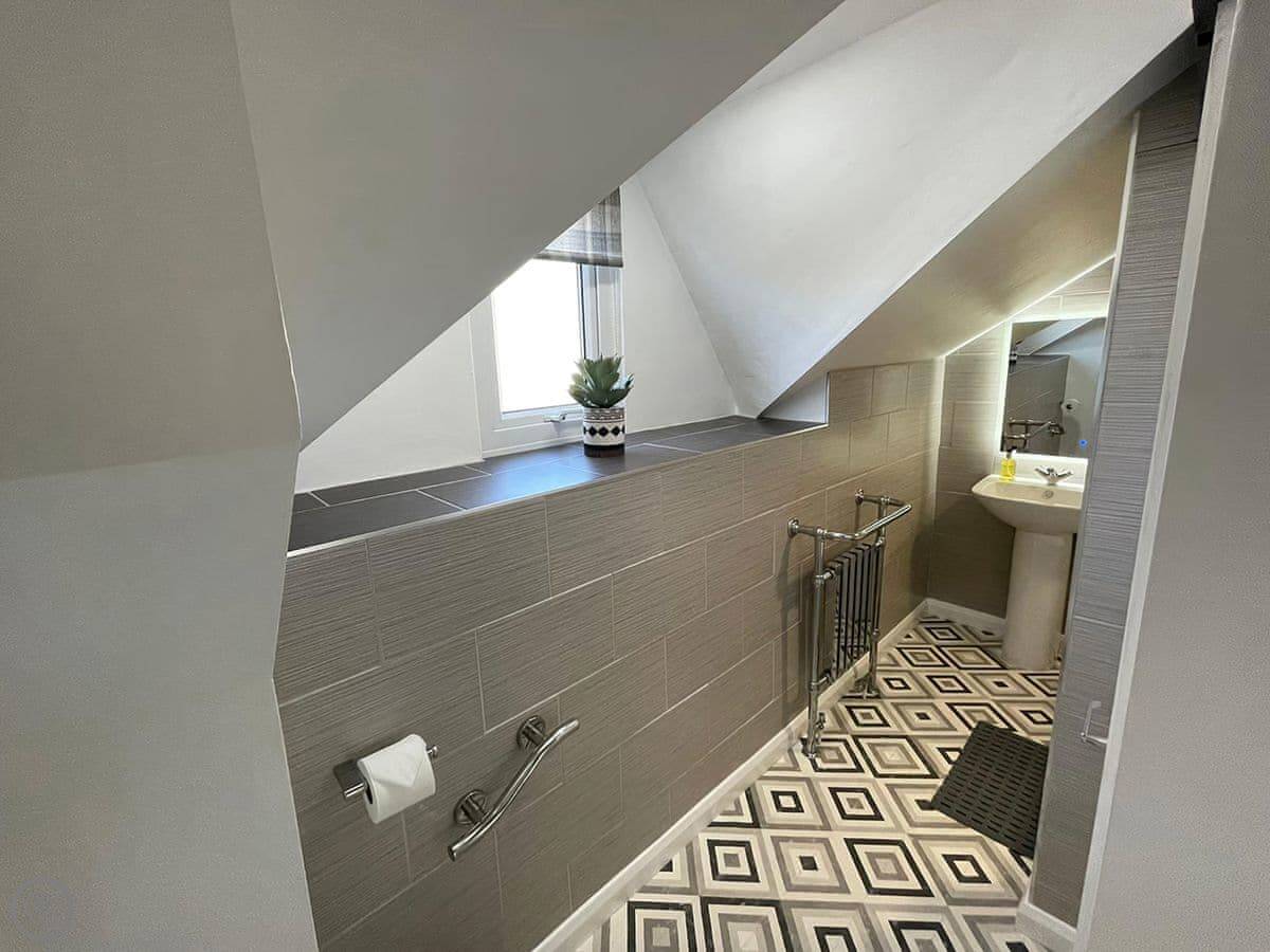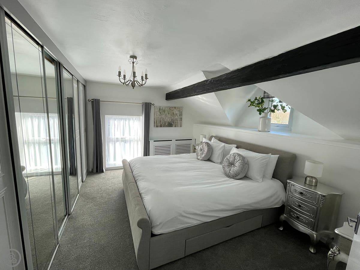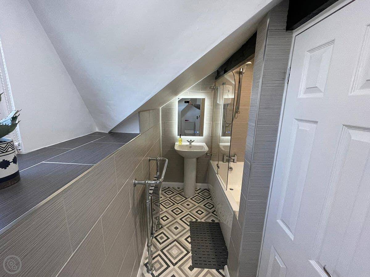 It sleeps five. Two bedrooms: one with a super king bed and another with a single bed. There's a family bathroom with a bath and a shower over it. It's got a 5 Star rating, which reflects the fixtures and fittings. It's done to a good standard.