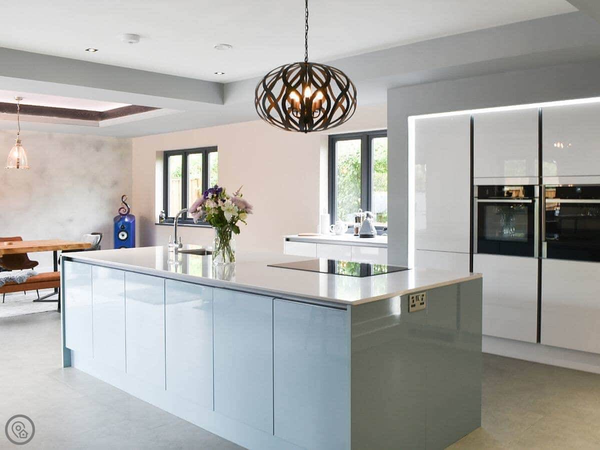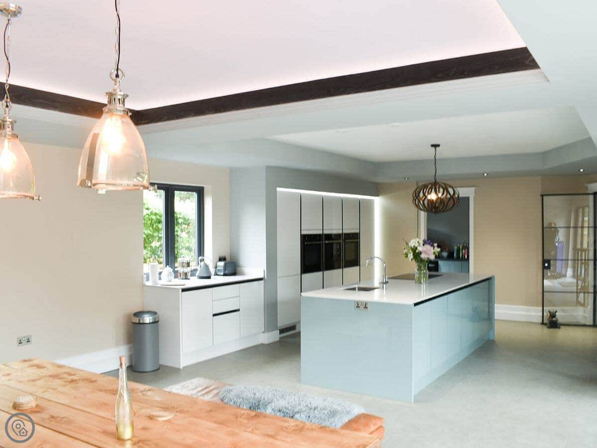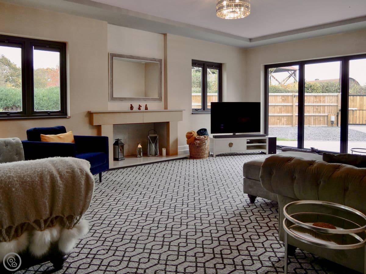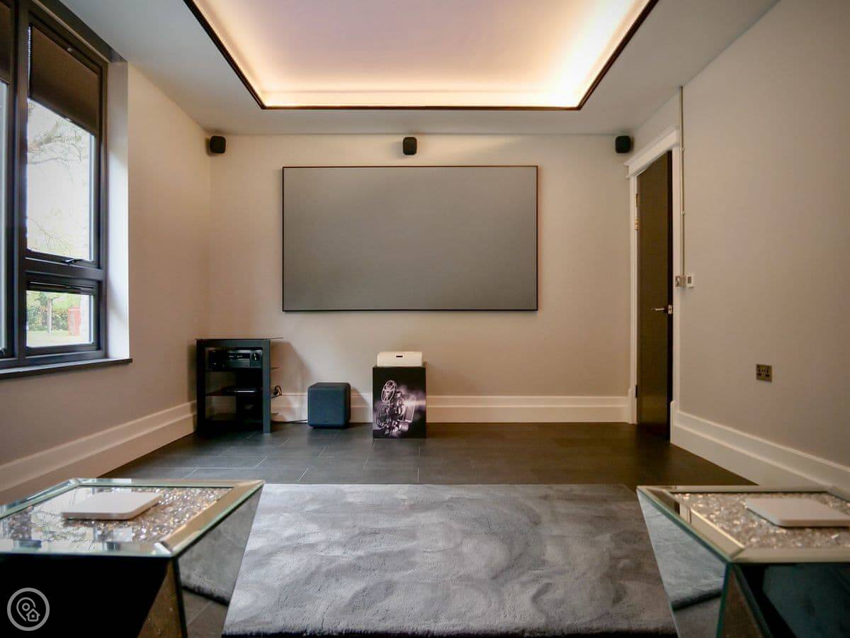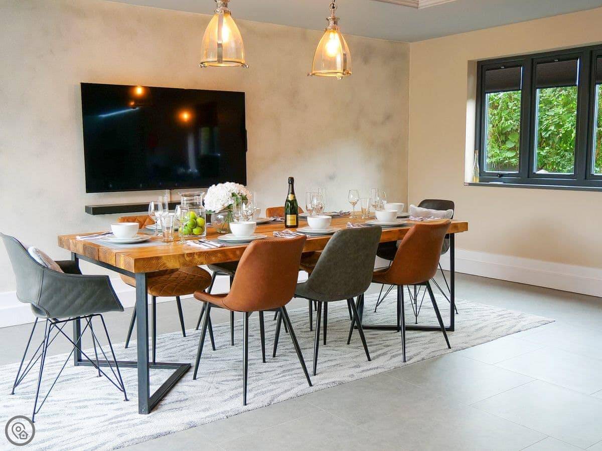 Space is an abundance, architecturally it has the wow factor and is designed to the highest standard with no expense spared. As you step through the door you are greeted by a glamorous entrance hall with a bespoke and marble staircase. Off the entrance hall you will find a formal sitting room that is triple aspect, featuring comfy seating, Smart TV, stone fireplace and log burner with bi-fold doors that lead onto the large garden. The movie buffs will be in heaven, as guests are treated to unlimited tickets to chillax in Guarlford Manor’s private home cinema. Drop the lights, pop the bubbles and rustle up the popcorn for the ultimate movie marathon with the clan. A 31ft open plan kitchen with dining area is the social hub of the house. A large central island makes for a great spot for chopping and chatting whilst you knock up some culinary delights. The dining area features snazzy recessed lighting, great for a more intimate dinner parties that require a little mood lighting. A useful utility is found just off the kitchen as well as a downstairs cloakroom with toilet.