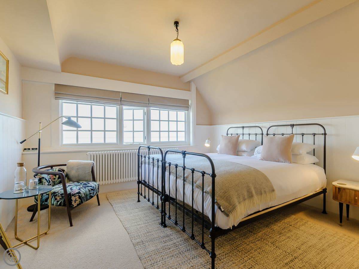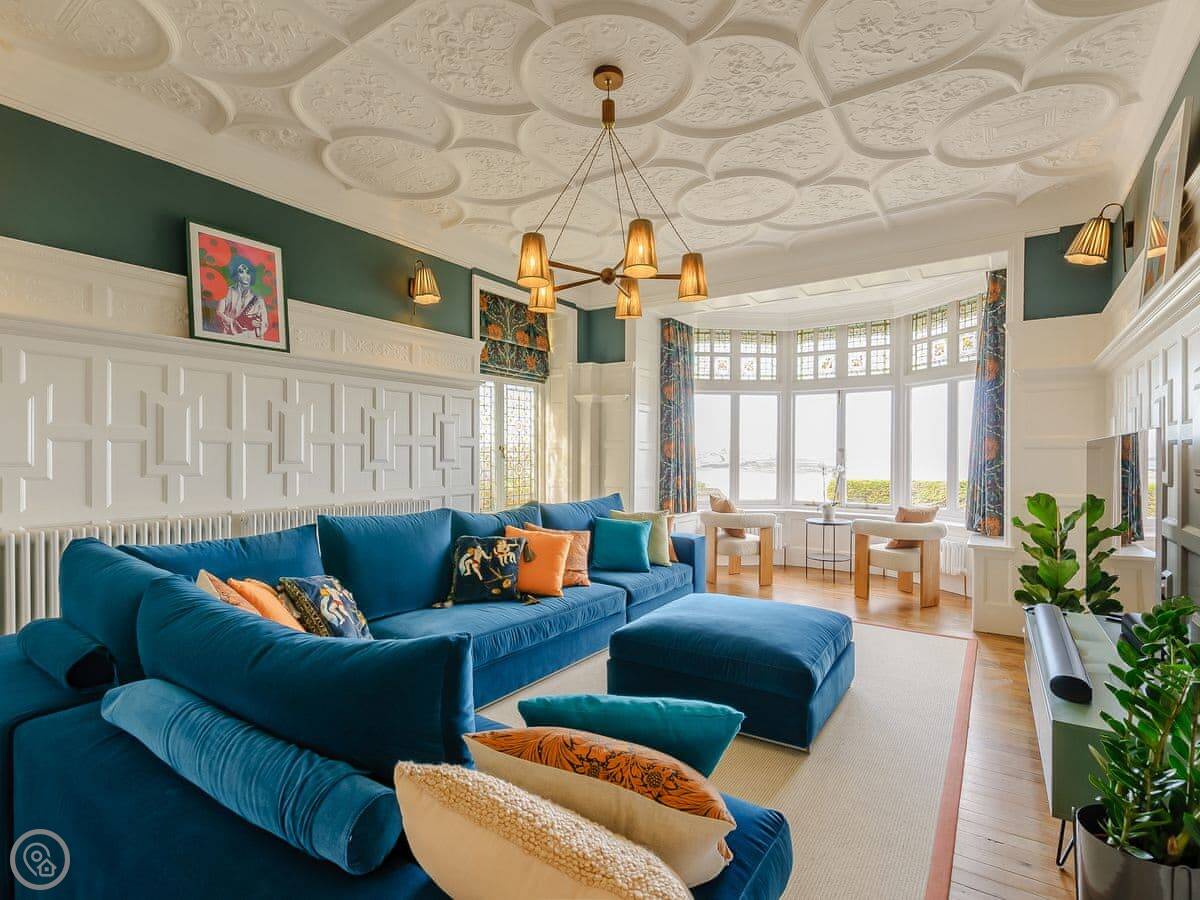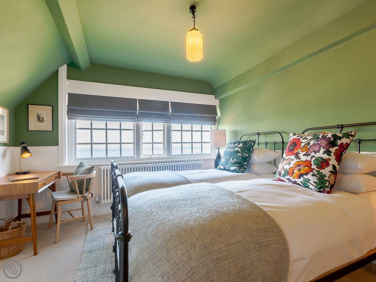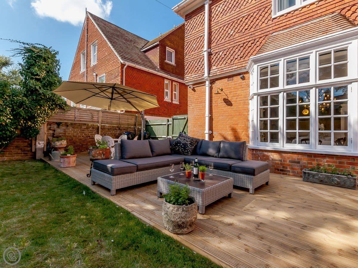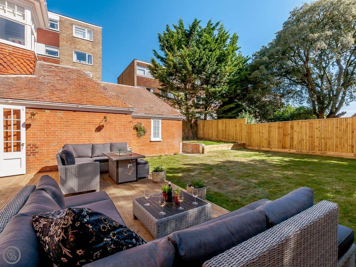 The house faces west over the bay. You get the sunset from the front rooms. The front garden is paved, good for sitting out. There's a bigger garden at the back.