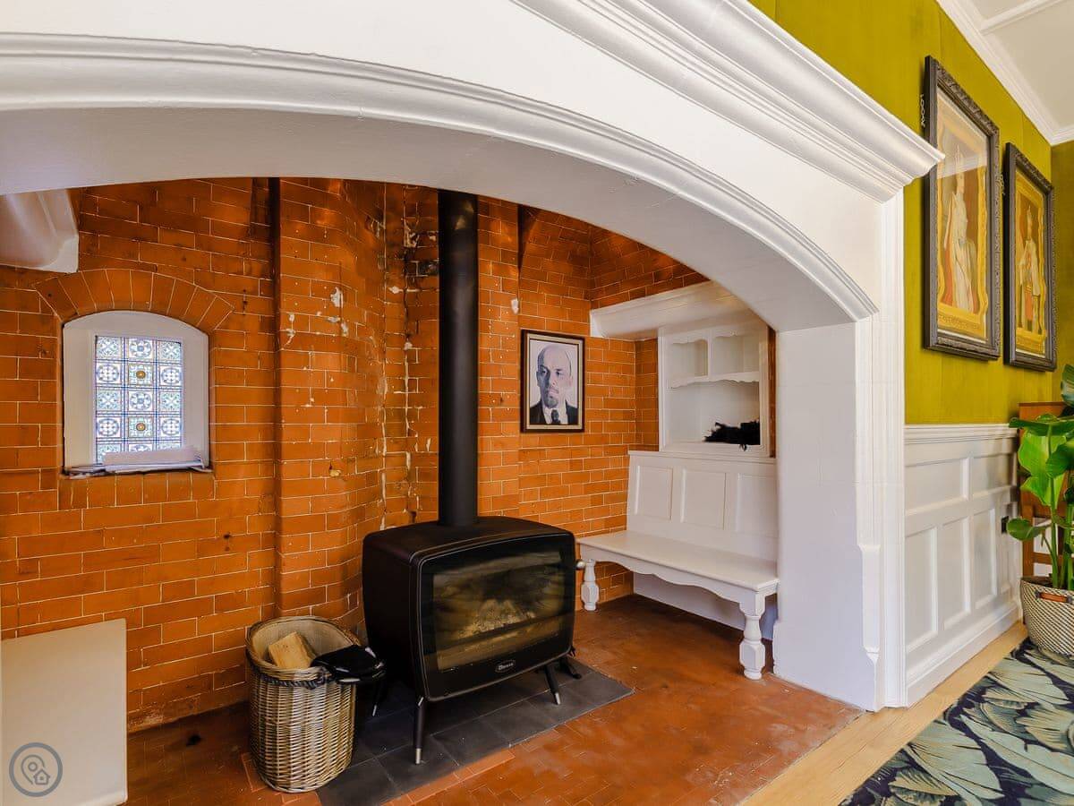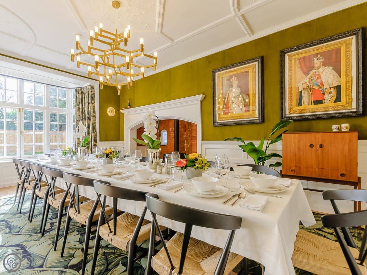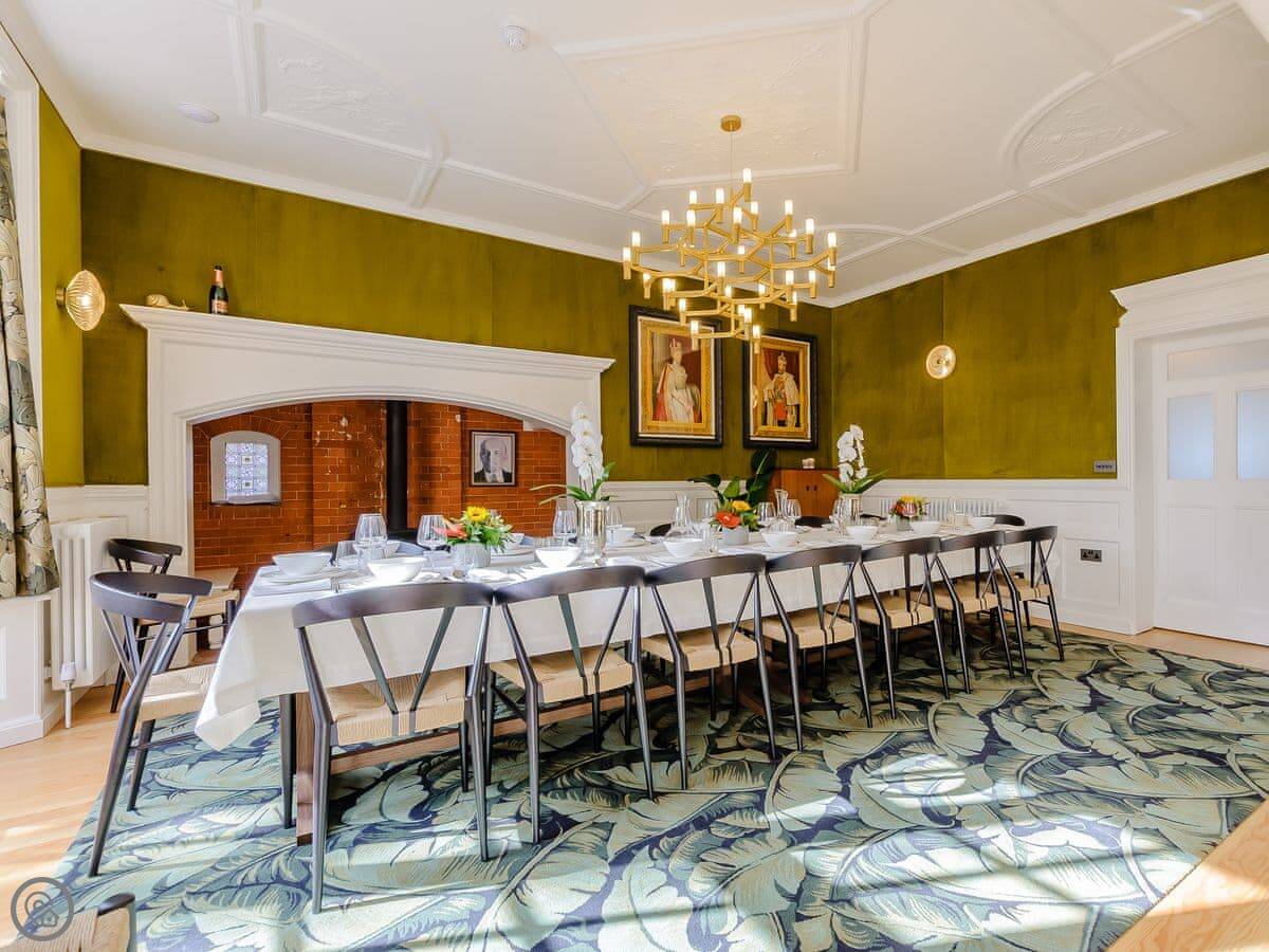 Inside, there's a big dining room with a large fireplace. The kitchen is modern. There's parking on the drive and an electric car charger.