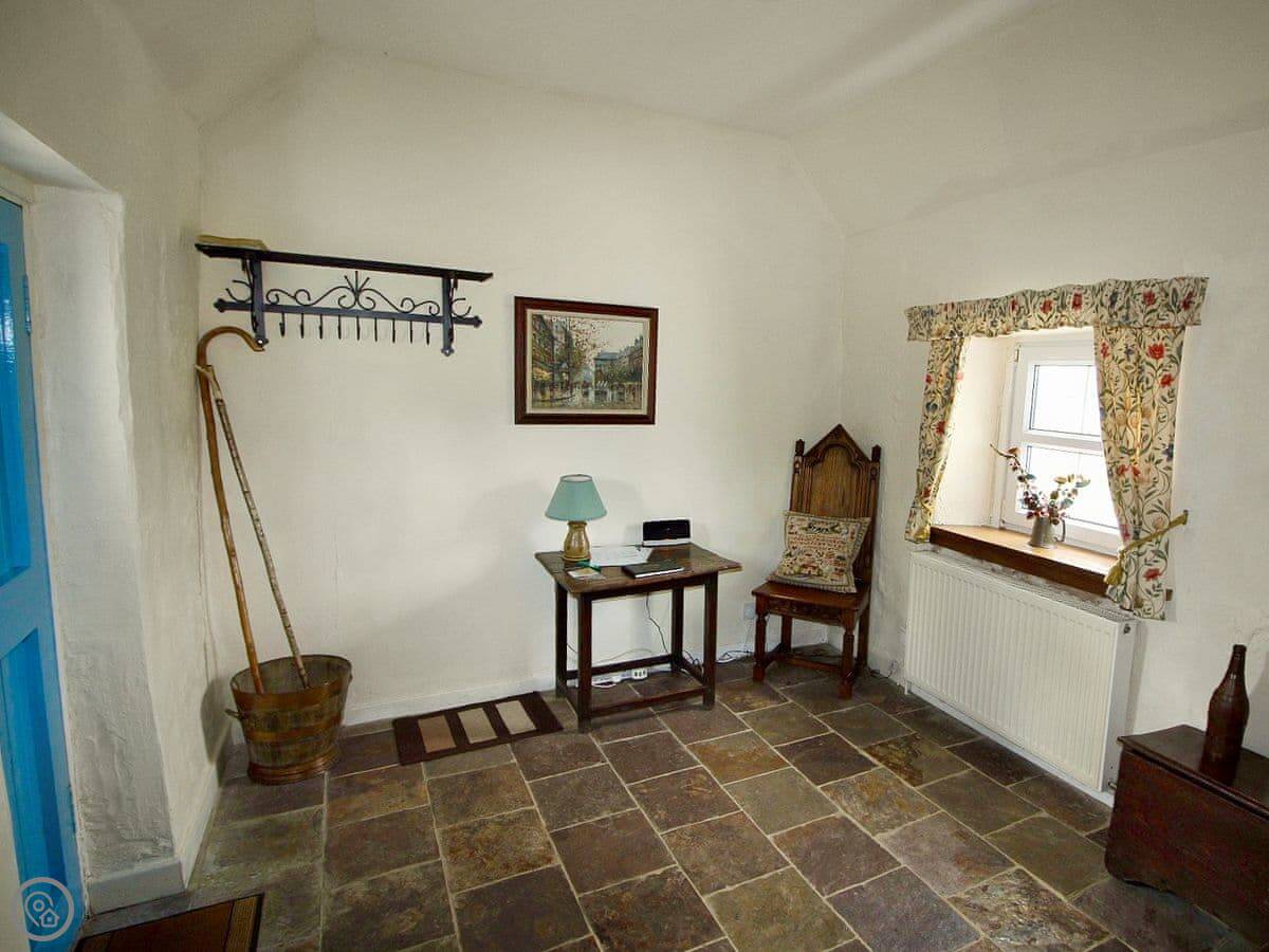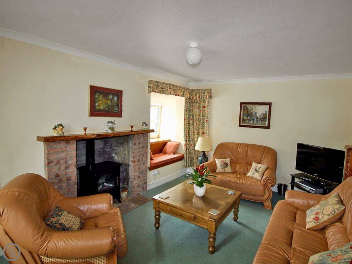 It sleeps four. Two bedrooms, one bathroom. The bathroom has a shower. It's rated 4 Star. It's comfortable and well looked after. There's a wood burner stove in the living room that runs on electricity, so it looks like a real fire but you just switch it on. There's a window seat there too.