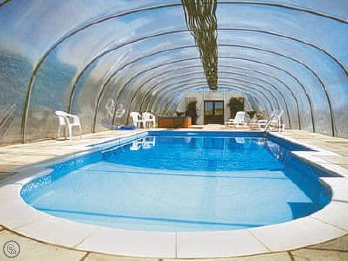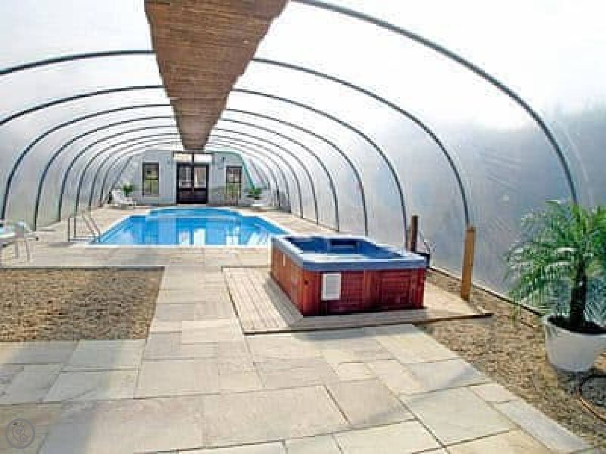 The swimming pool and hot tub are in a covered barn near the main house. You book slots to use them privately.